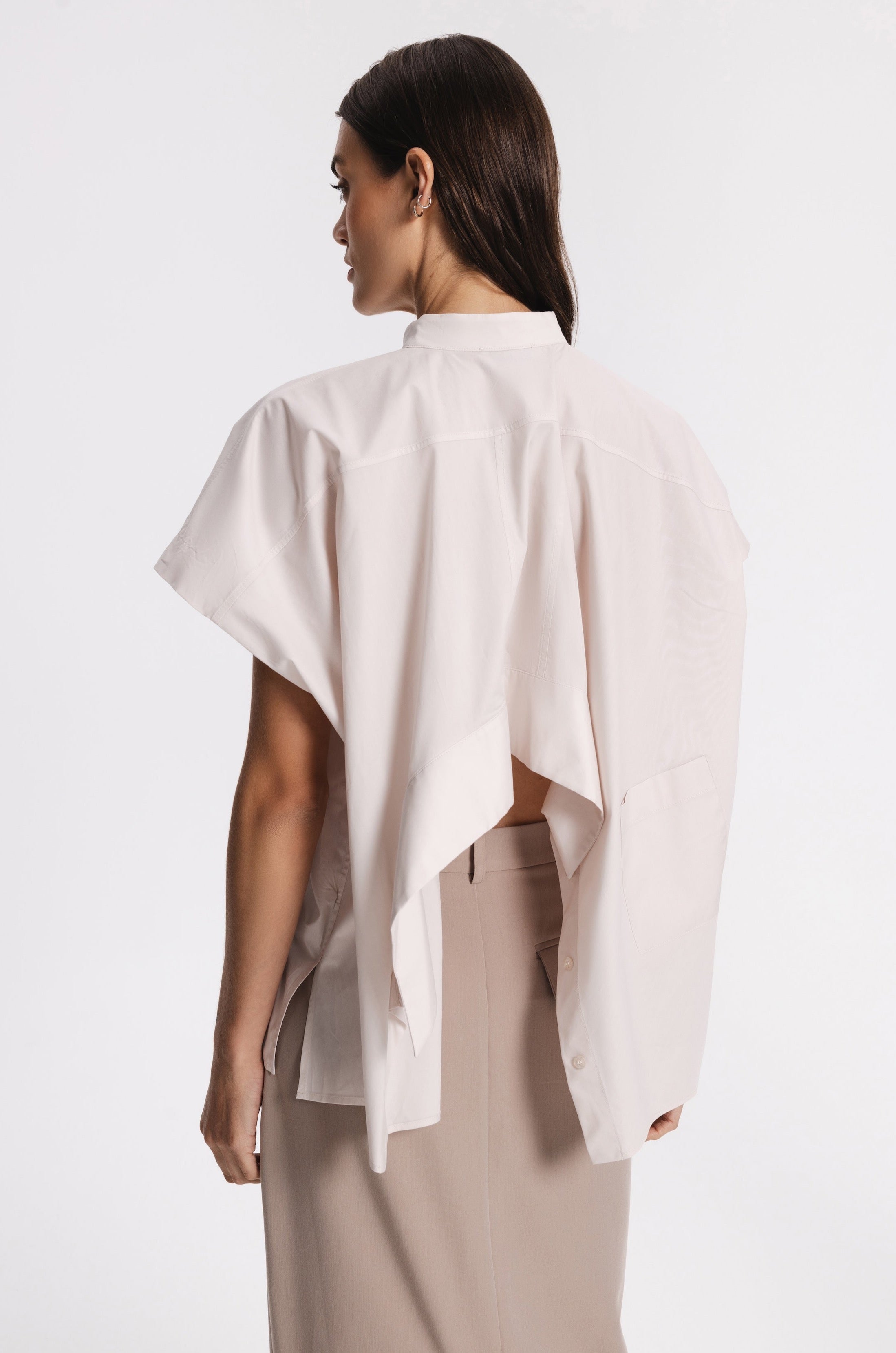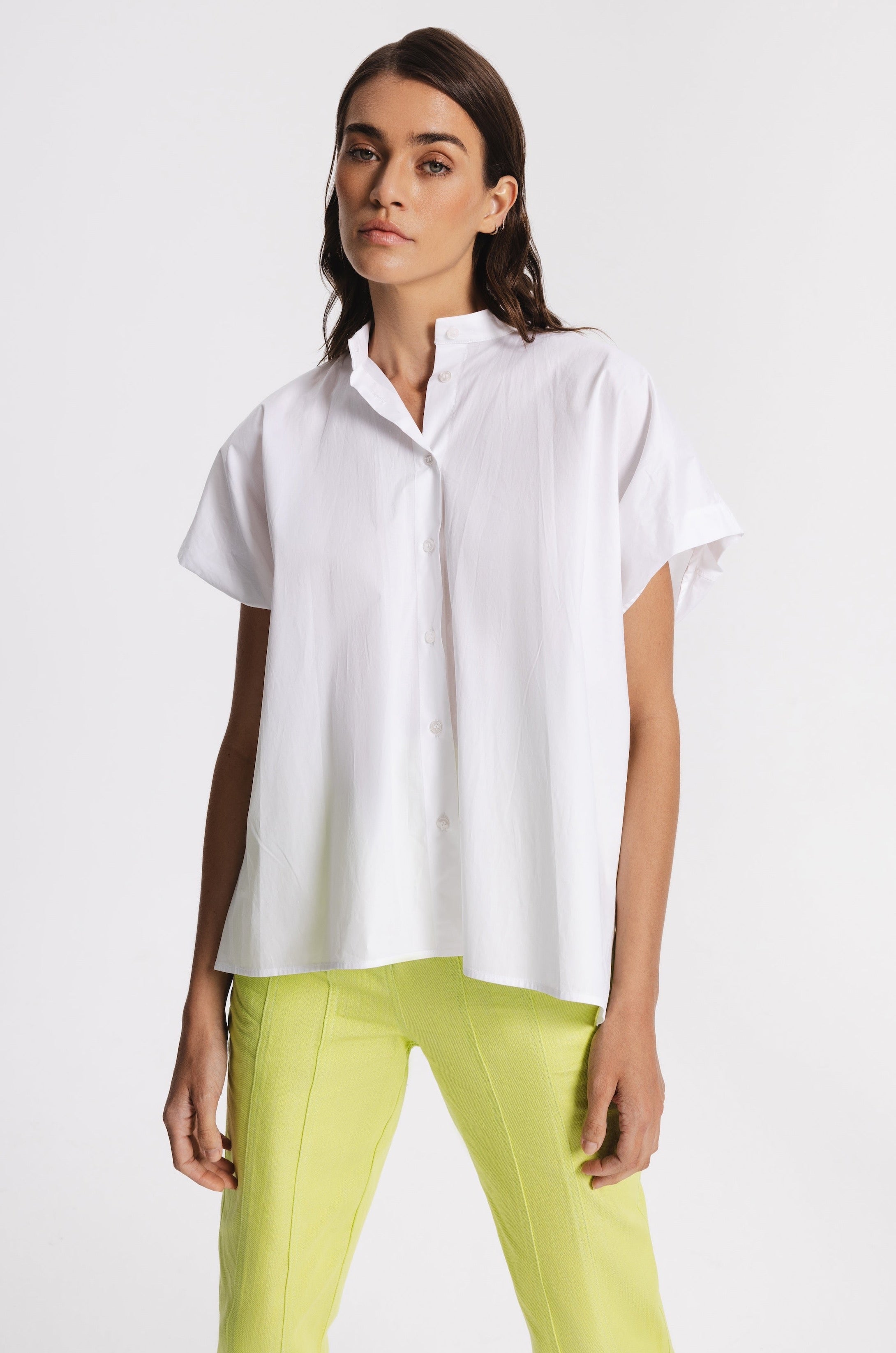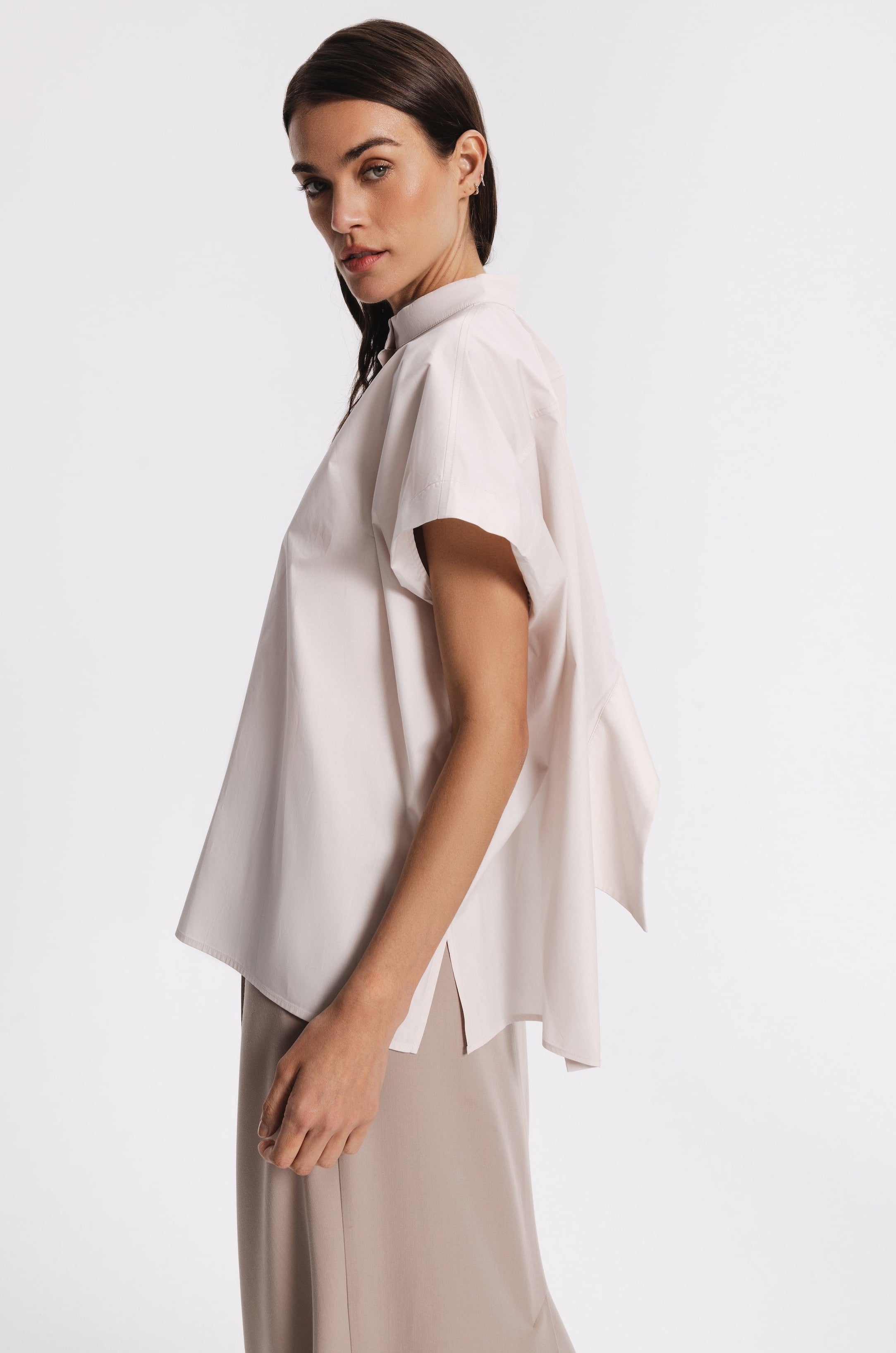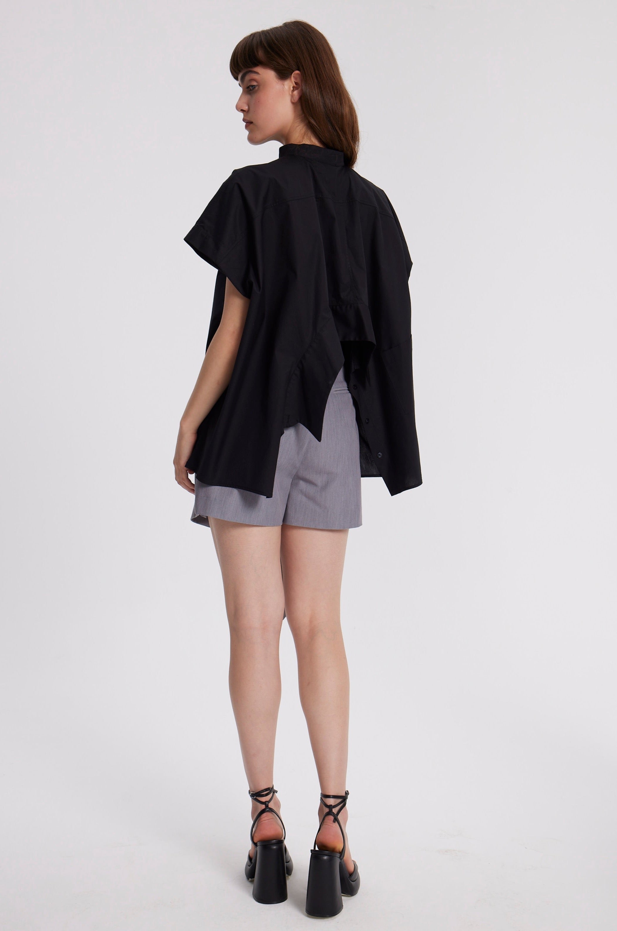 Voluminous short cap sleeve poplin shirt. Korean collar. The particularity of this shirt is the back, which performs U shape cut and has been finished with a decorative collar and buttons on the hem.