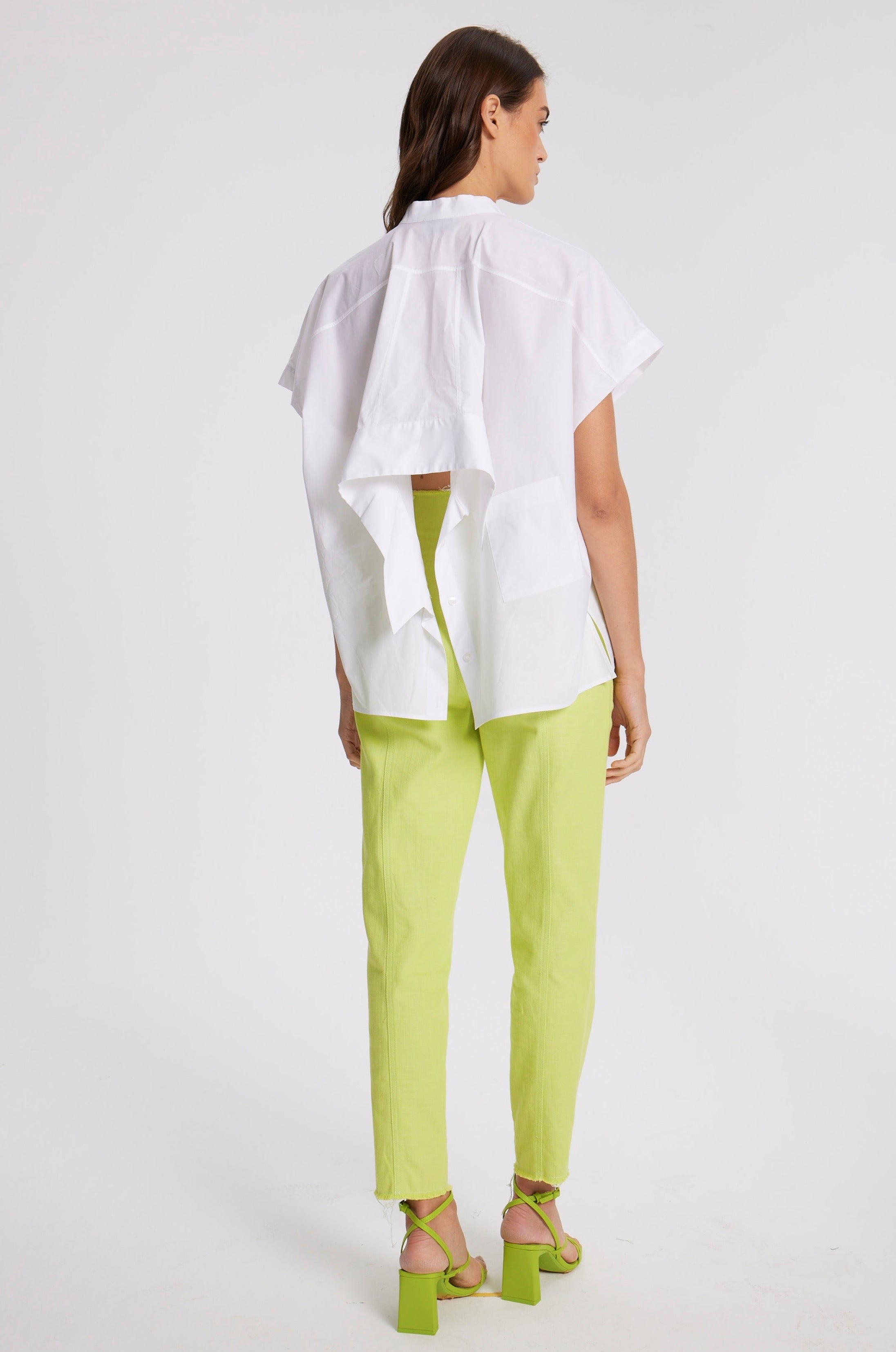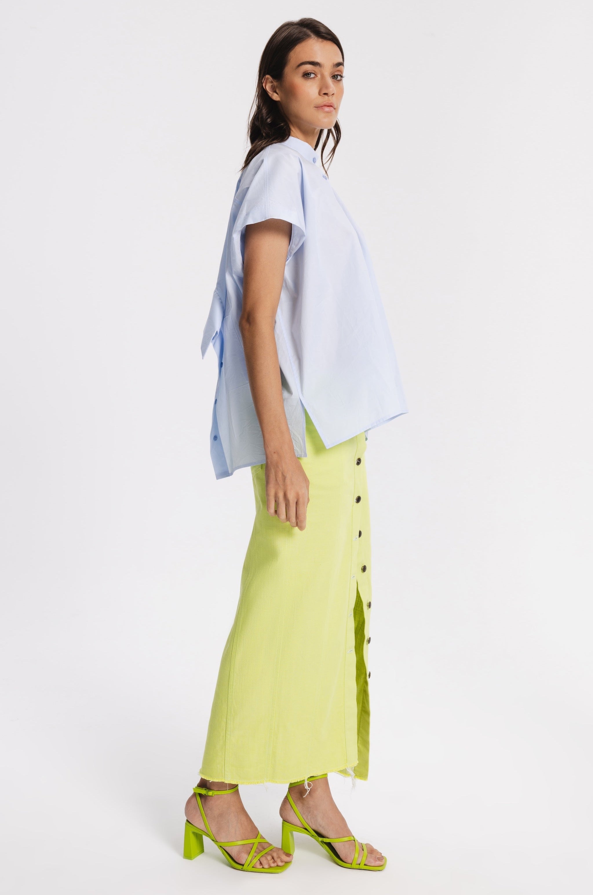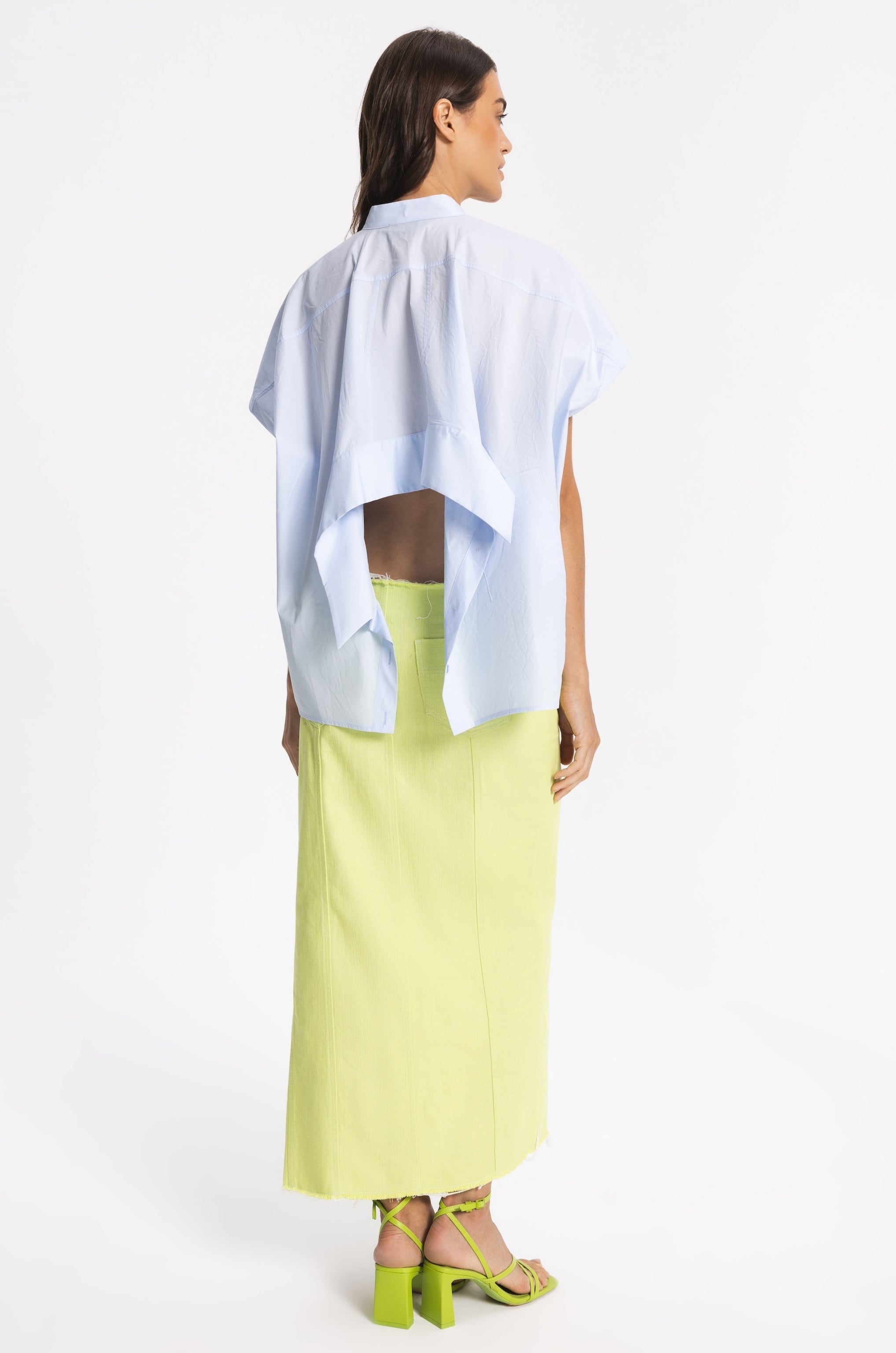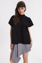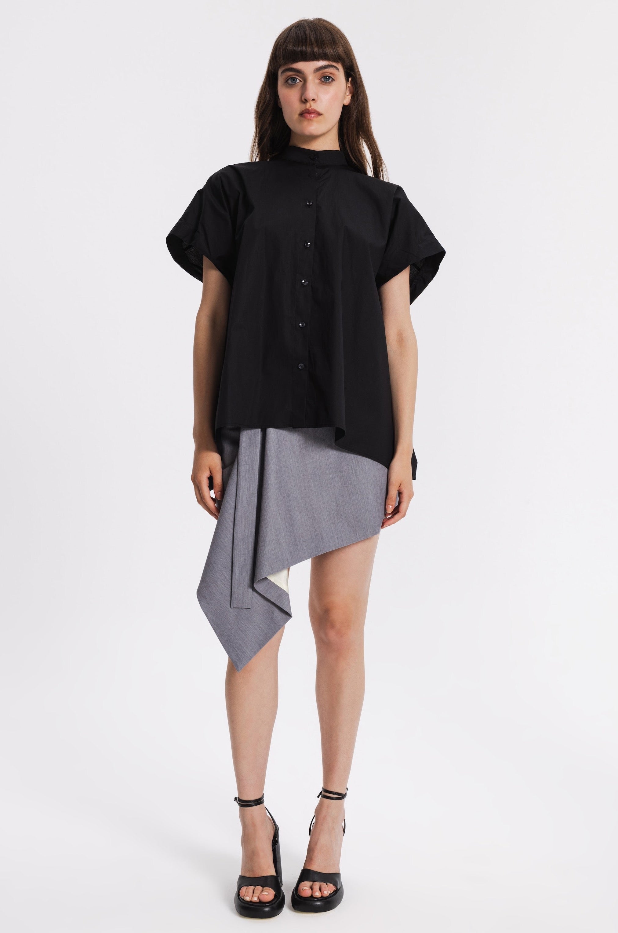 Voluminous short cap sleeve poplin shirt. Korean collar. The particularity of this shirt is the back, which performs U shape cut and has been finished with a decorative collar and buttons on the hem.