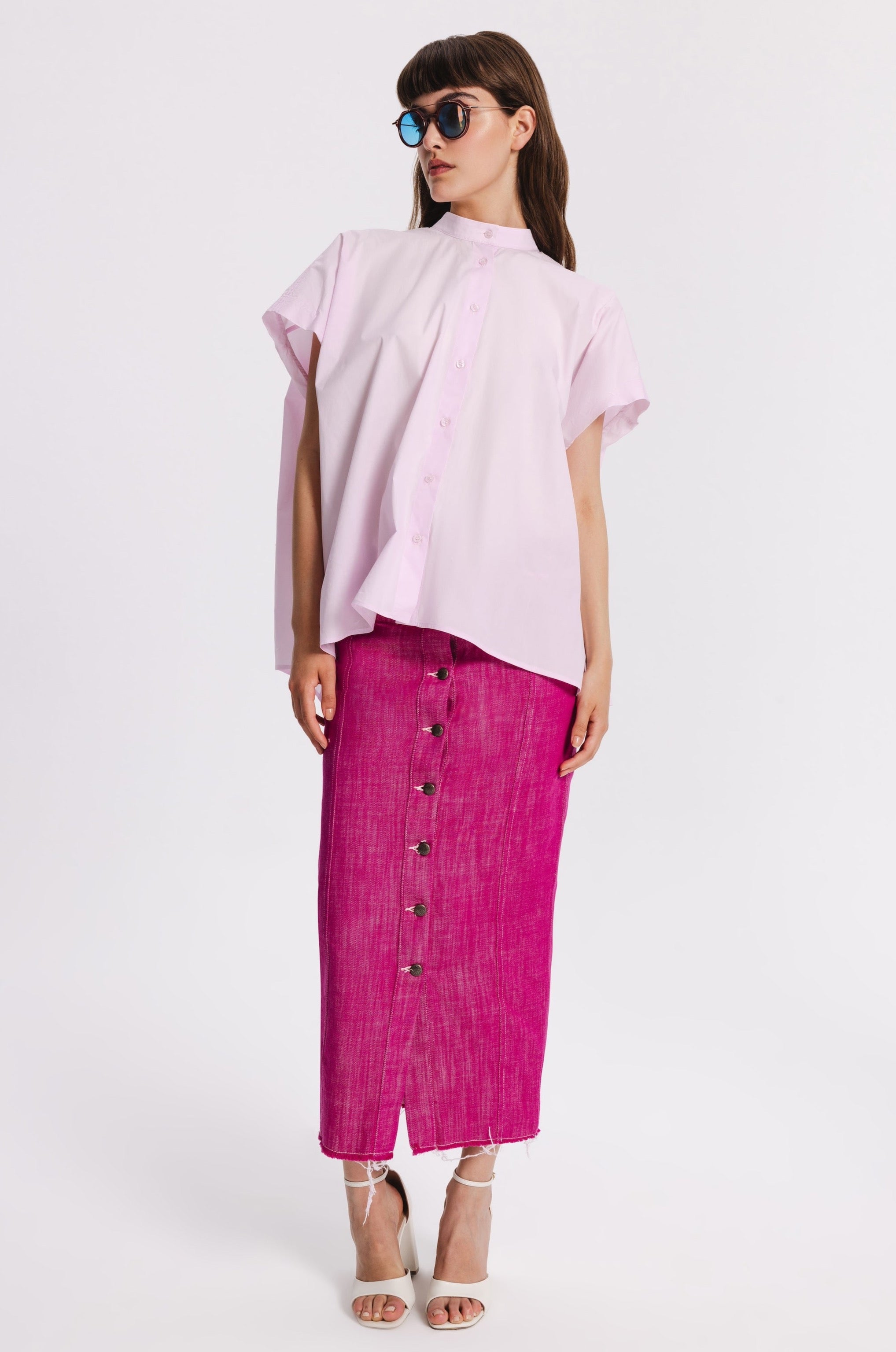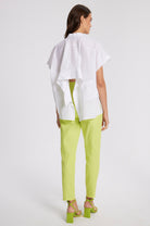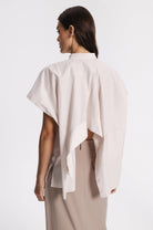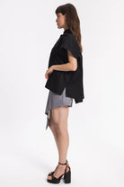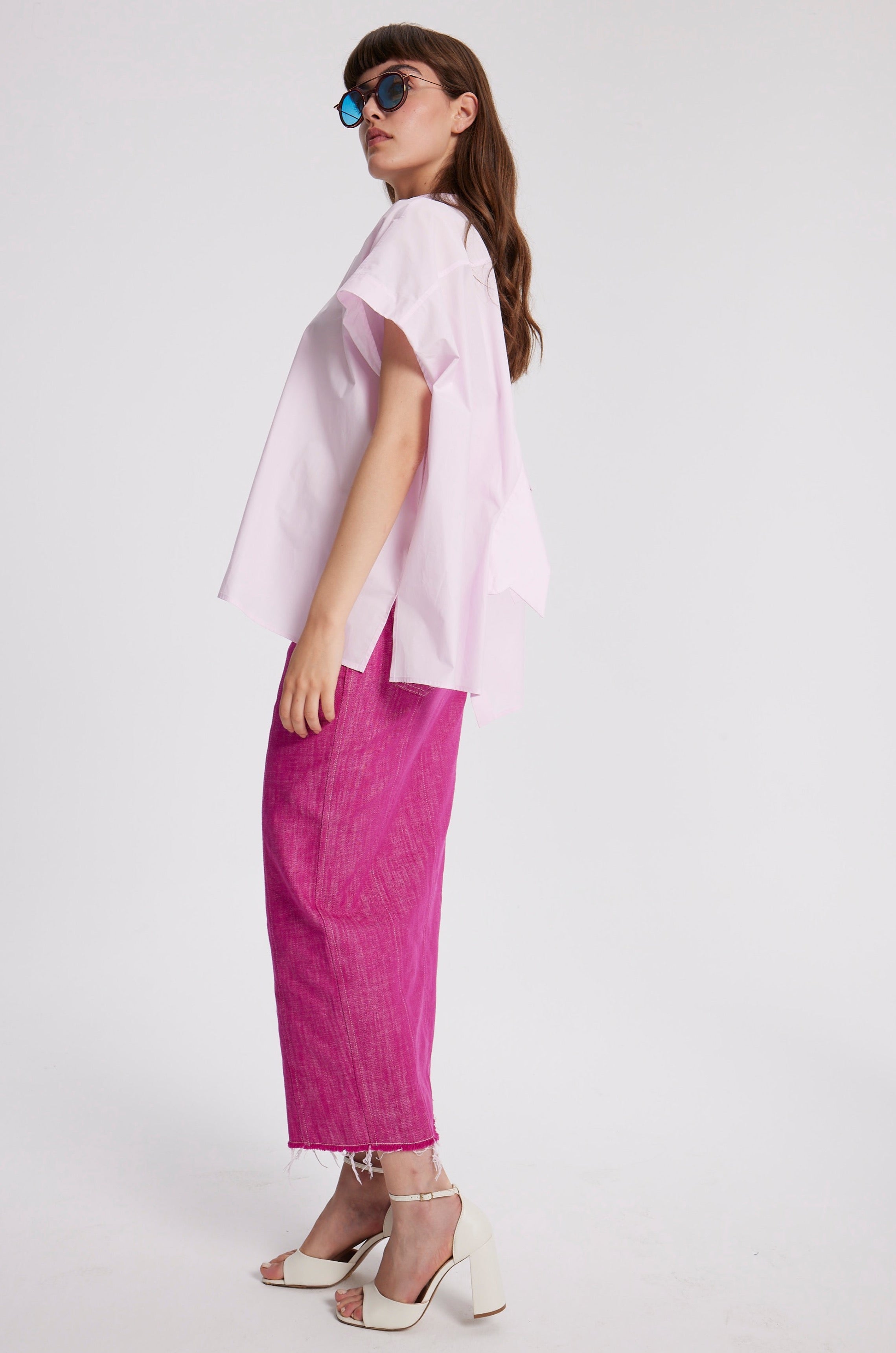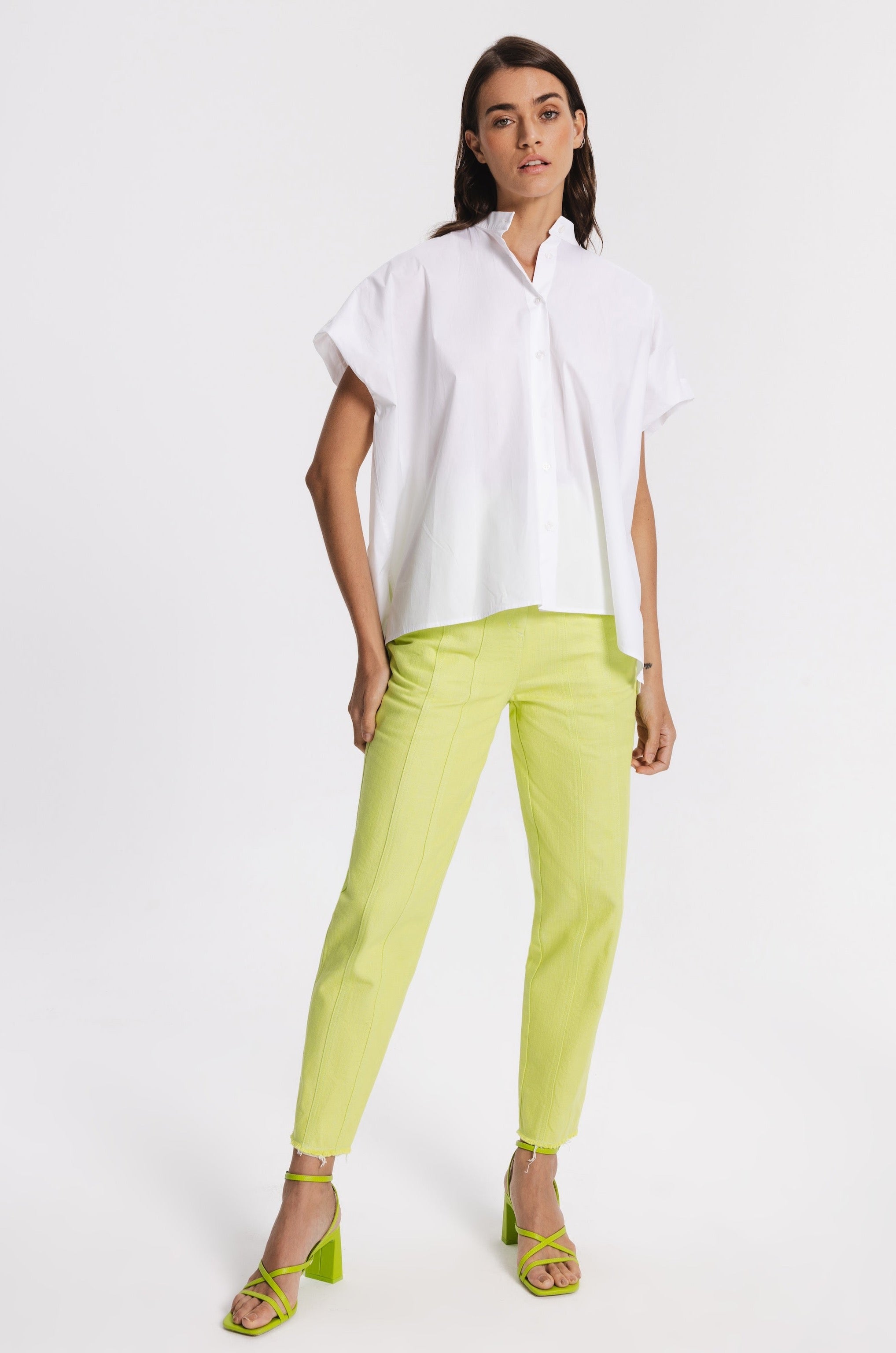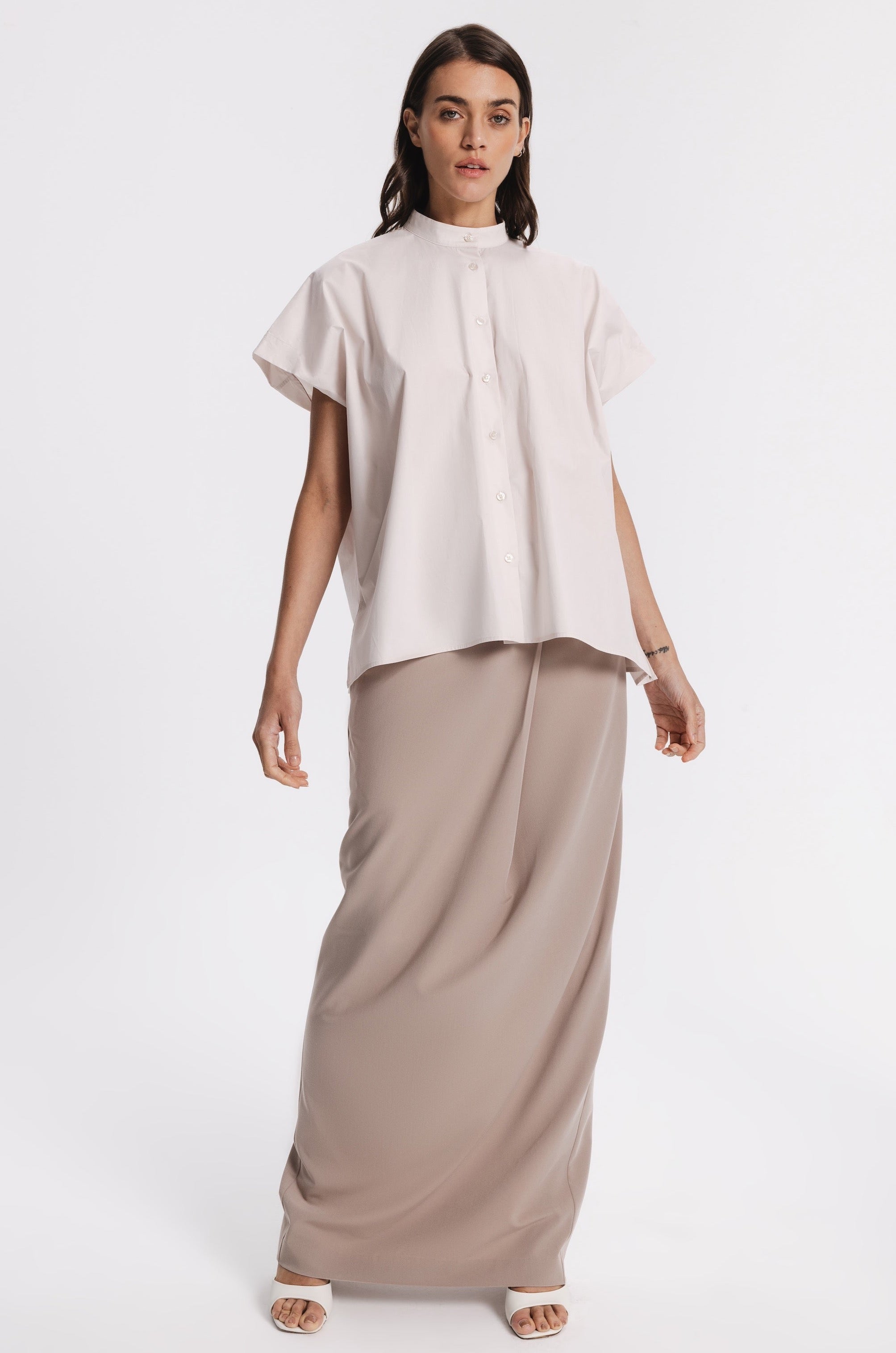 Voluminous short cap sleeve poplin shirt. Korean collar. The particularity of this shirt is the back, which performs U shape cut and has been finished with a decorative collar and buttons on the hem.