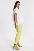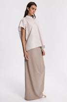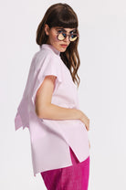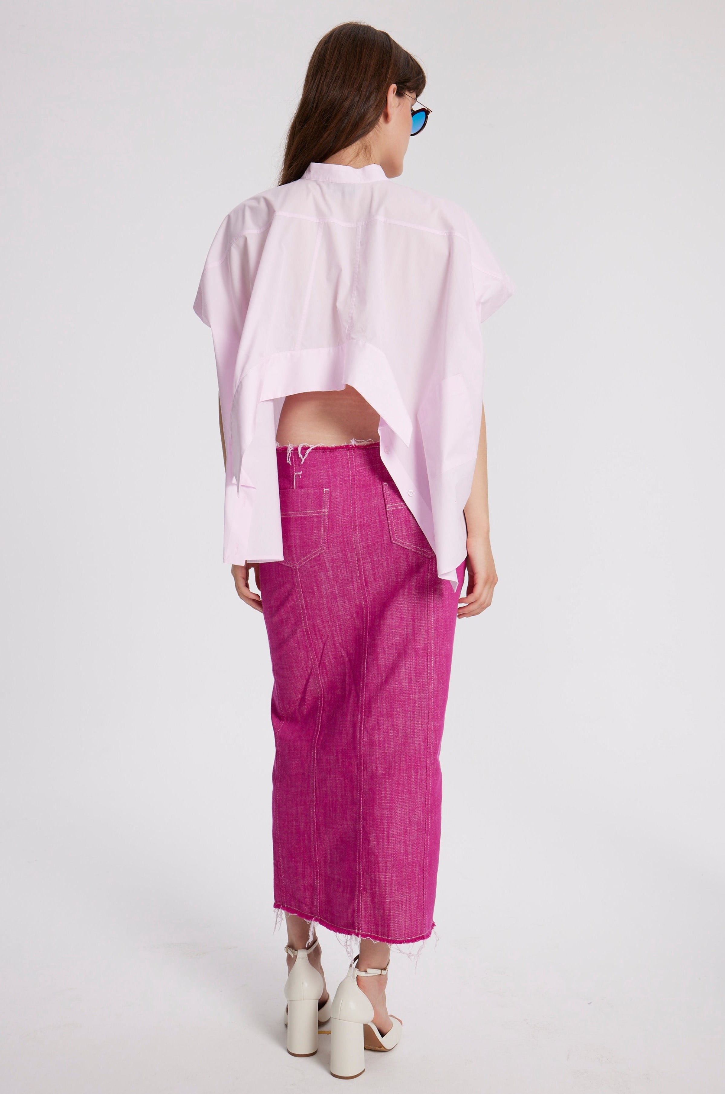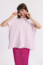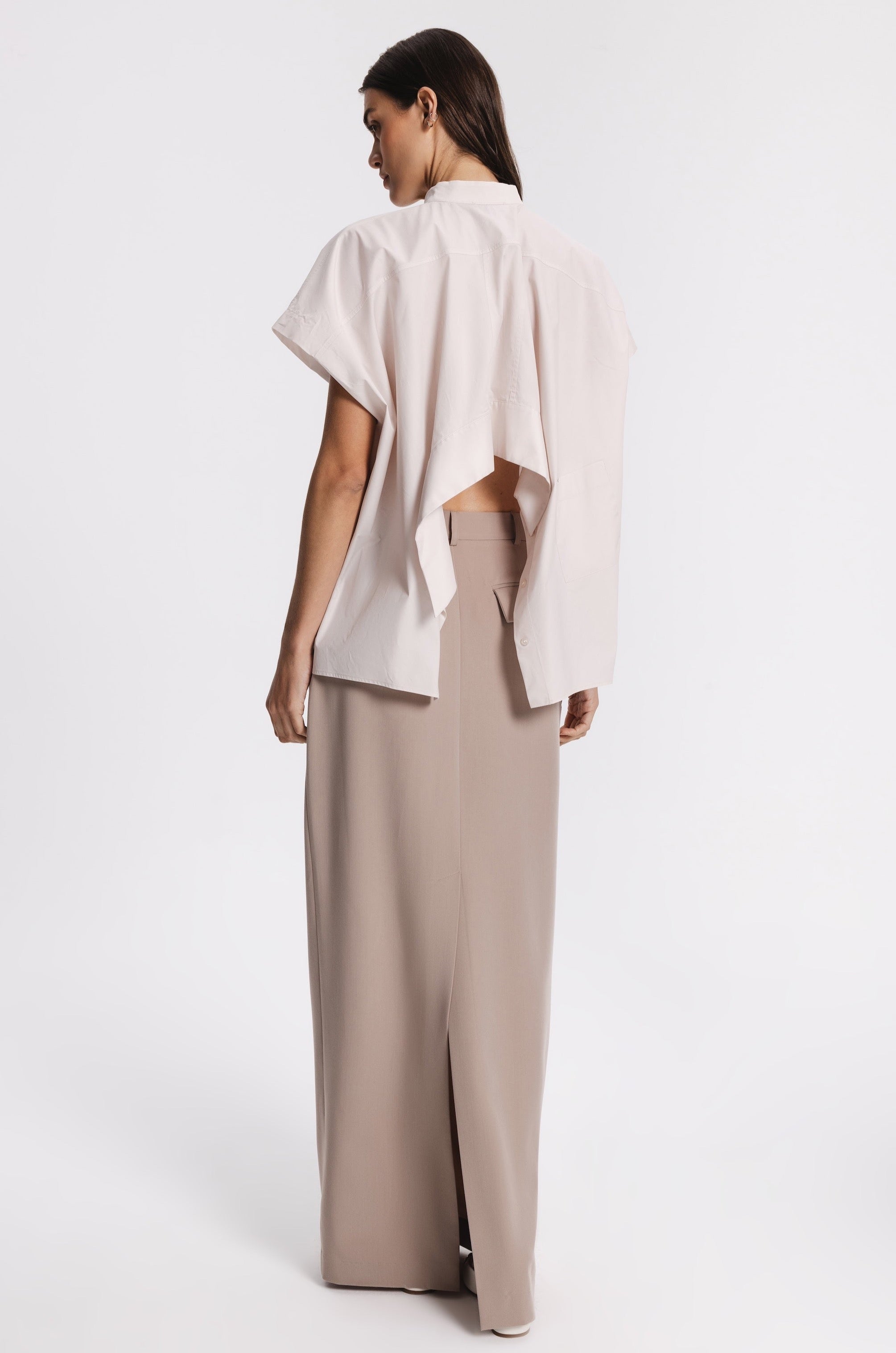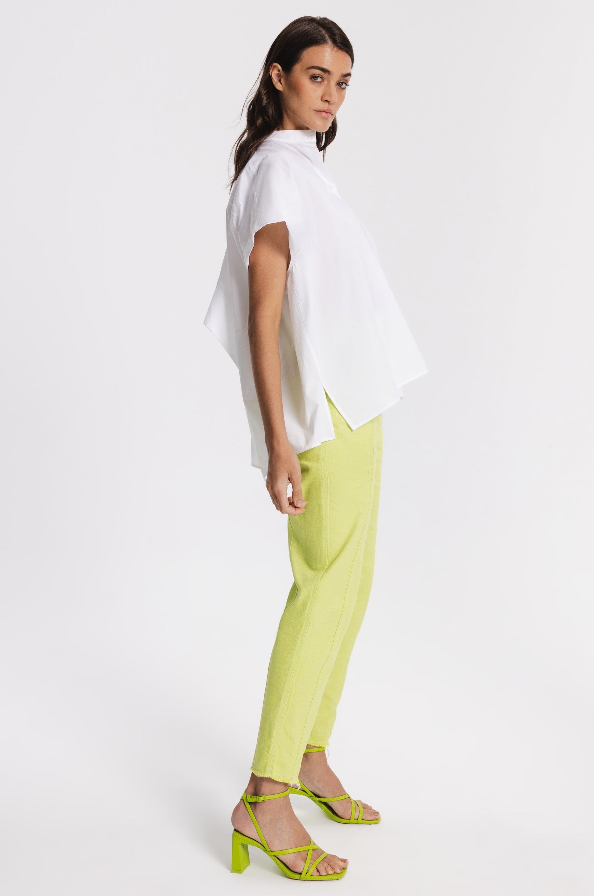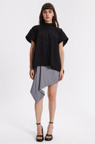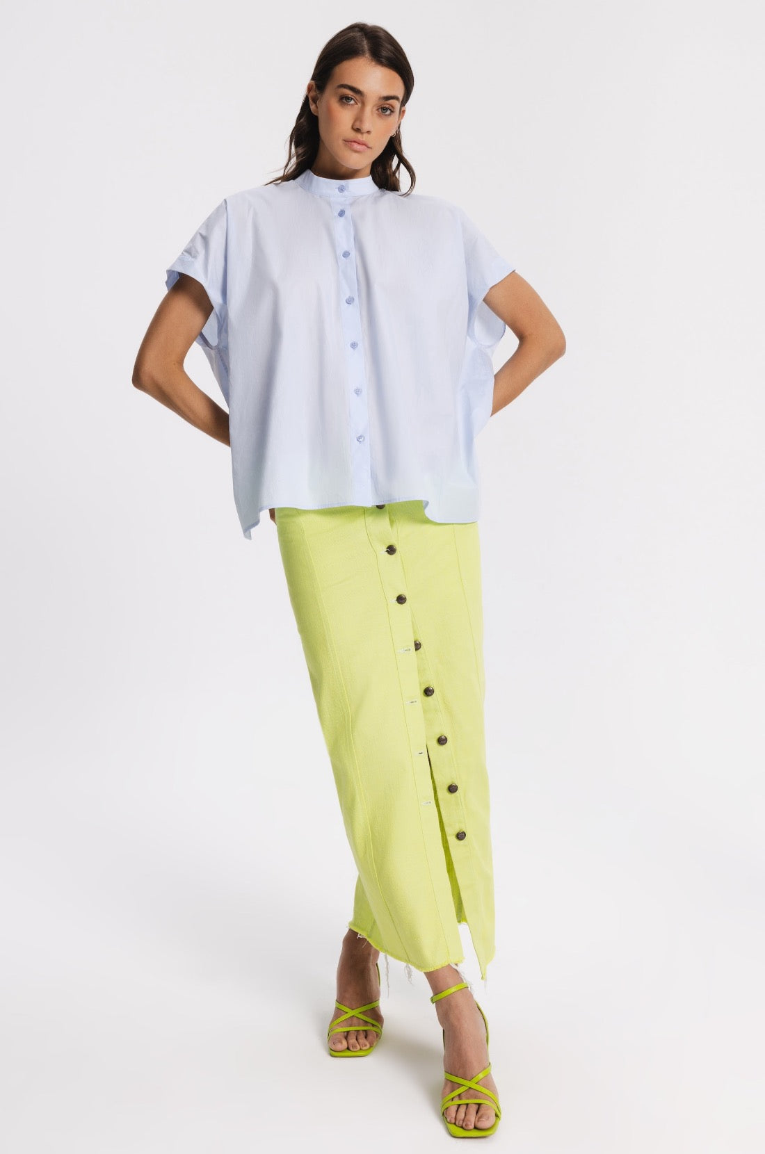 Voluminous short cap sleeve poplin shirt. Korean collar. The particularity of this shirt is the back, which performs U shape cut and has been finished with a decorative collar and buttons on the hem.