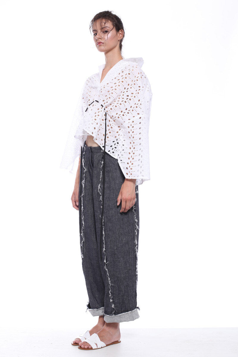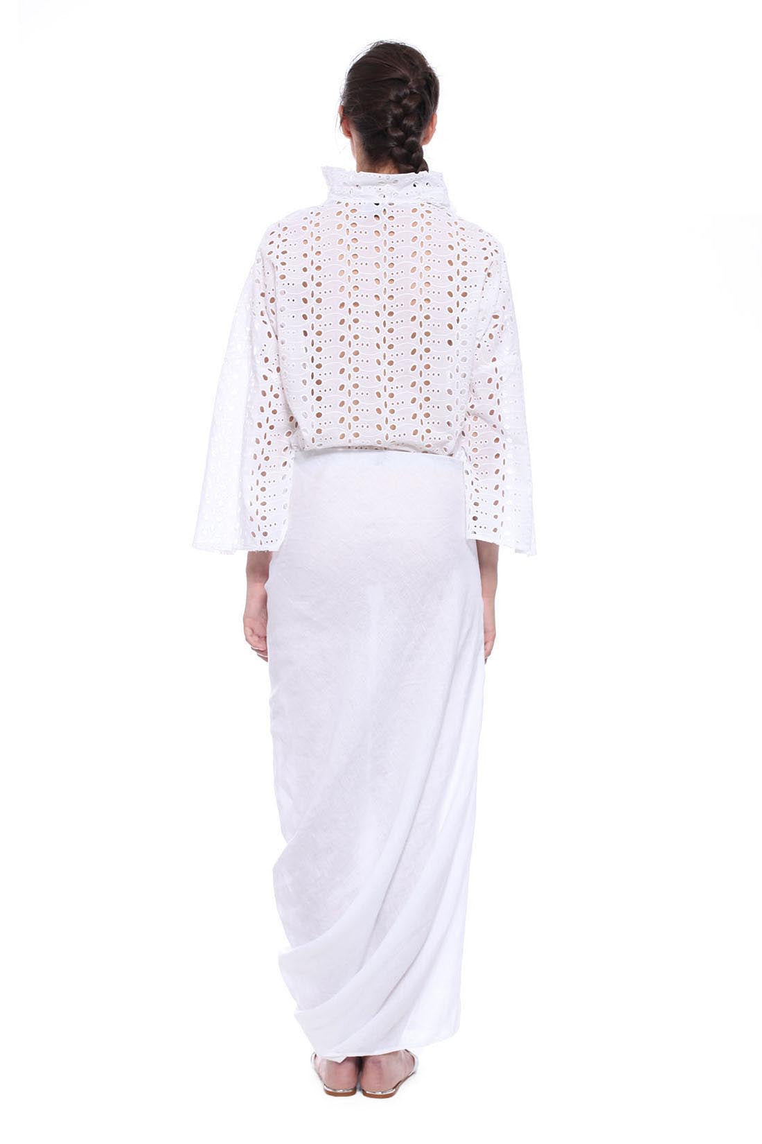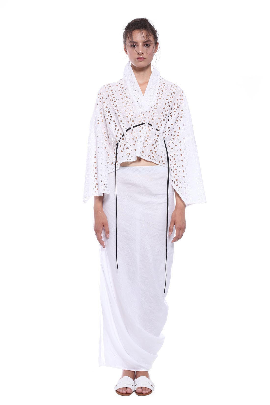 KIMONO-CUT TOP IN SANGALLO COTTON LACE FOR HOTEST SUMMER DAYS. HALF OPENING WITHOUT BUTTONS, WIDTH ADJUSTABLE WITH THE ROPE. THREE-QUARTERS SLEEVES.