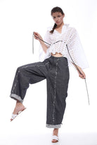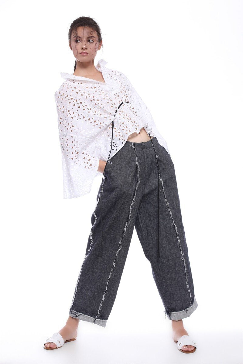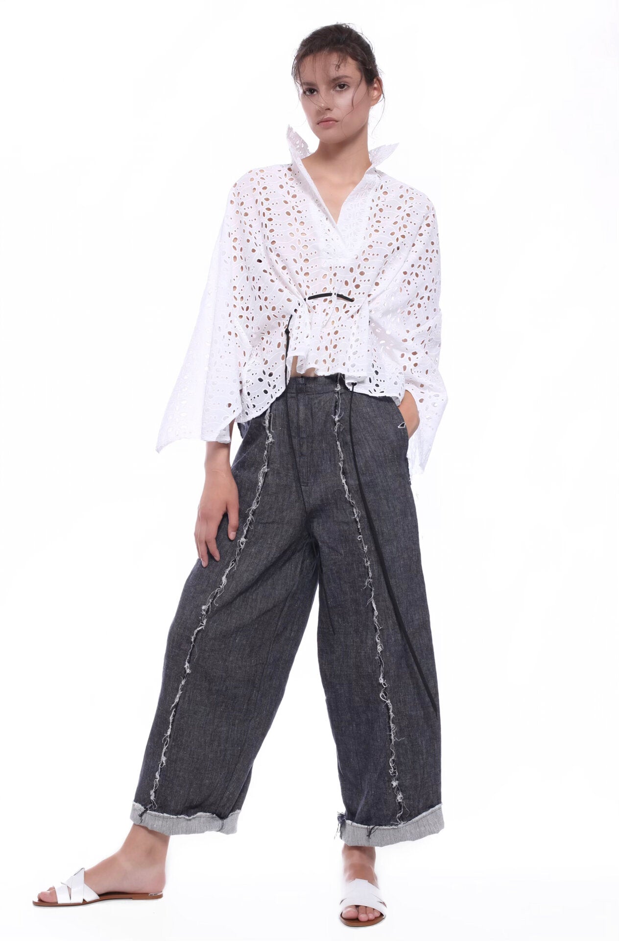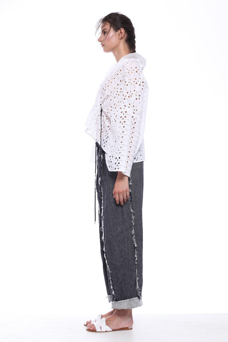 KIMONO-CUT TOP IN SANGALLO COTTON LACE FOR HOTEST SUMMER DAYS. HALF OPENING WITHOUT BUTTONS, WIDTH ADJUSTABLE WITH THE ROPE. THREE-QUARTERS SLEEVES.