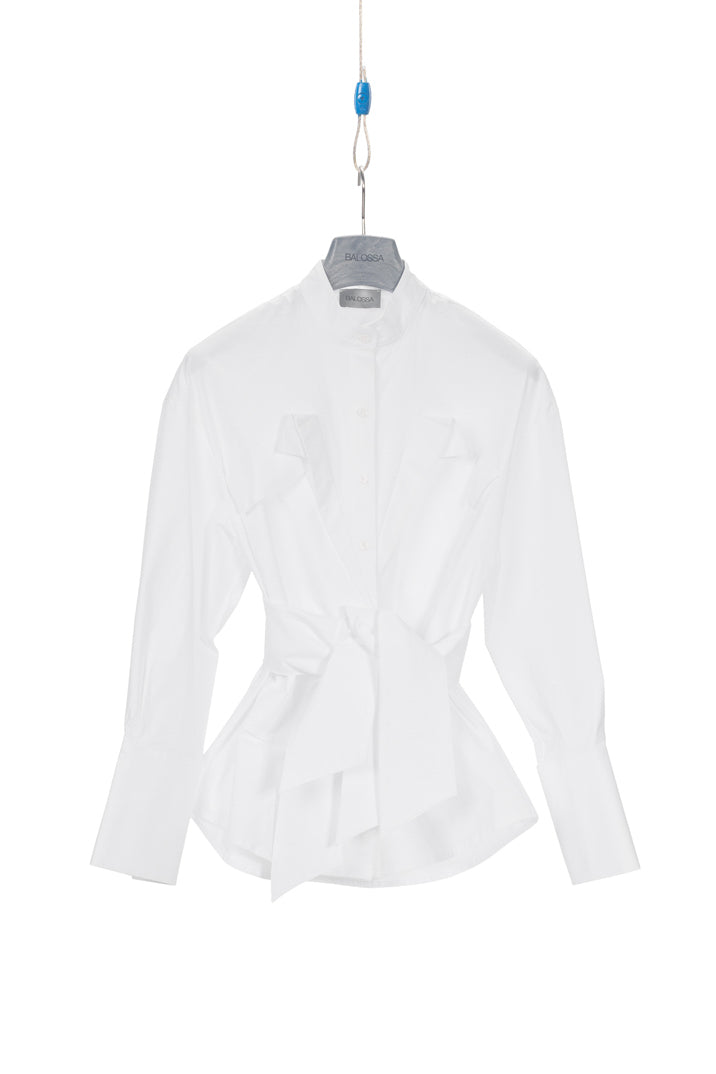 Long sleeve strech cotton poplin shirt with double belt, tied on the front