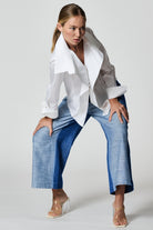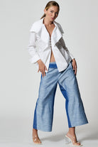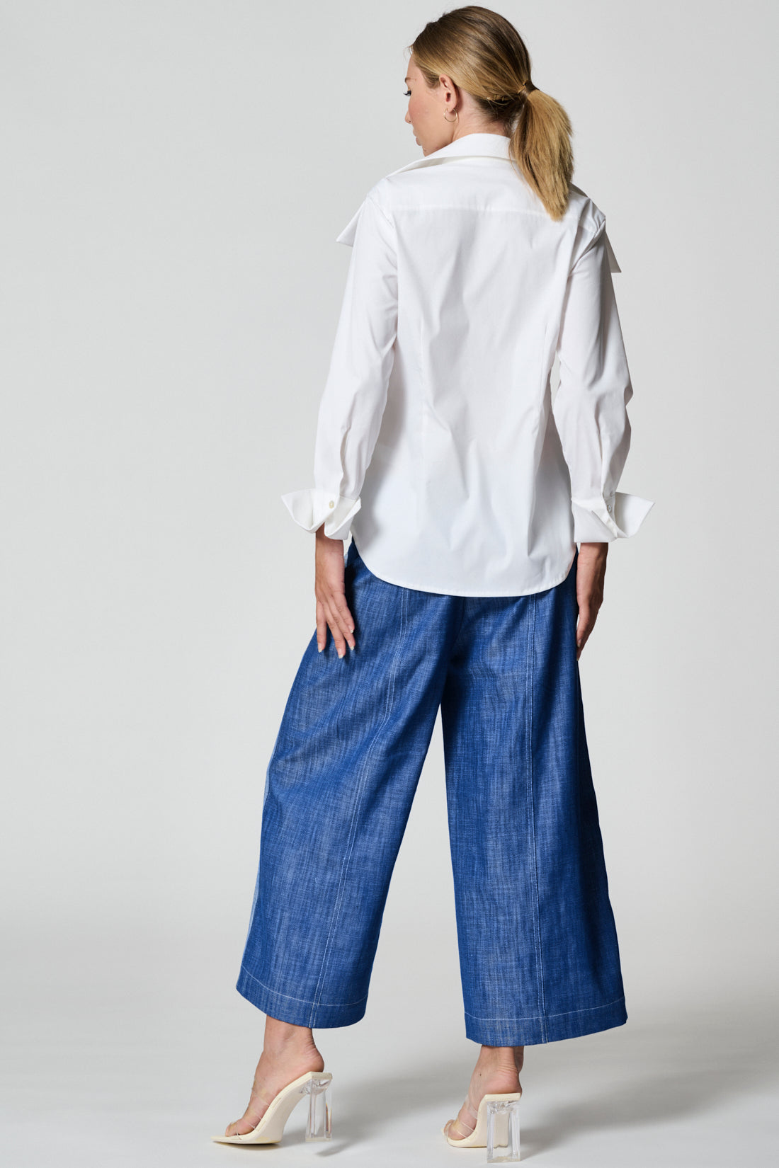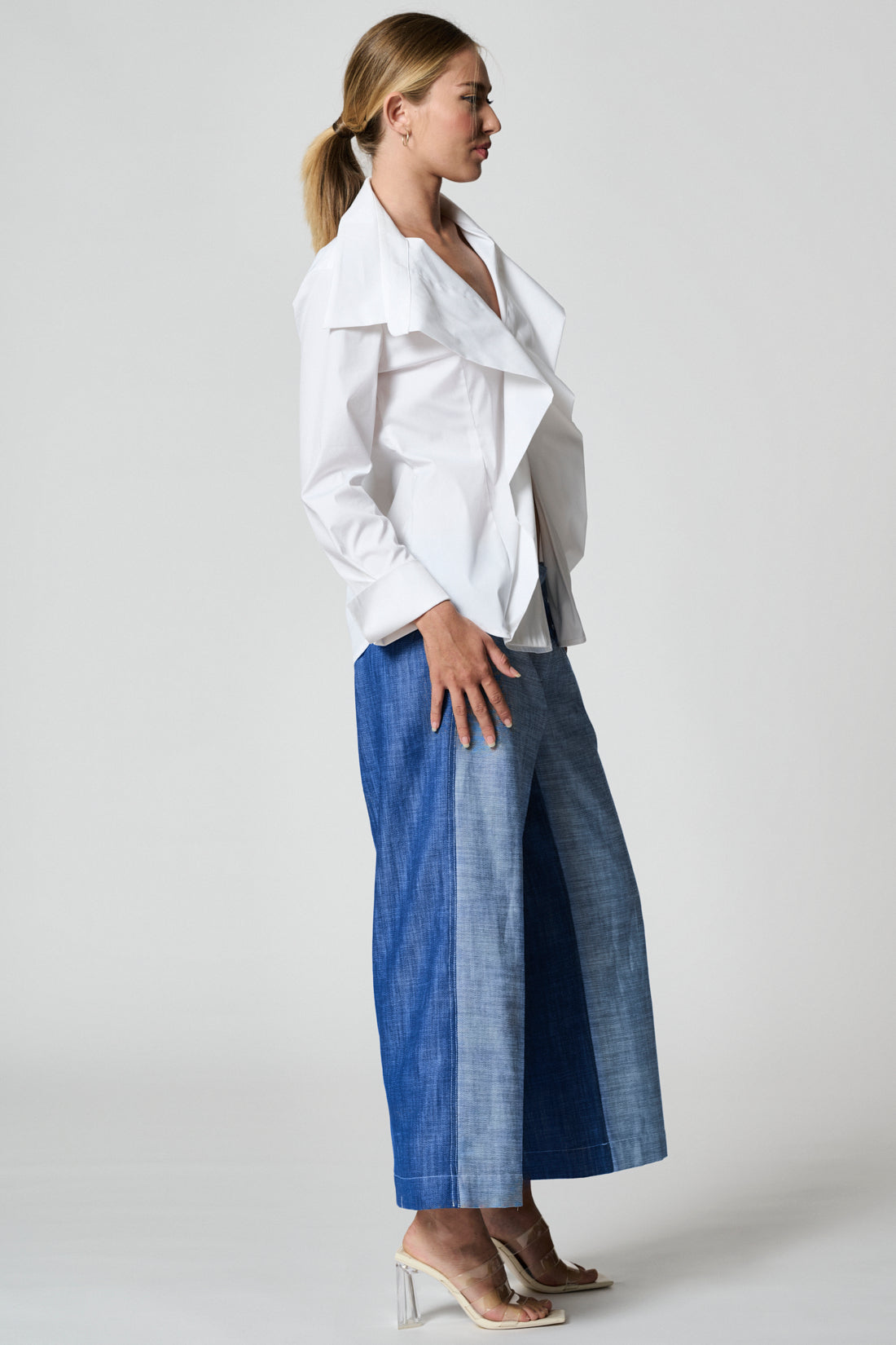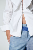 Elegant shirt with a shawl collar. Folded sides closure with hooks. Deep décolleté and semi-open lower part.