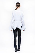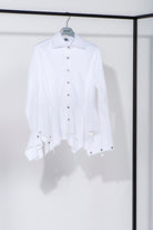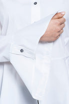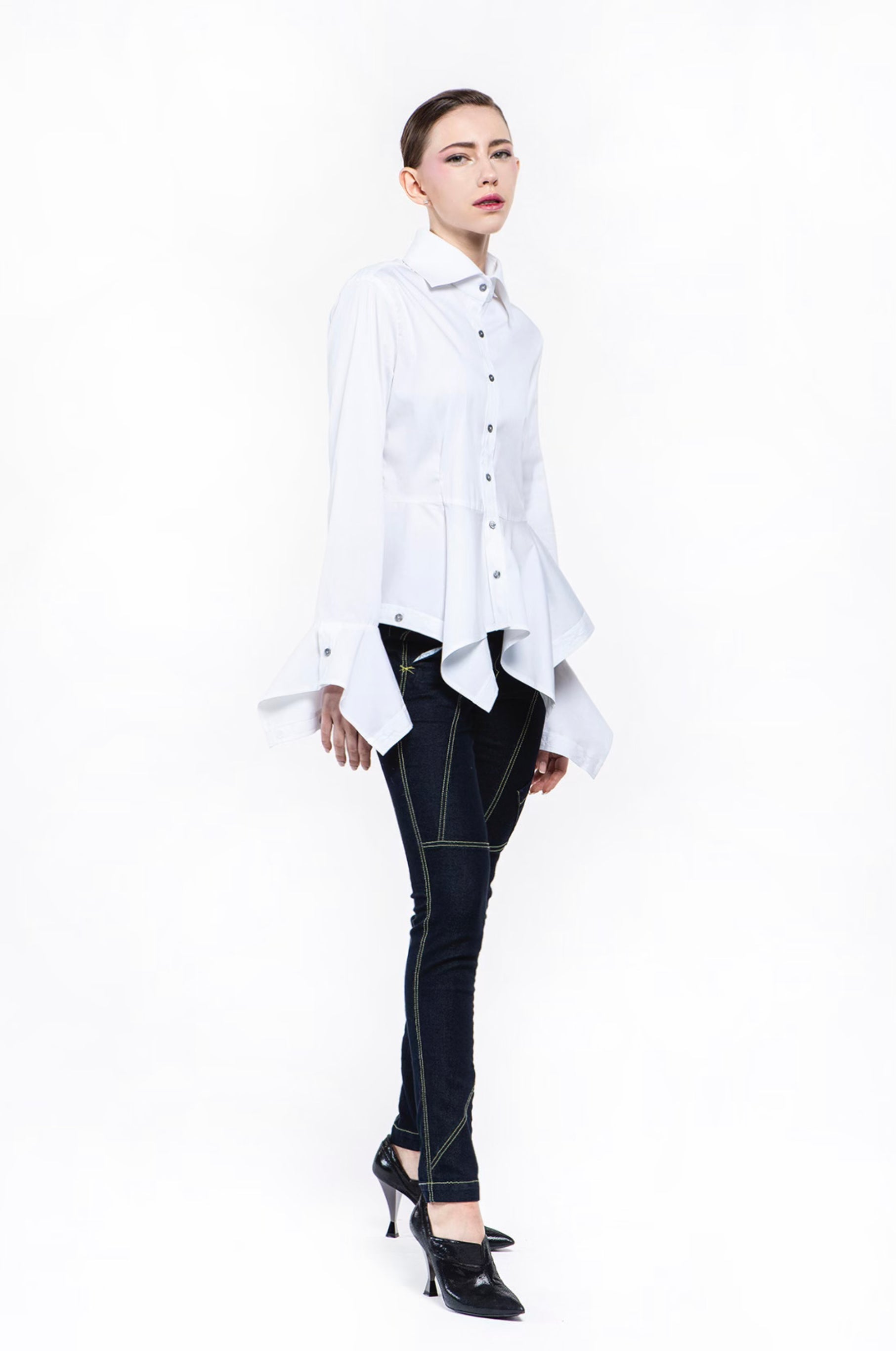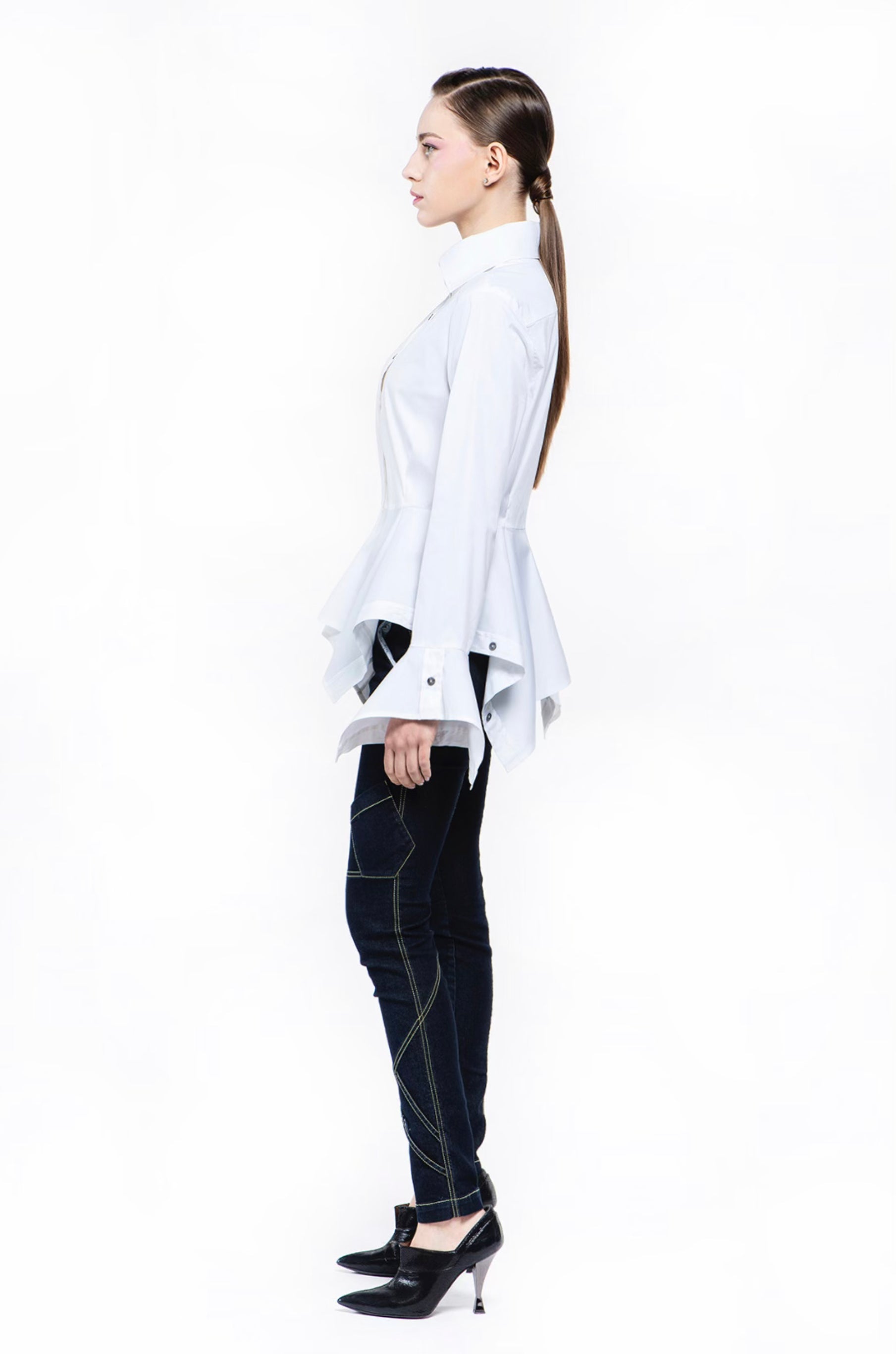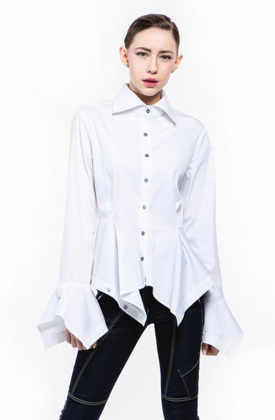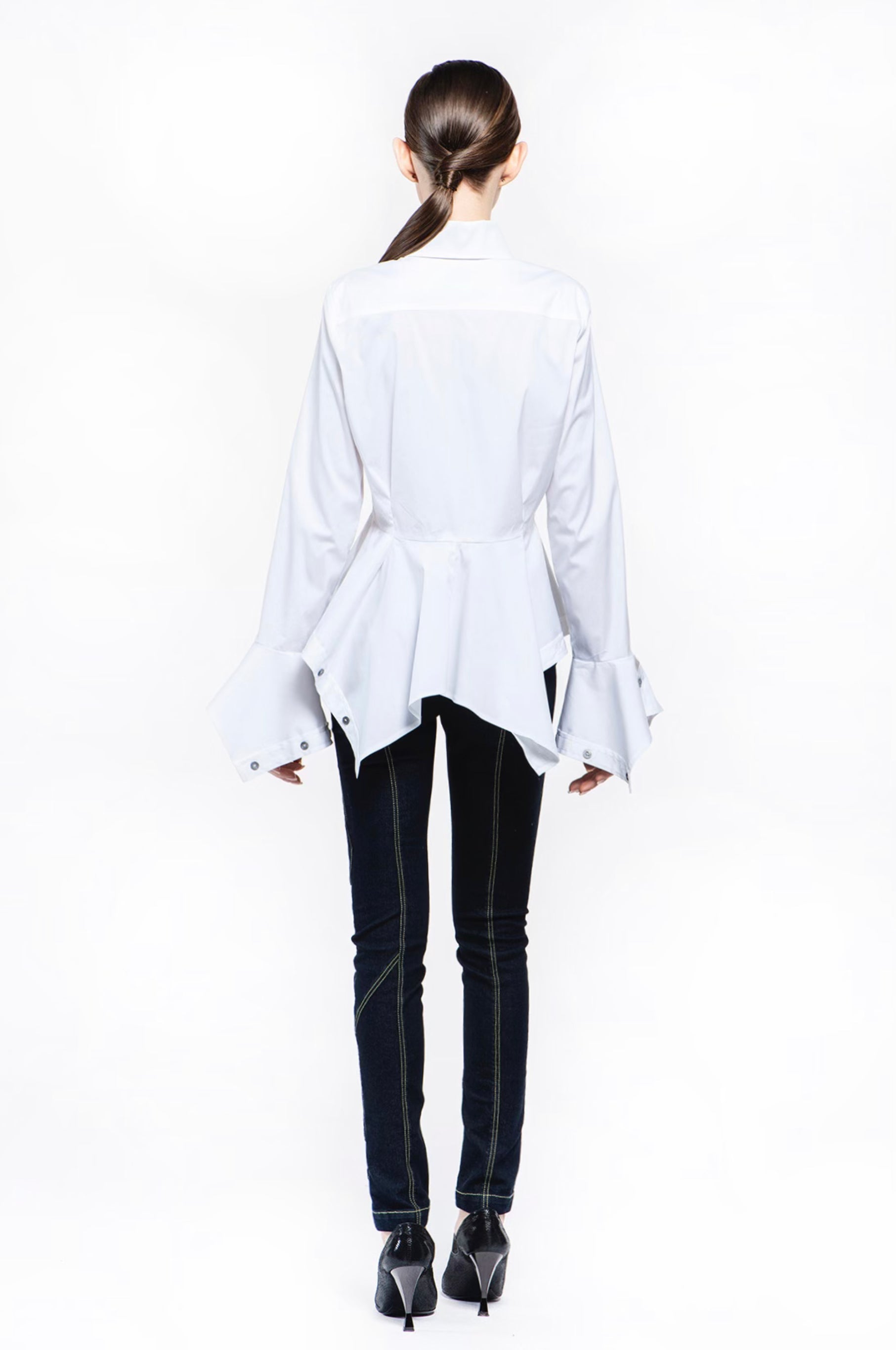 Cotton shirt with a touch of stretch for a slim fit, features big flared cuffs, the shirt is flared at the waist.