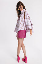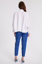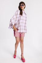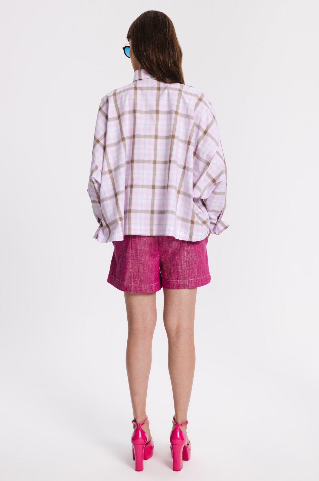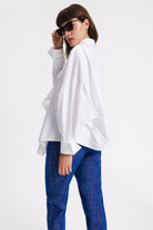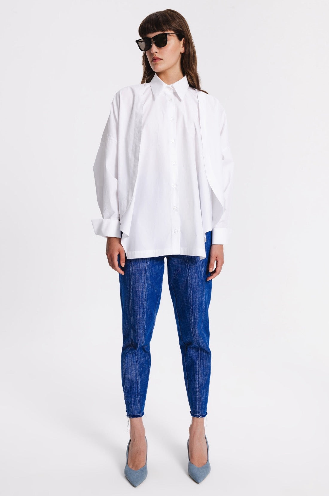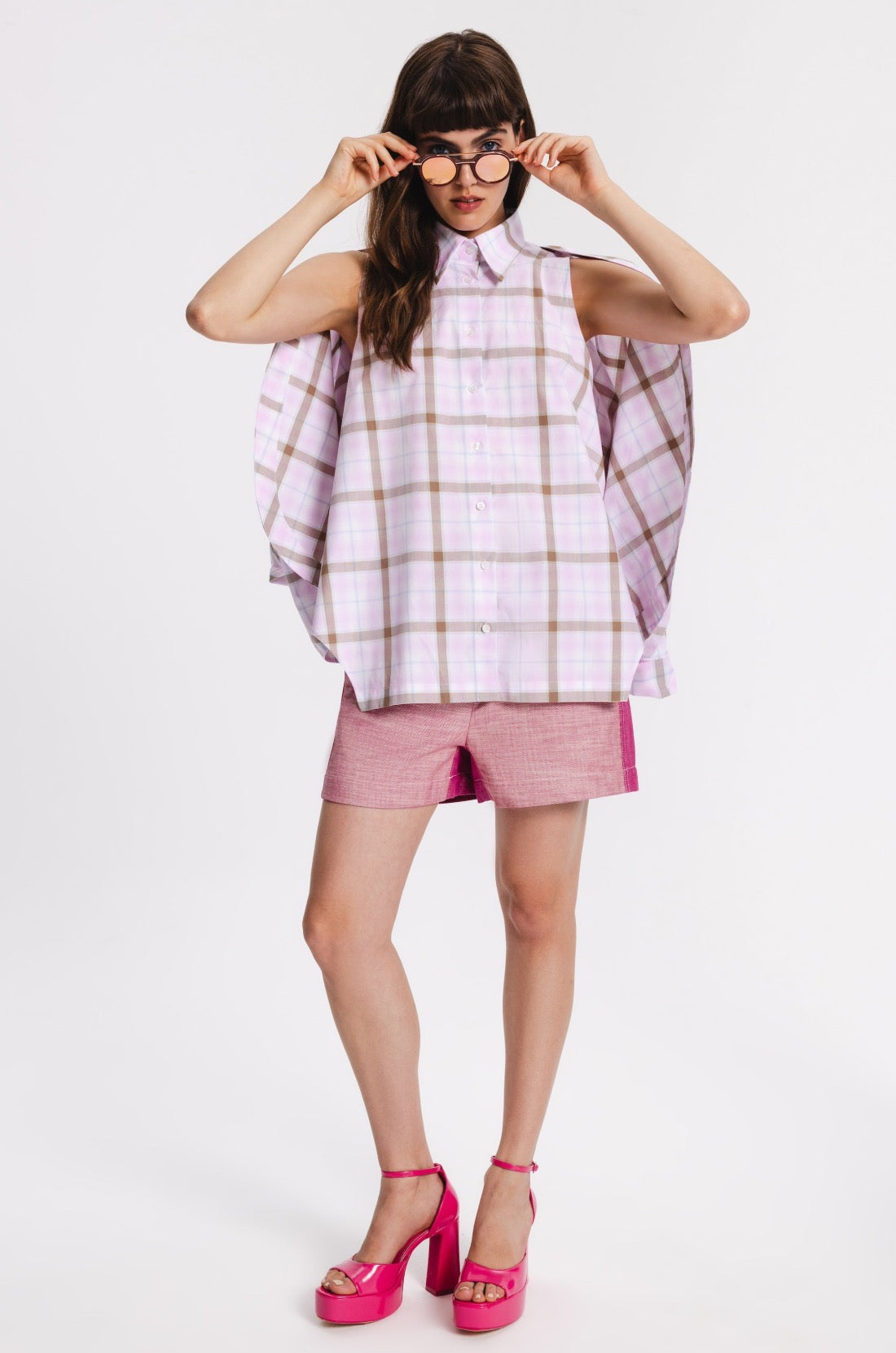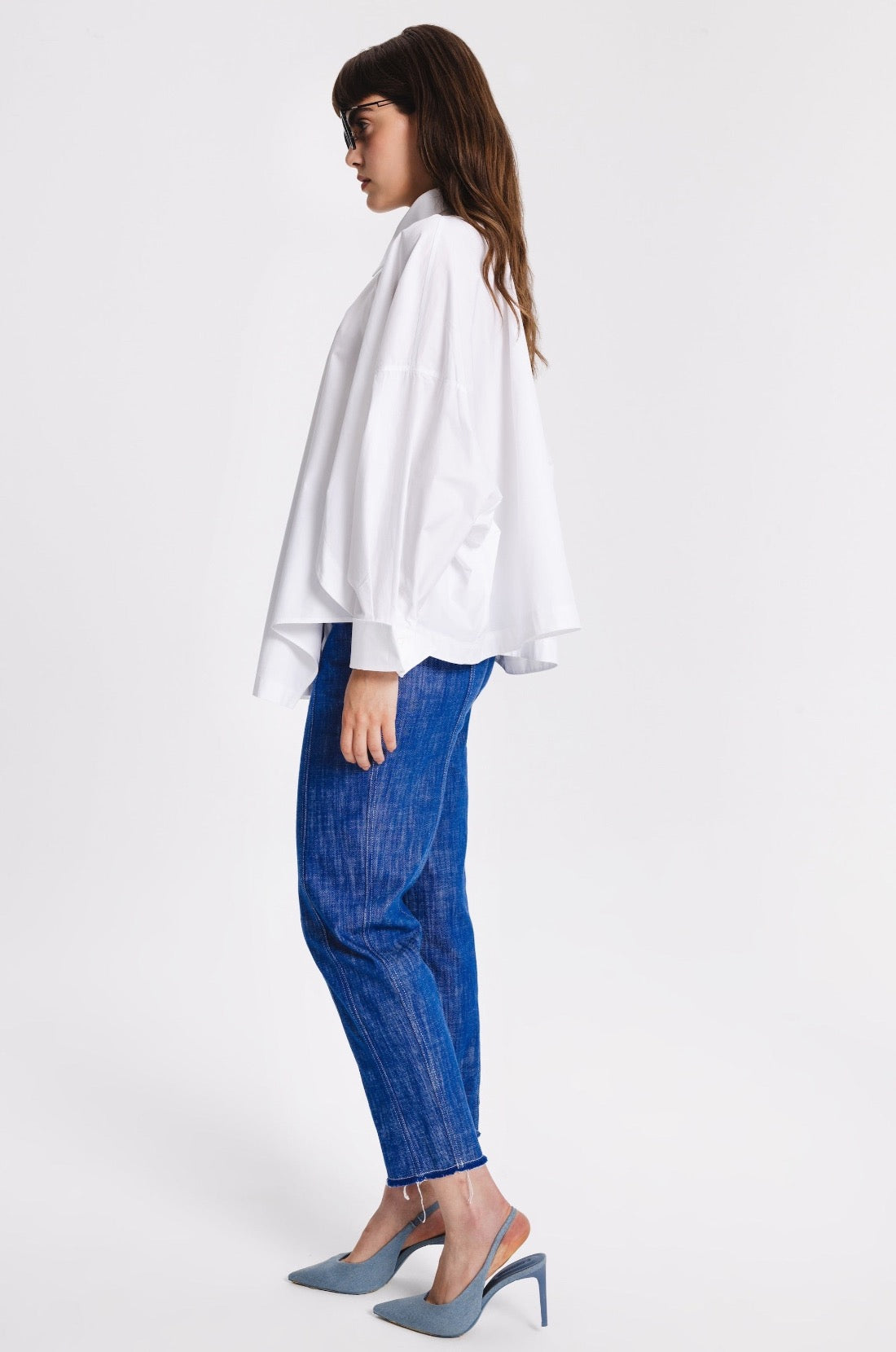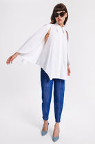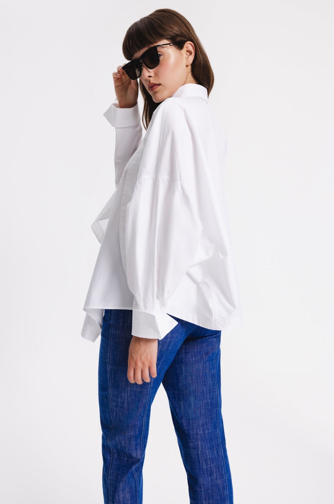 A - shape shirt with an integrated same length cape. Regular sharp collar. Back hem is rounded, front hem is squared.