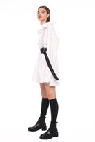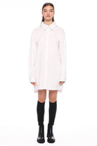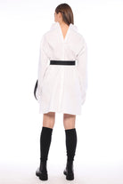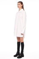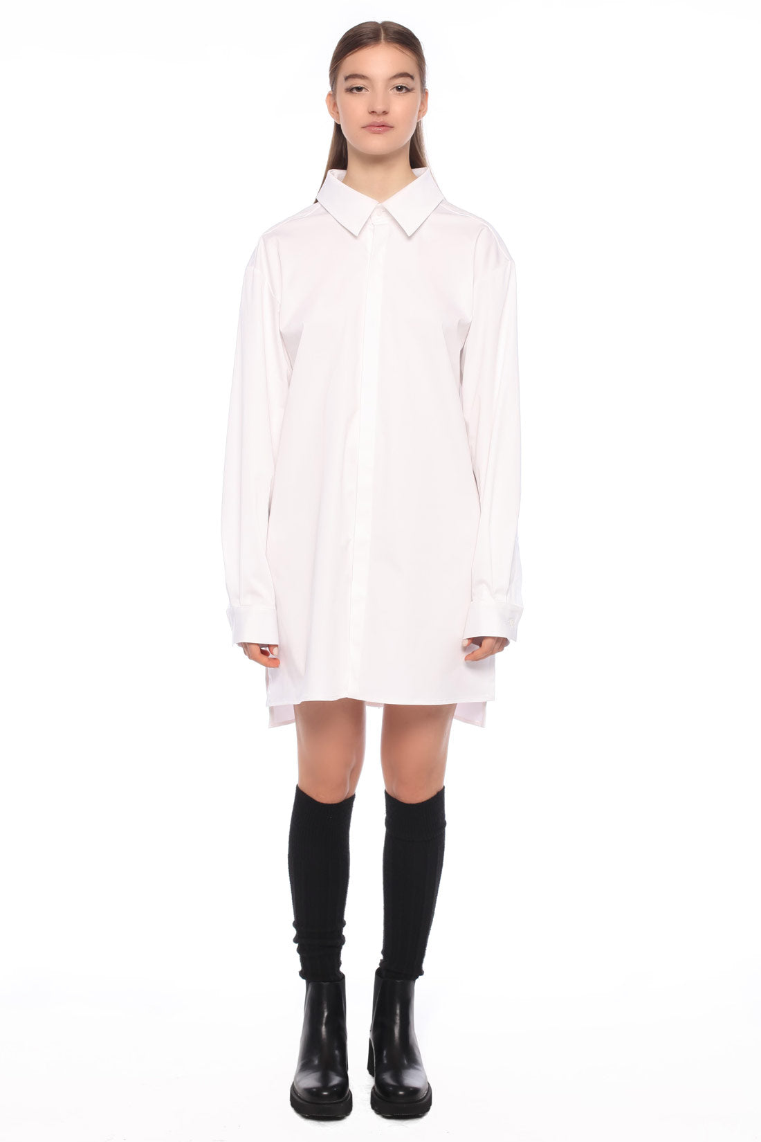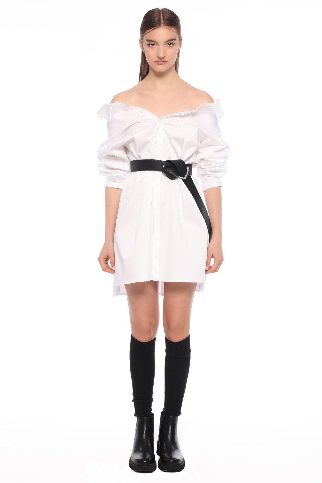 MAN-CUT SHIRT IN STRETCH COTTON POPLIN JACKET WEIGHT, TRANSFORMED INTO A MINI LONG SLEEVED DRESS. BUTTONING ON THE FRONT AND BACK SIDE THAT ALLOWS TO UNCOVER THE SHOULDERS. IDEAL TO BE WORN WITH A LEATHER BELT.