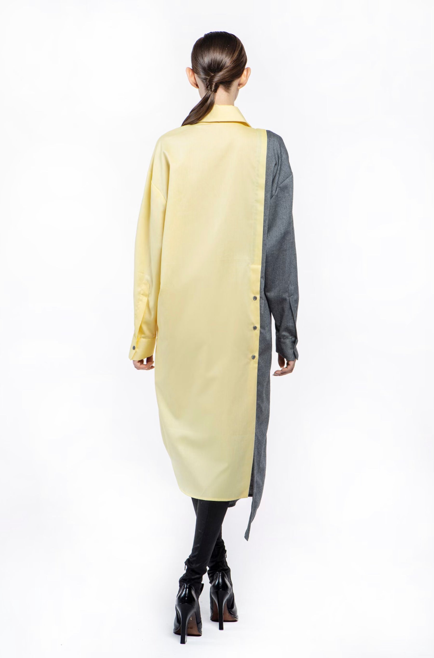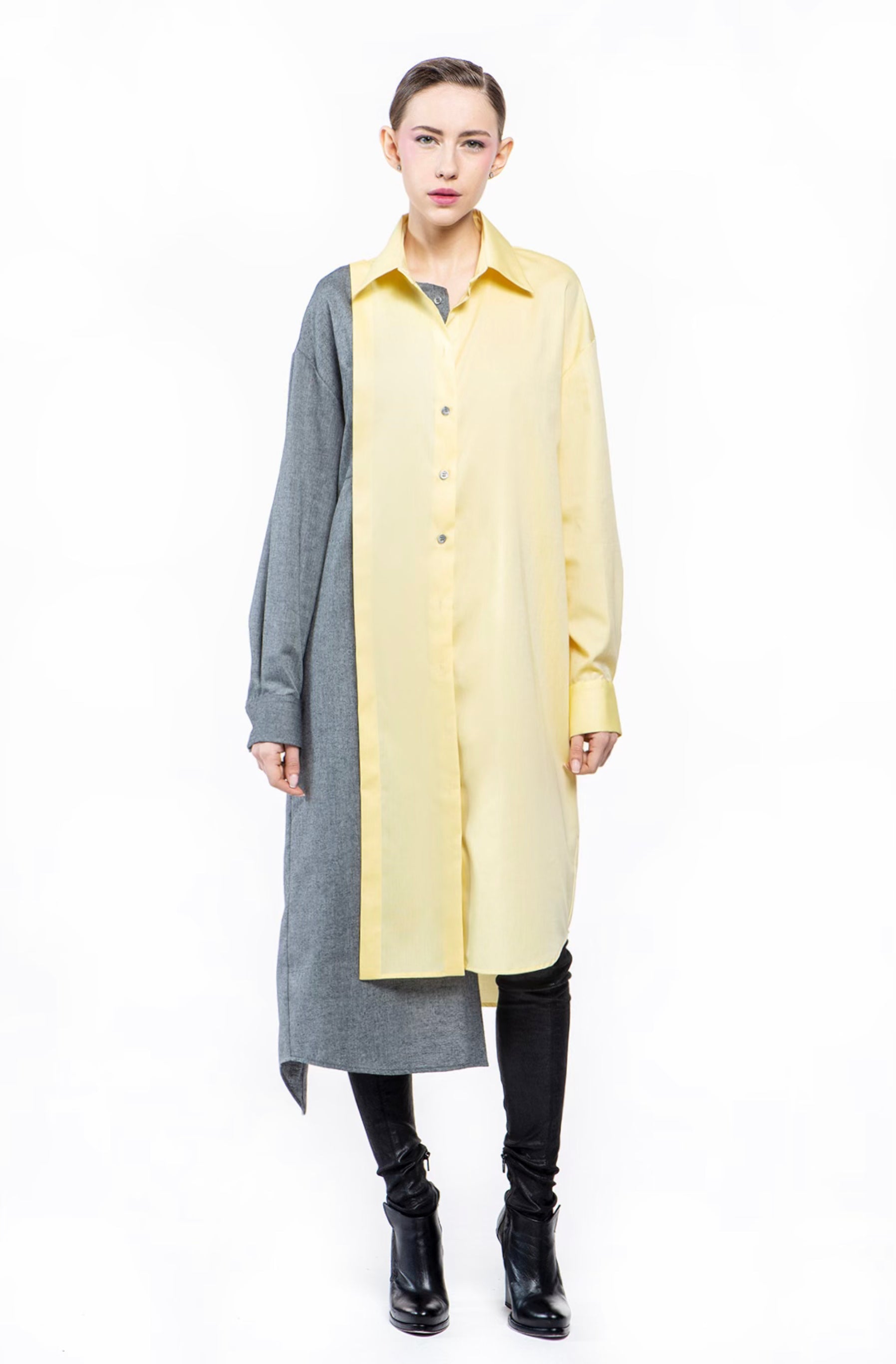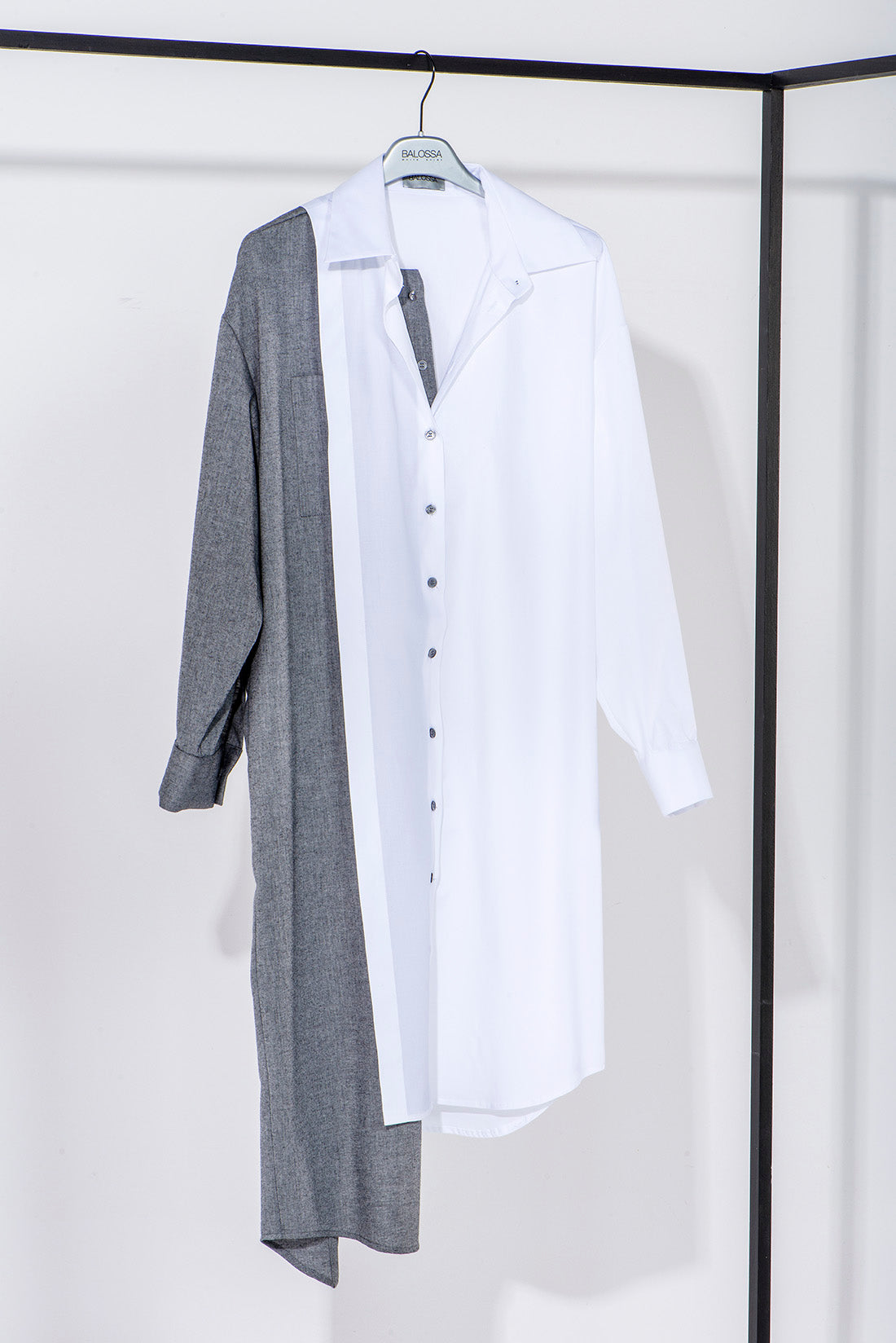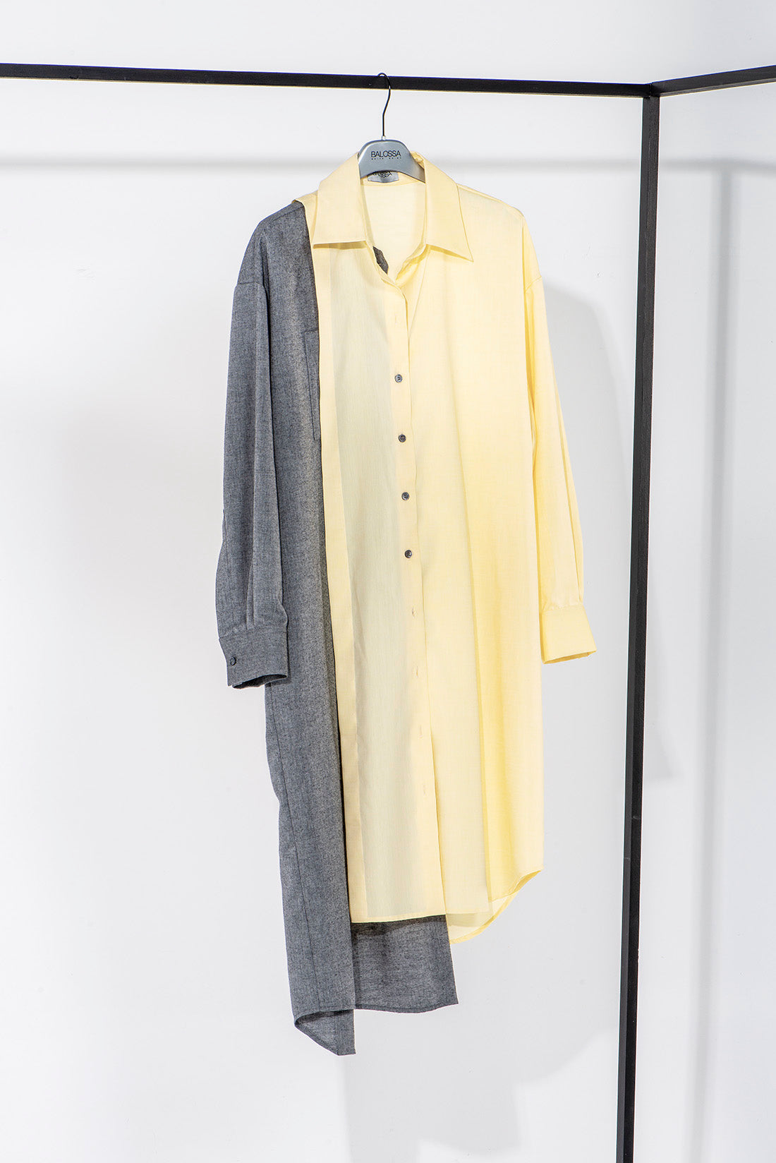 Ovesize two-tone long shirt. The left hem is shorter and rounded, the right hem's cut is straight. The extra layer is featured on the front side for a double buttoning. A slit has been featured on the back right side.