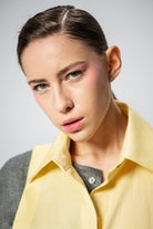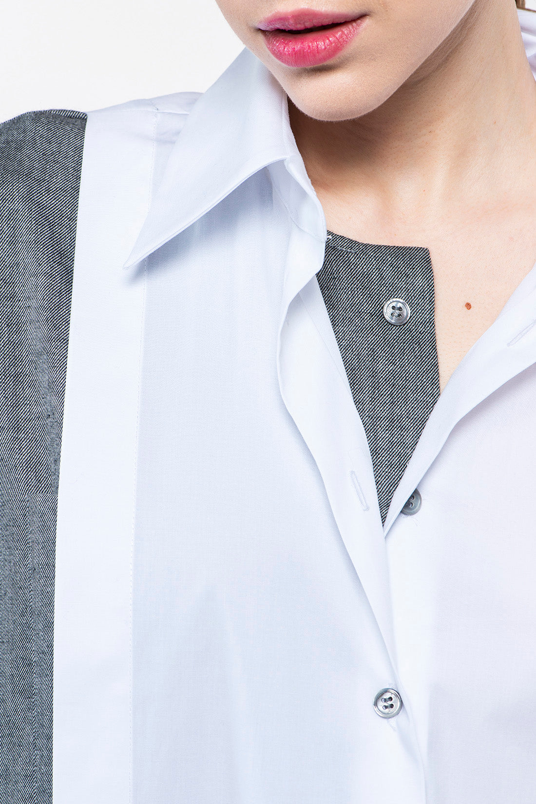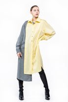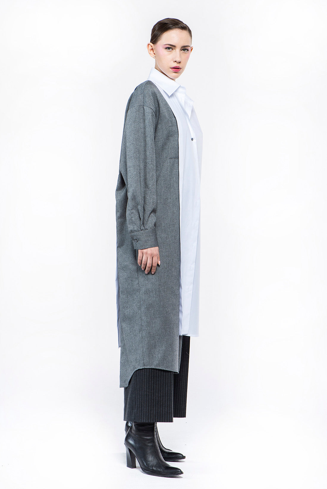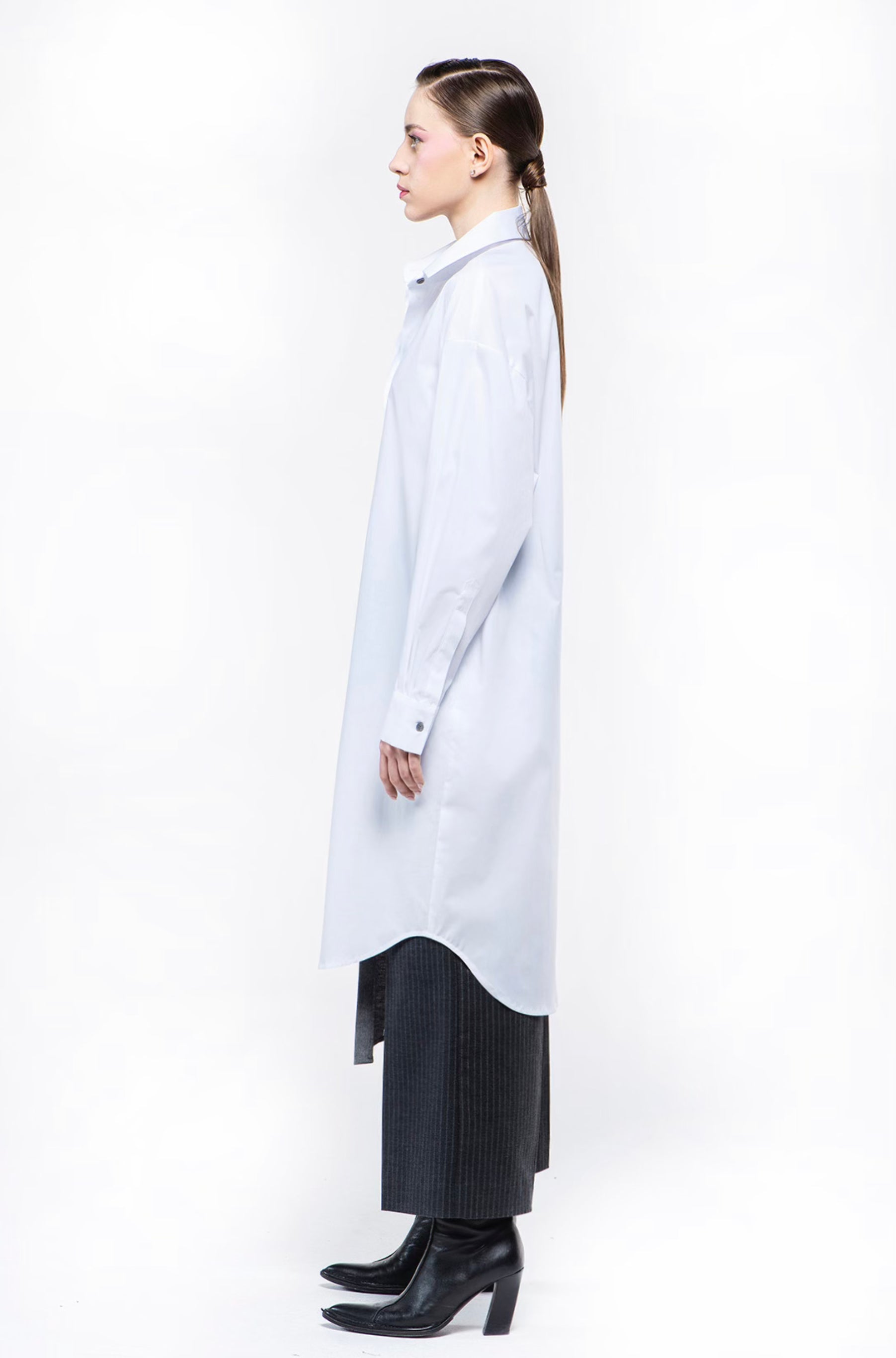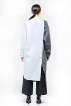Ovesize two-tone long shirt. The left hem is shorter and rounded, the right hem's cut is straight. The extra layer is featured on the front side for a double buttoning. A slit has been featured on the back right side.
