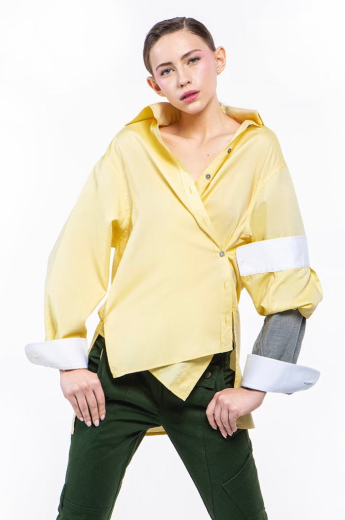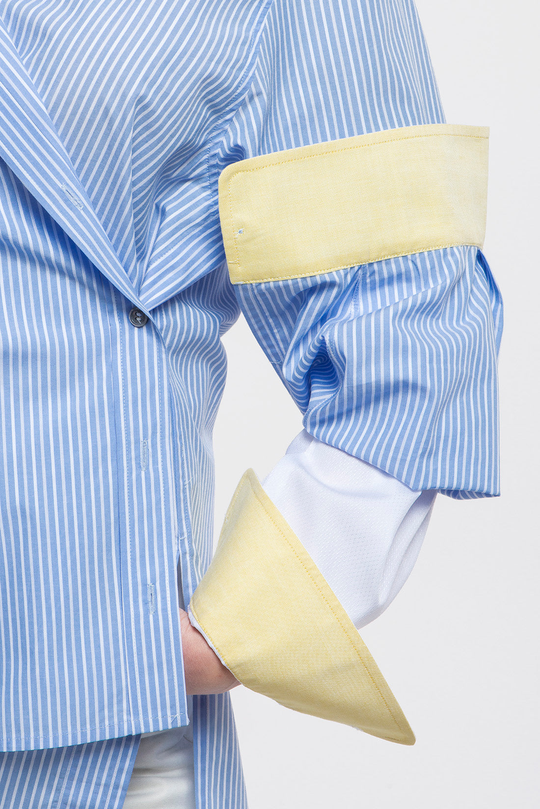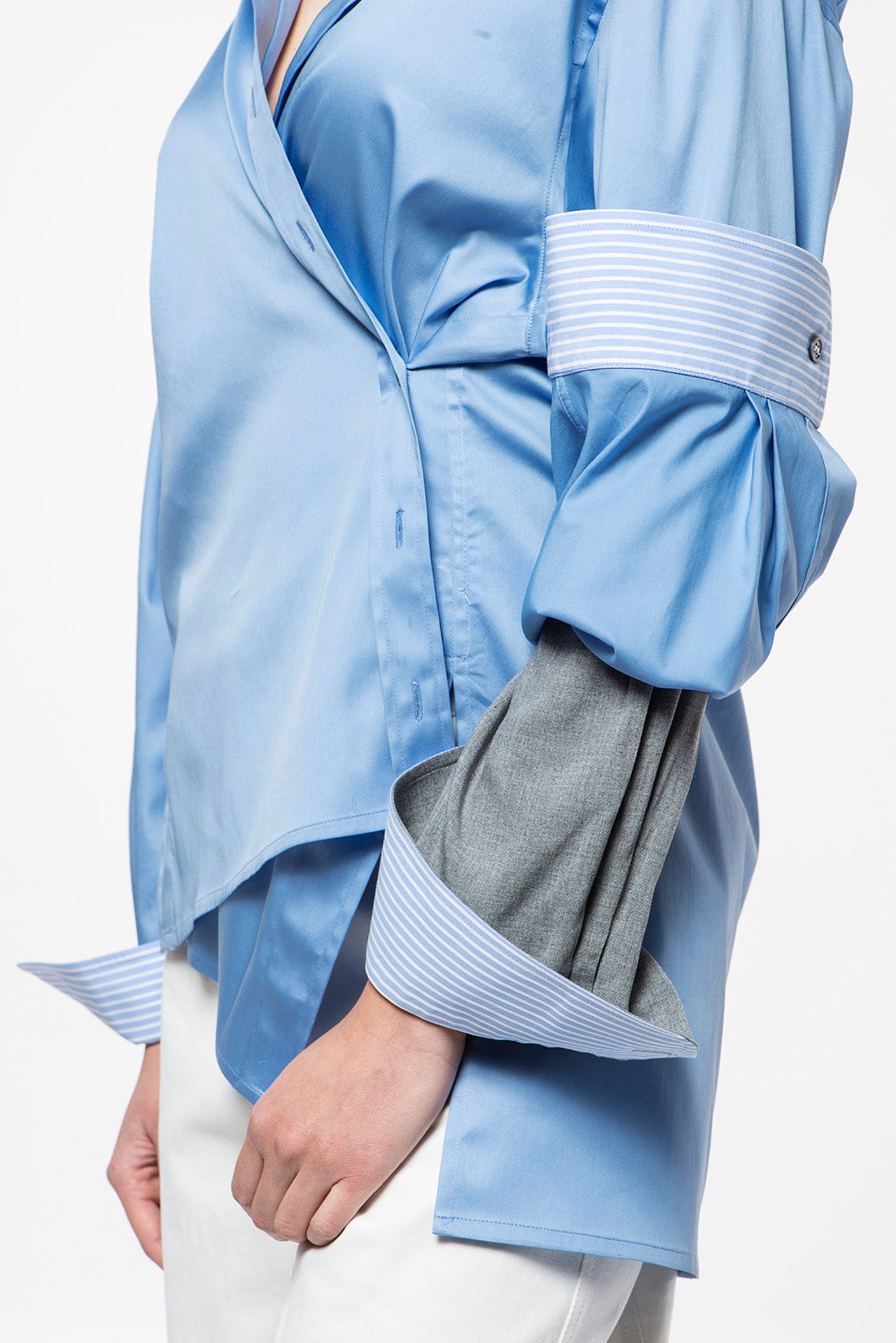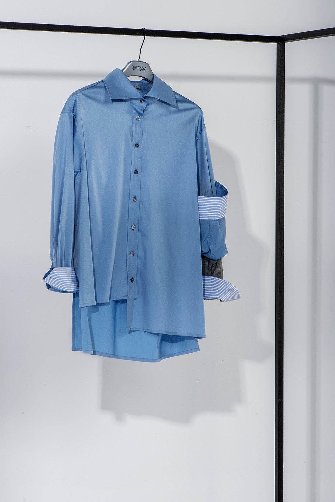 Relaxed-fit shirt with a double sleeve in contrasting color on the left. The cuffs are made in contrasting color inside. The front side left hem is slightly longer. Regular buttoning an one side button to customize the shirt in differenta way.
