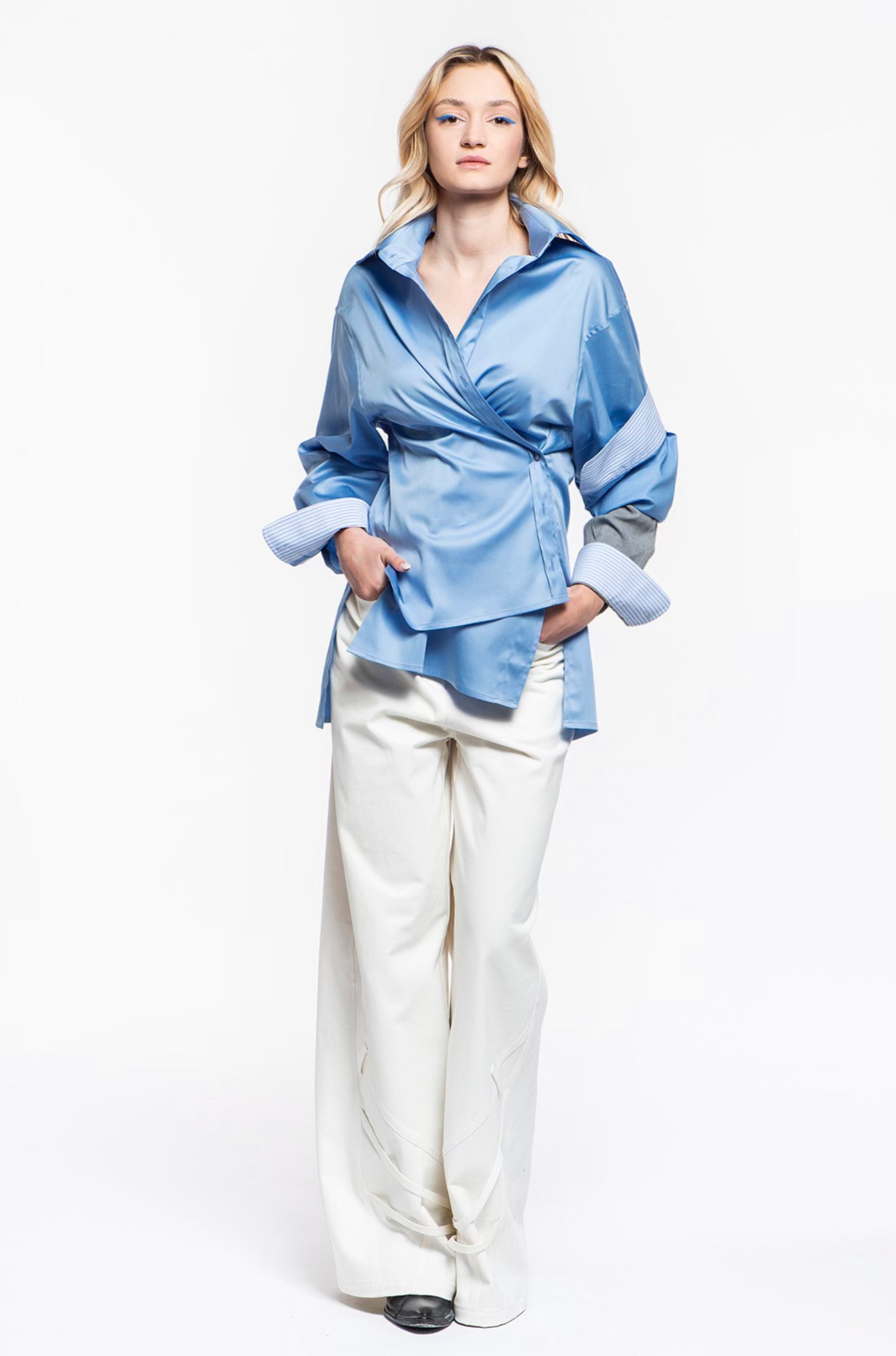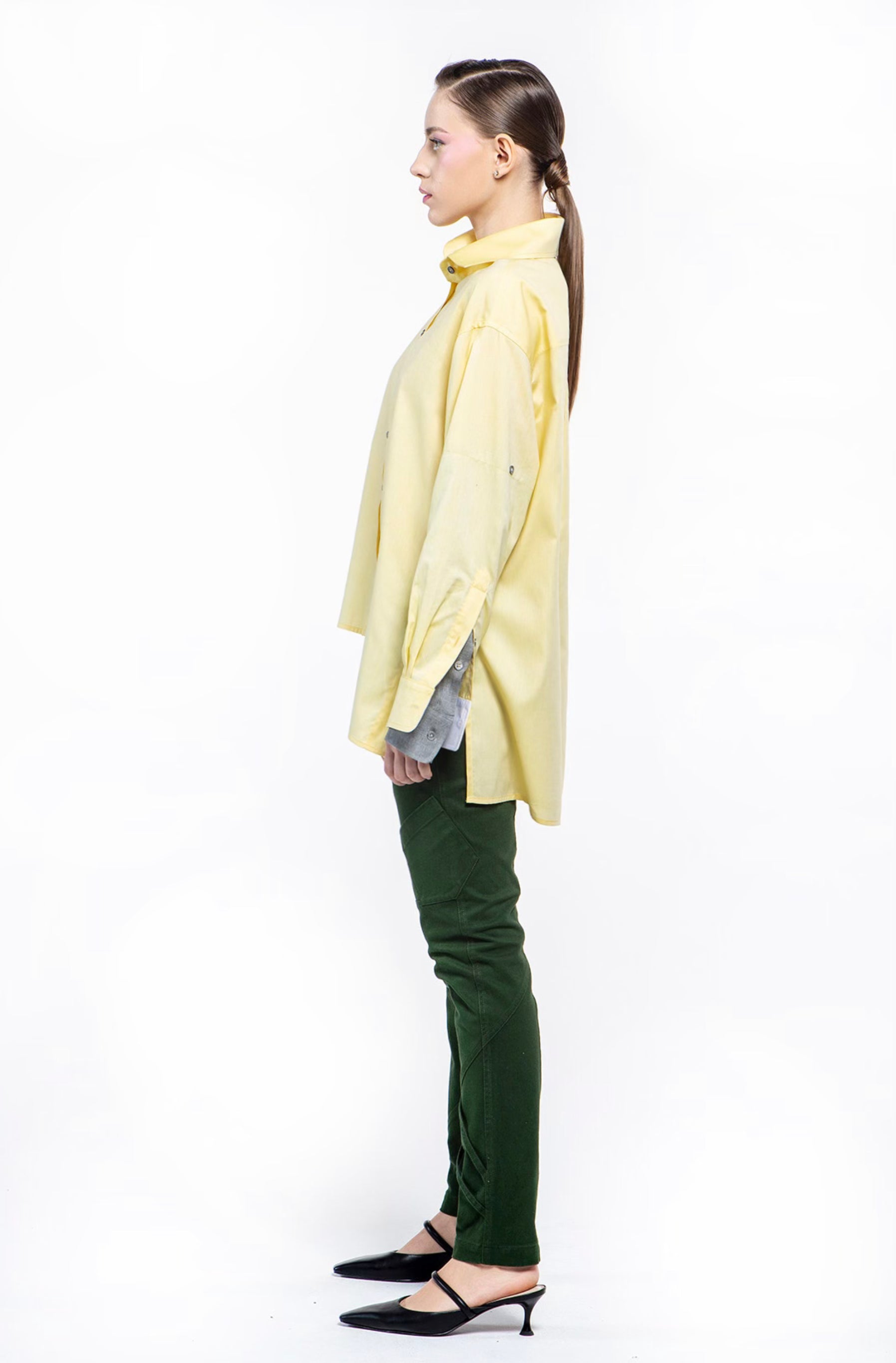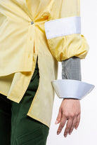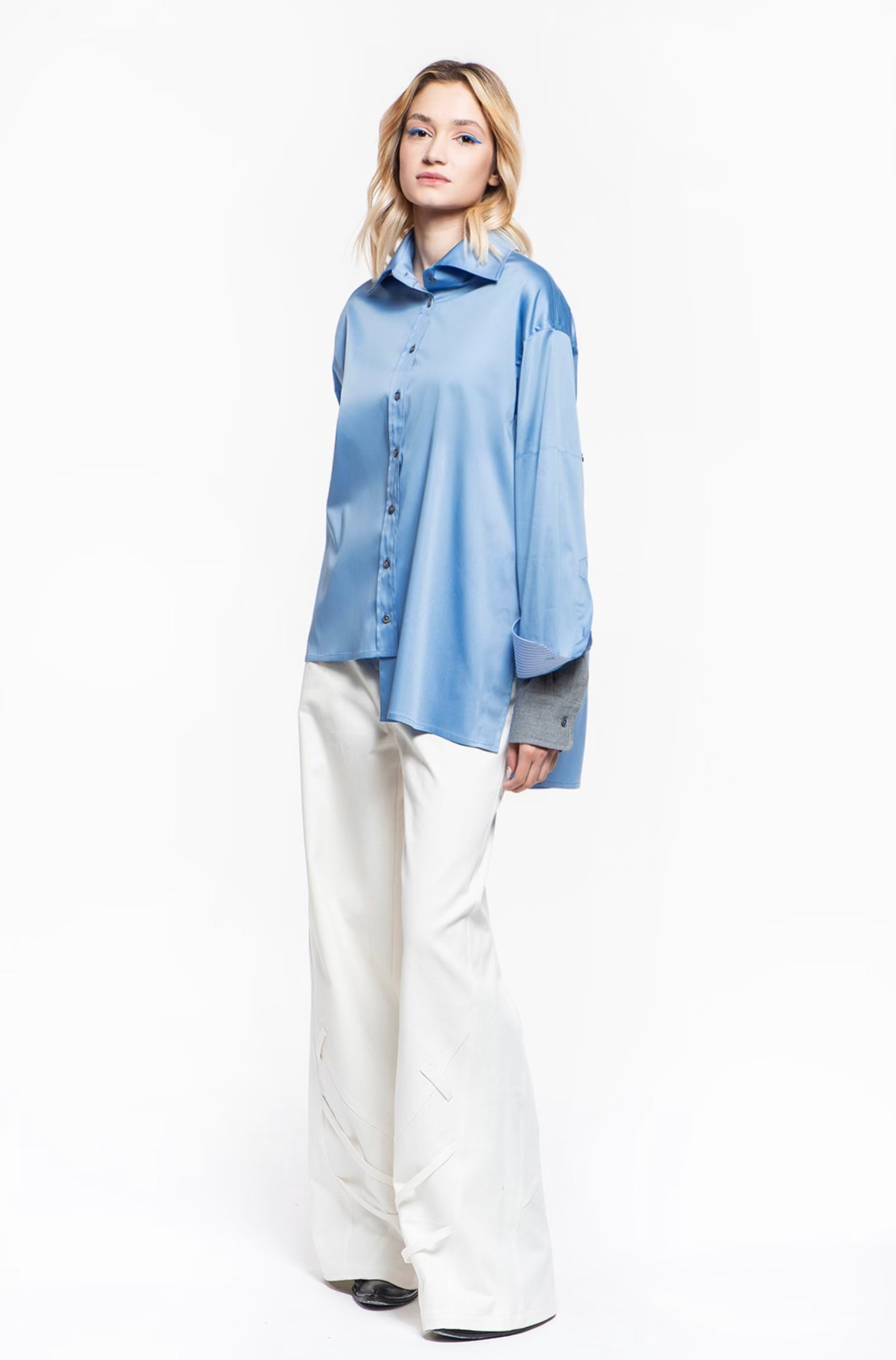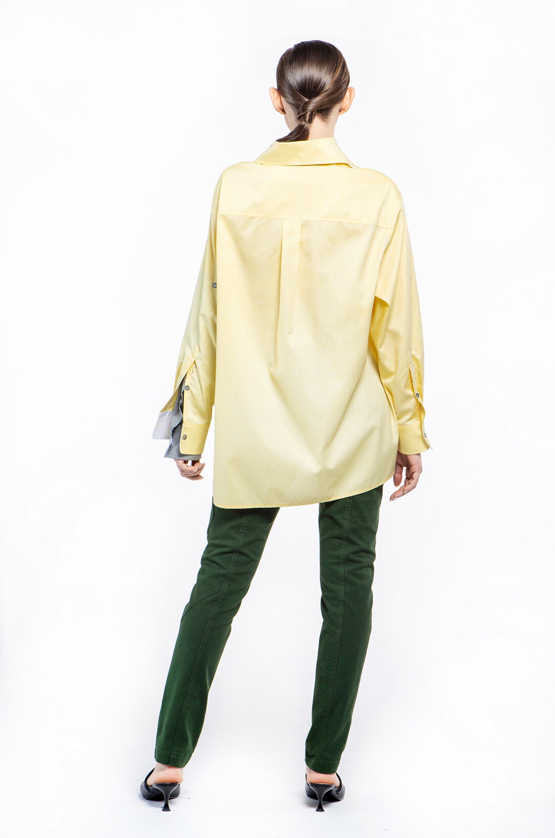 Relaxed-fit shirt with a double sleeve in contrasting color on the left. The cuffs are made in contrasting color inside. The front side left hem is slightly longer. Regular buttoning an one side button to customize the shirt in differenta way.