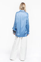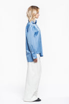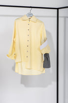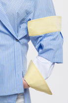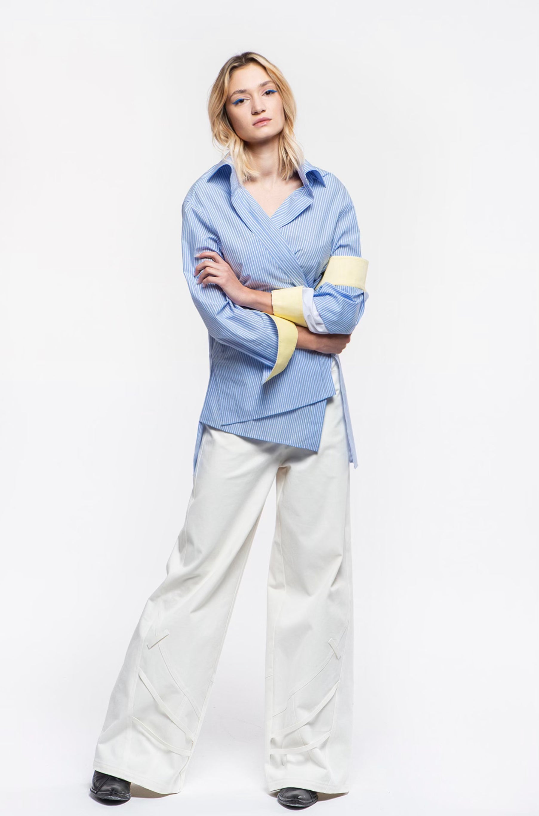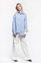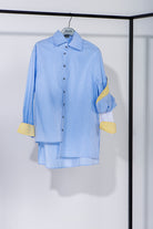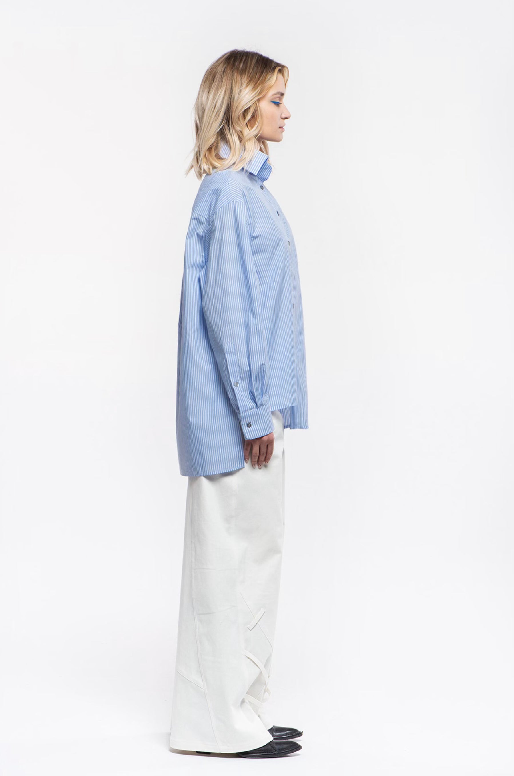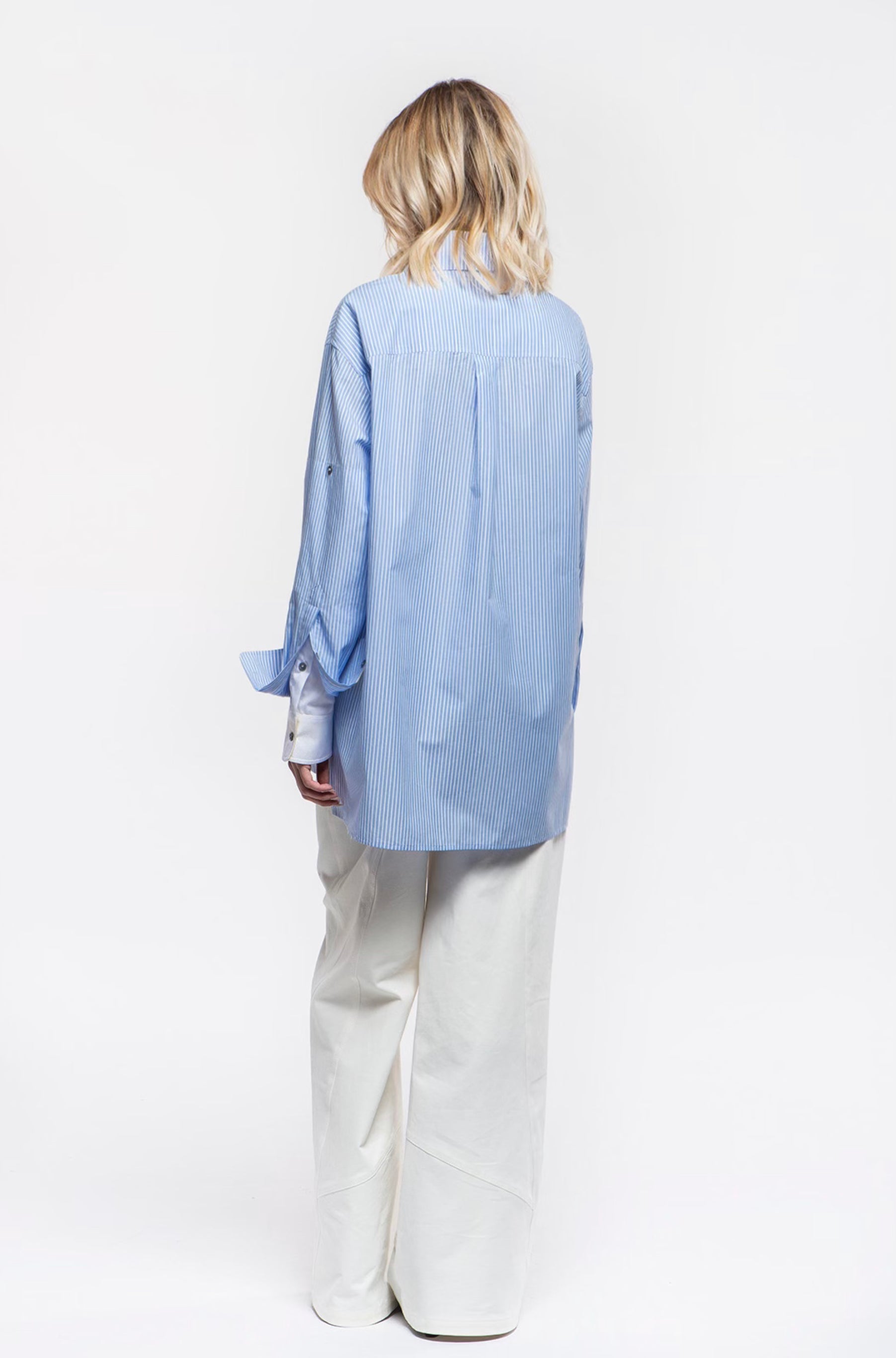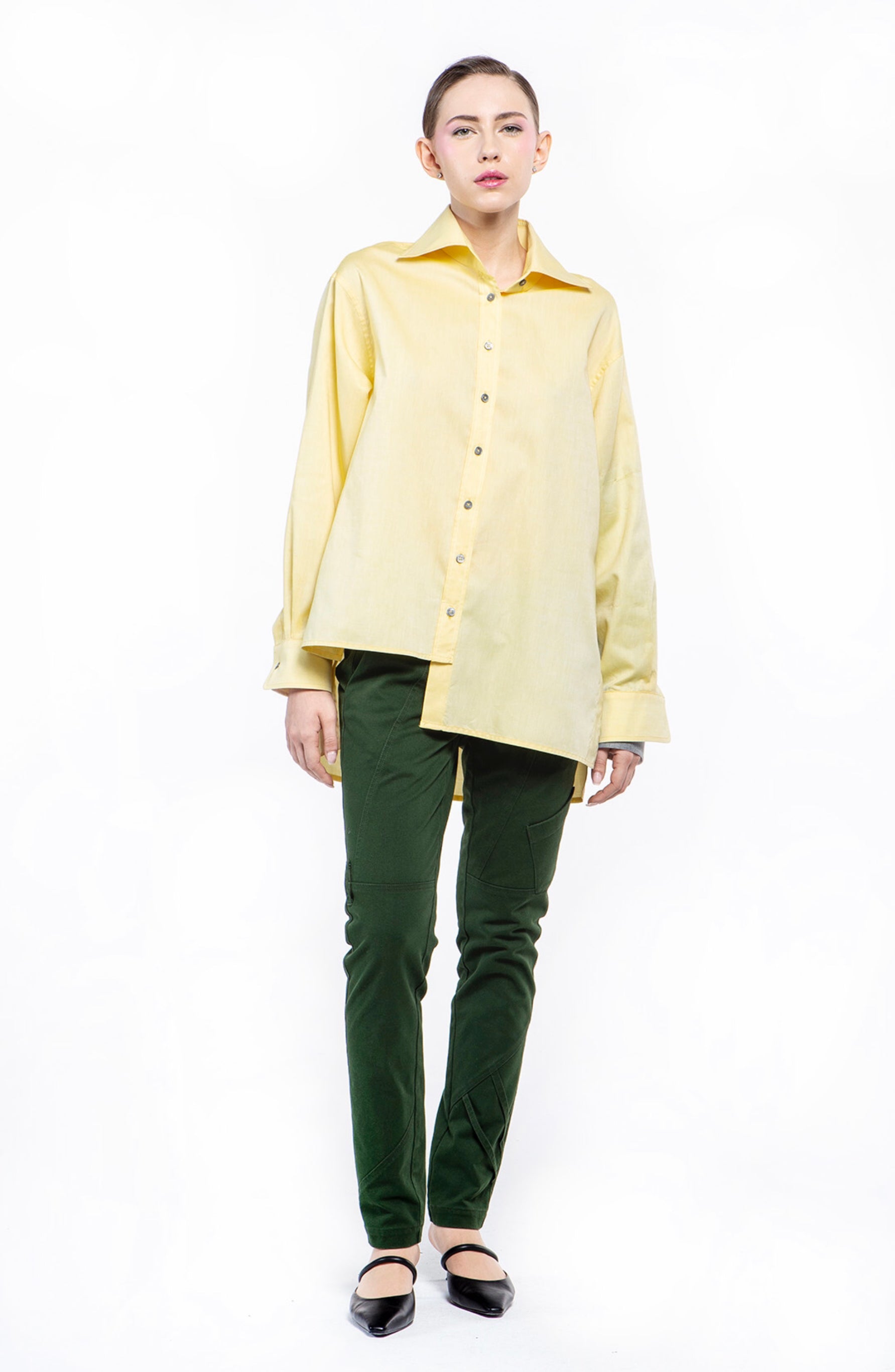 Relaxed-fit shirt with a double sleeve in contrasting color on the left. The cuffs are made in contrasting color inside. The front side left hem is slightly longer. Regular buttoning an one side button to customize the shirt in differenta way.