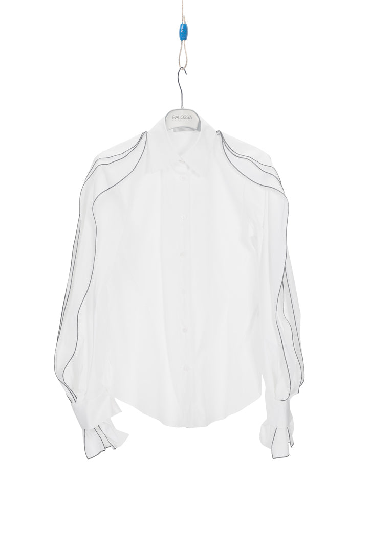 Long sleeve shirt with buttoning on the front, high collar, ruffled layers on the sleeves
