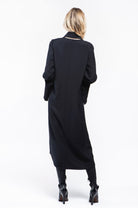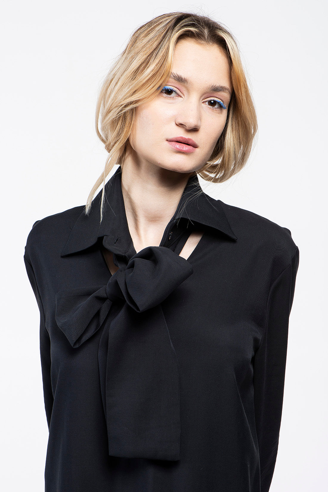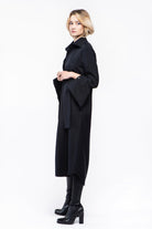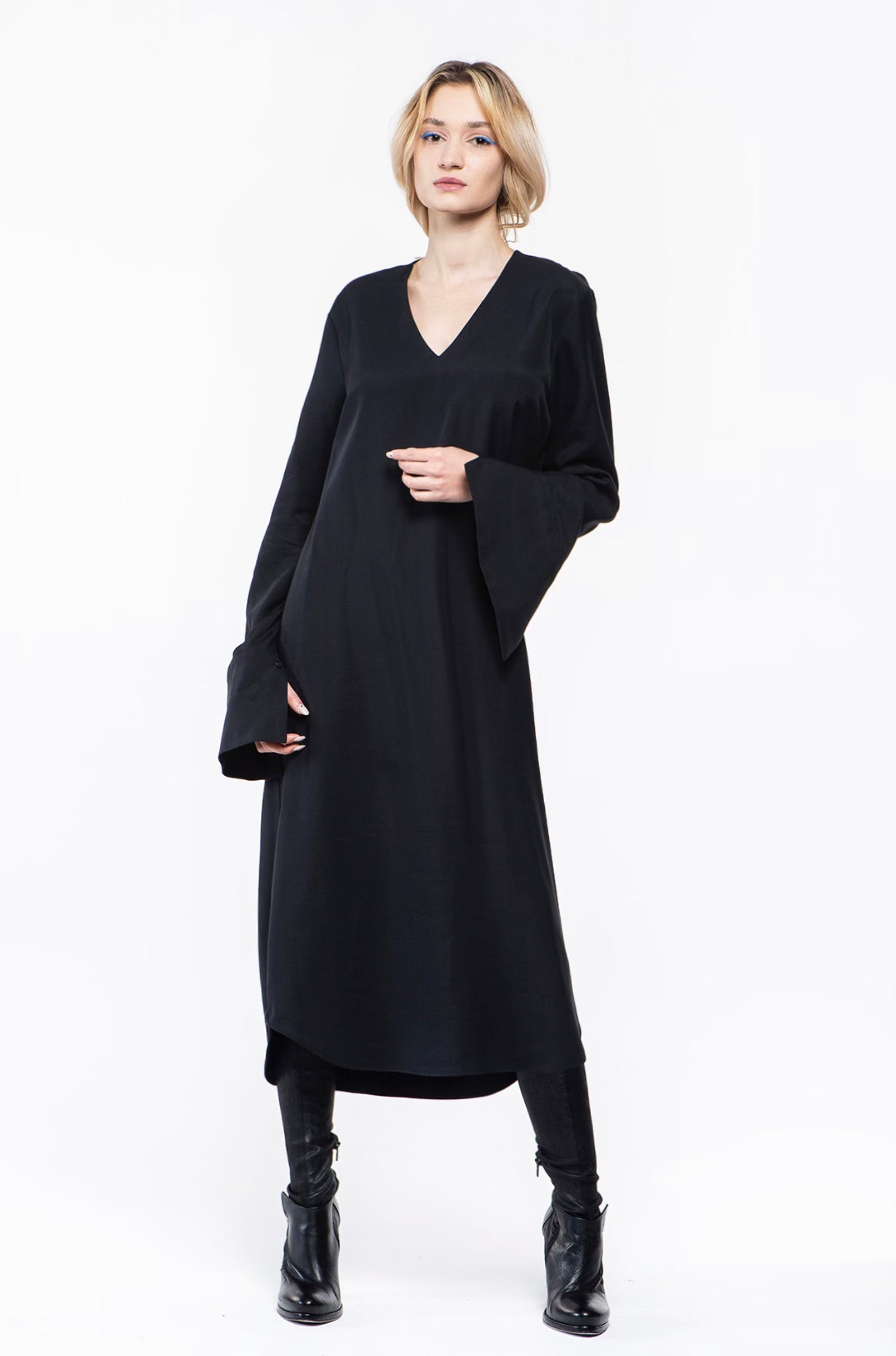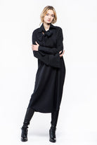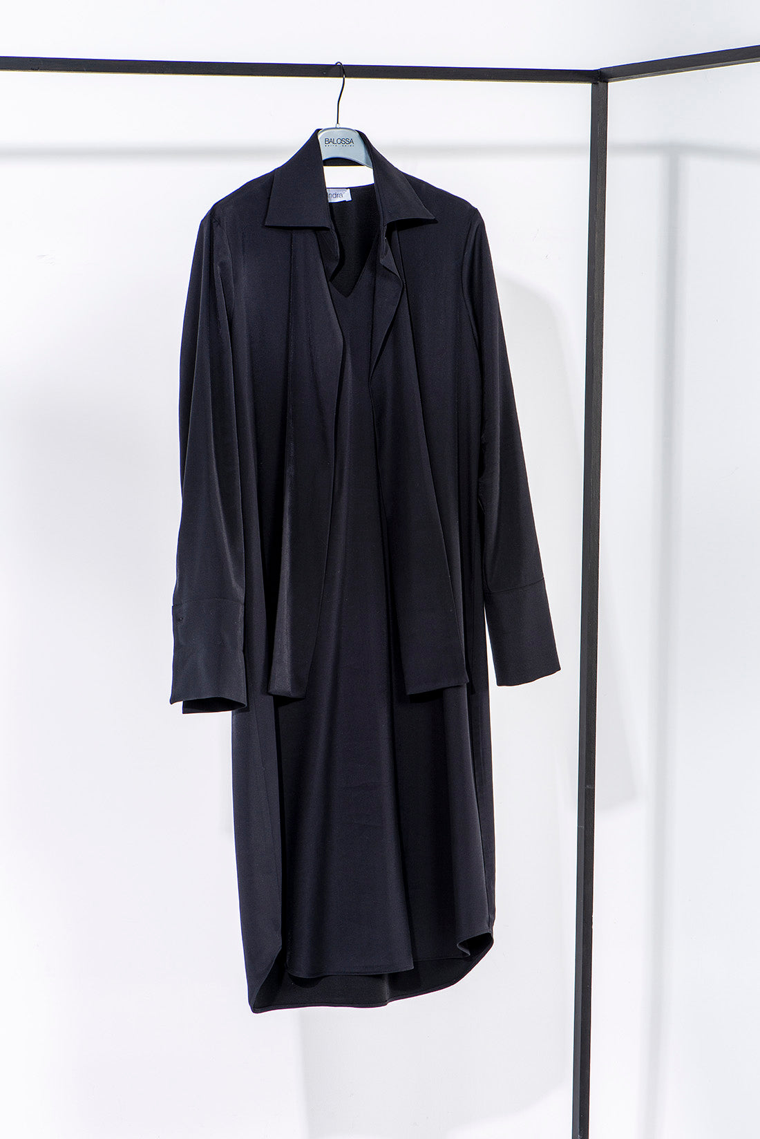 Relaxed-fit long dress with prolonged sleeves and maxi cuffs, V shape collar to be costumized with an removable shawl-collar.