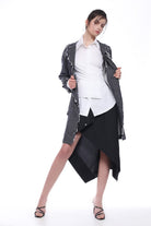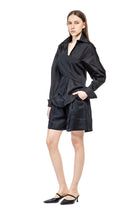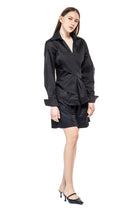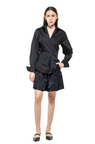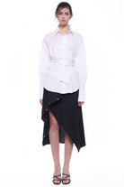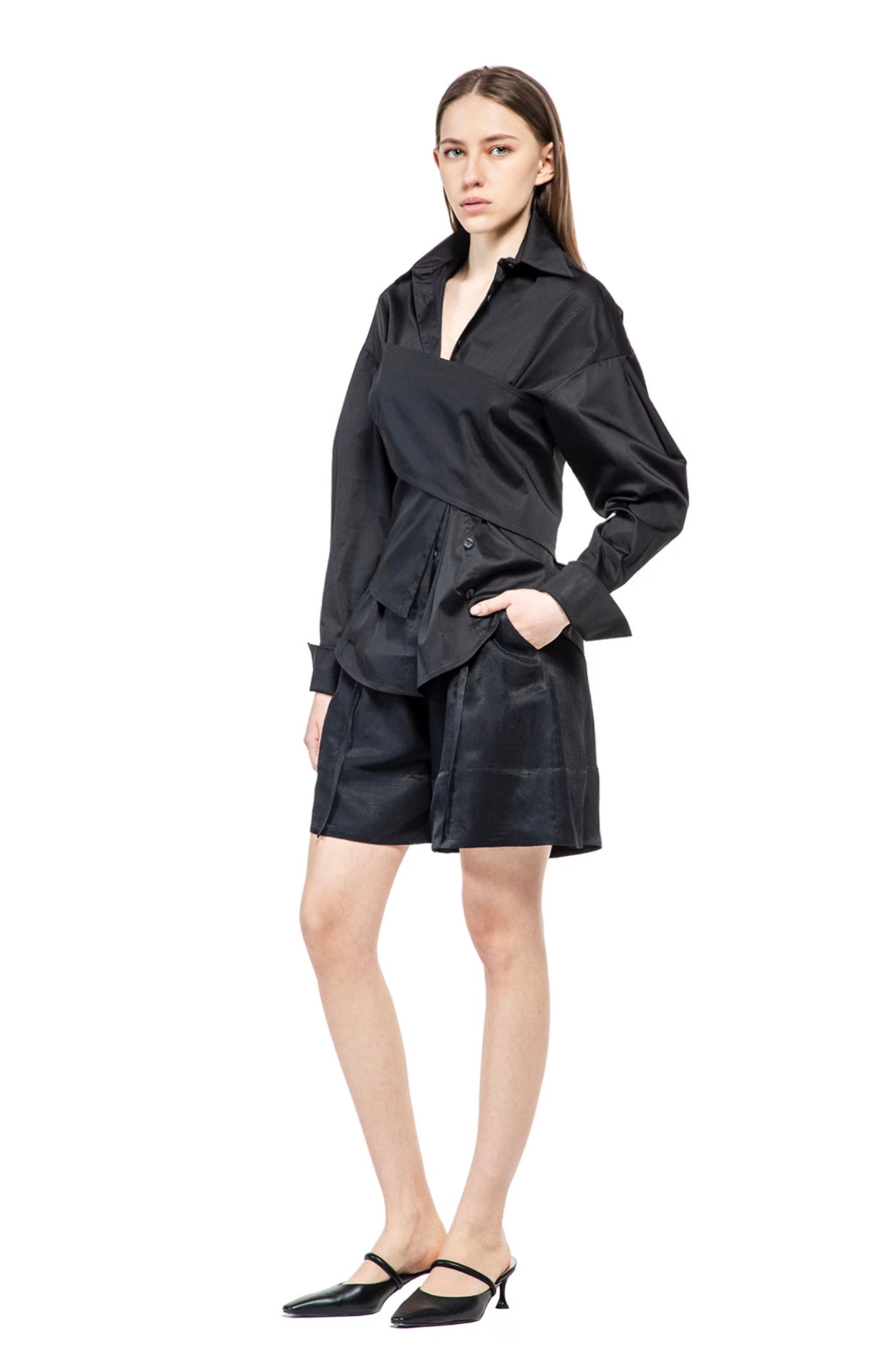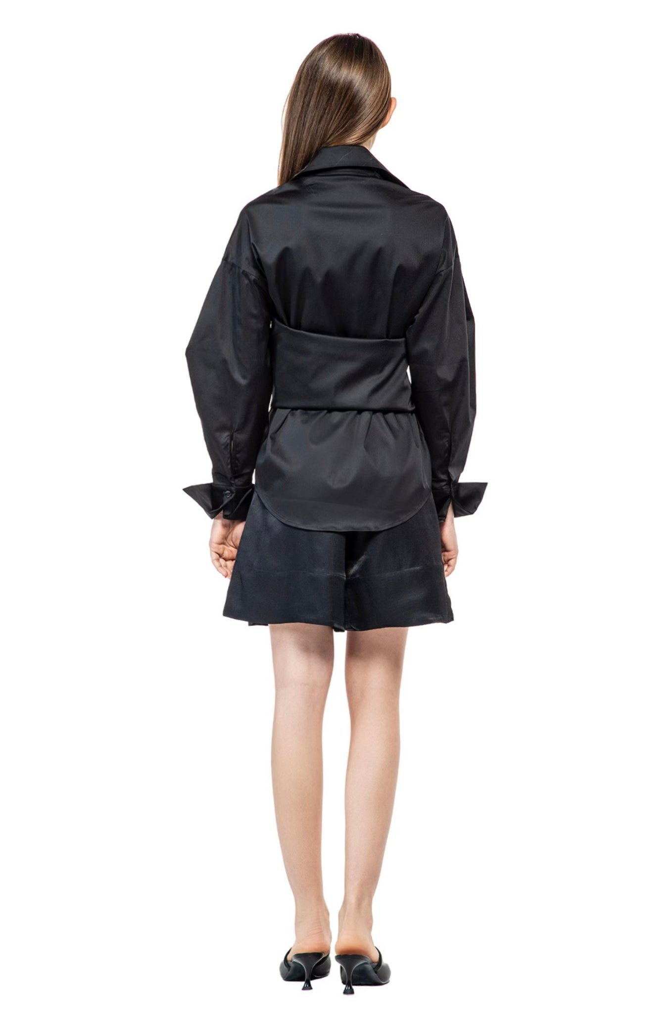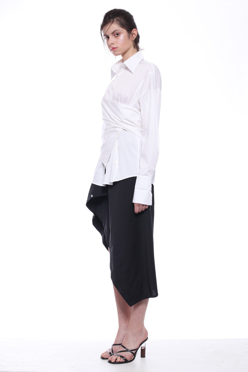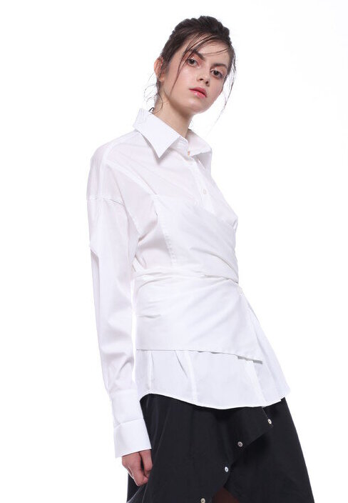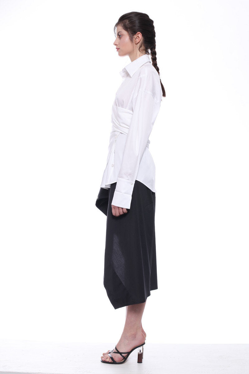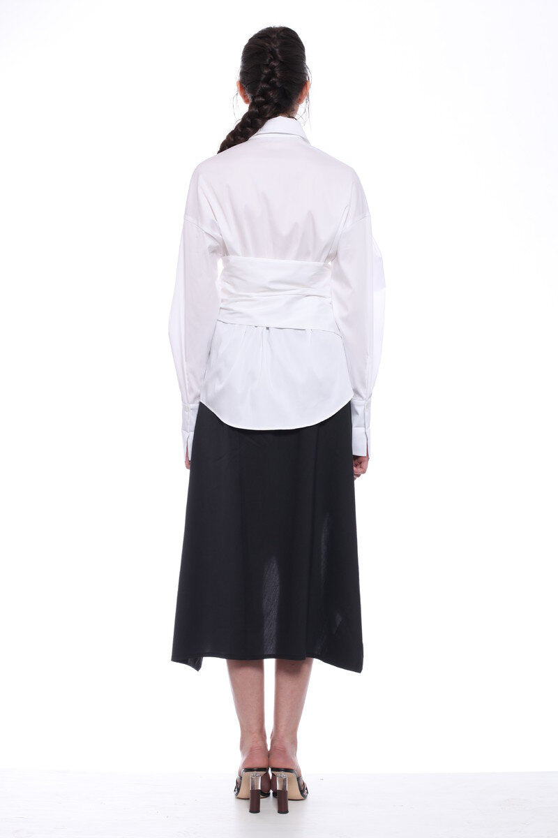 LONG-SLEEVED EXTRE ELASTIC POPLIN SHIRT WITH LOW SHOULDERS AND FASCIA BAND RUNING AROUND THE WAIST, ADJUSTABLE BY THE BUTTONS.