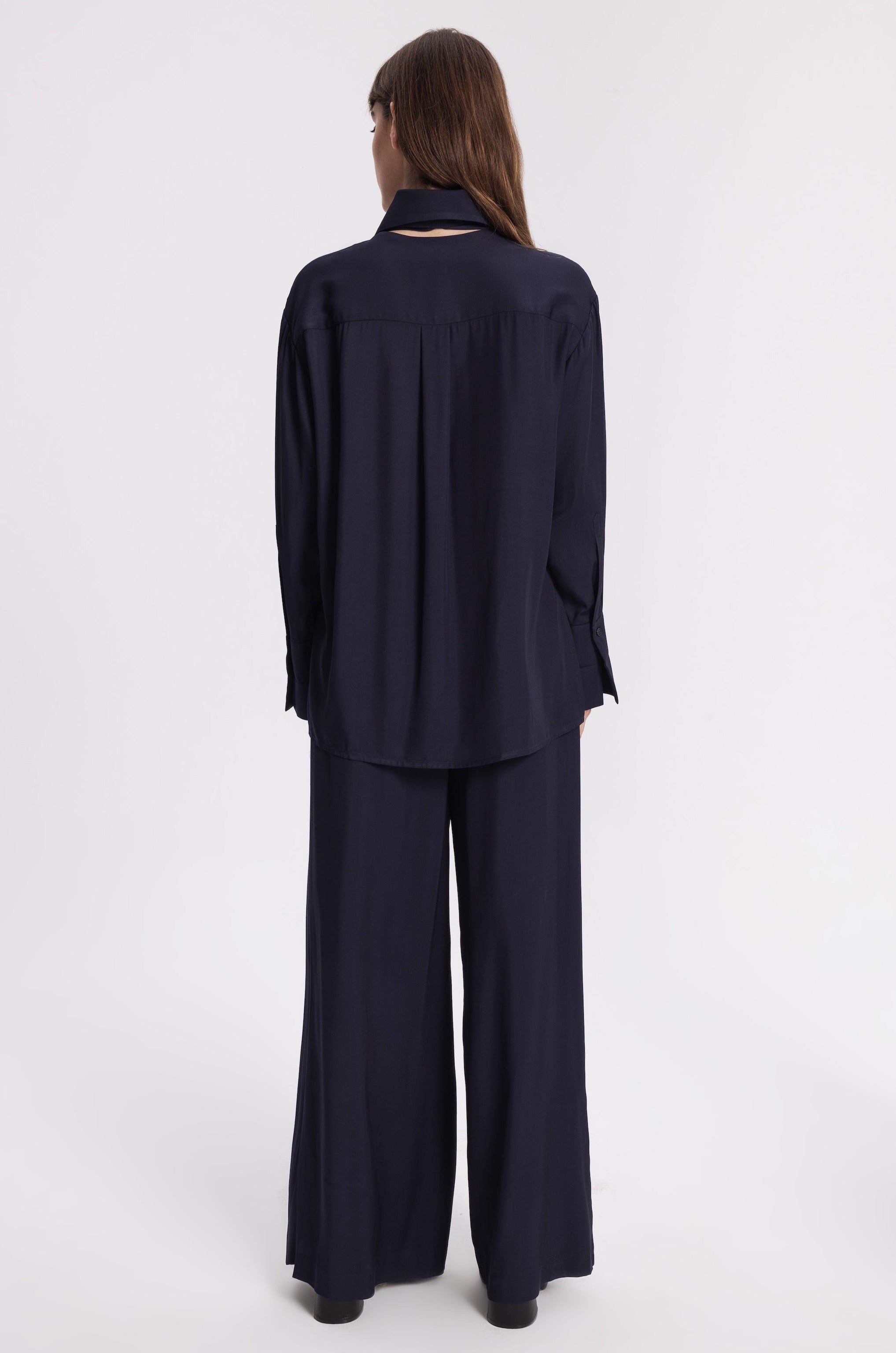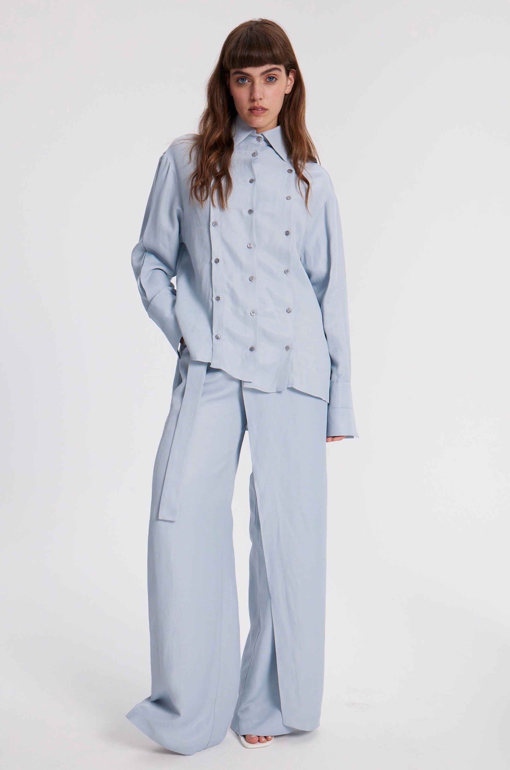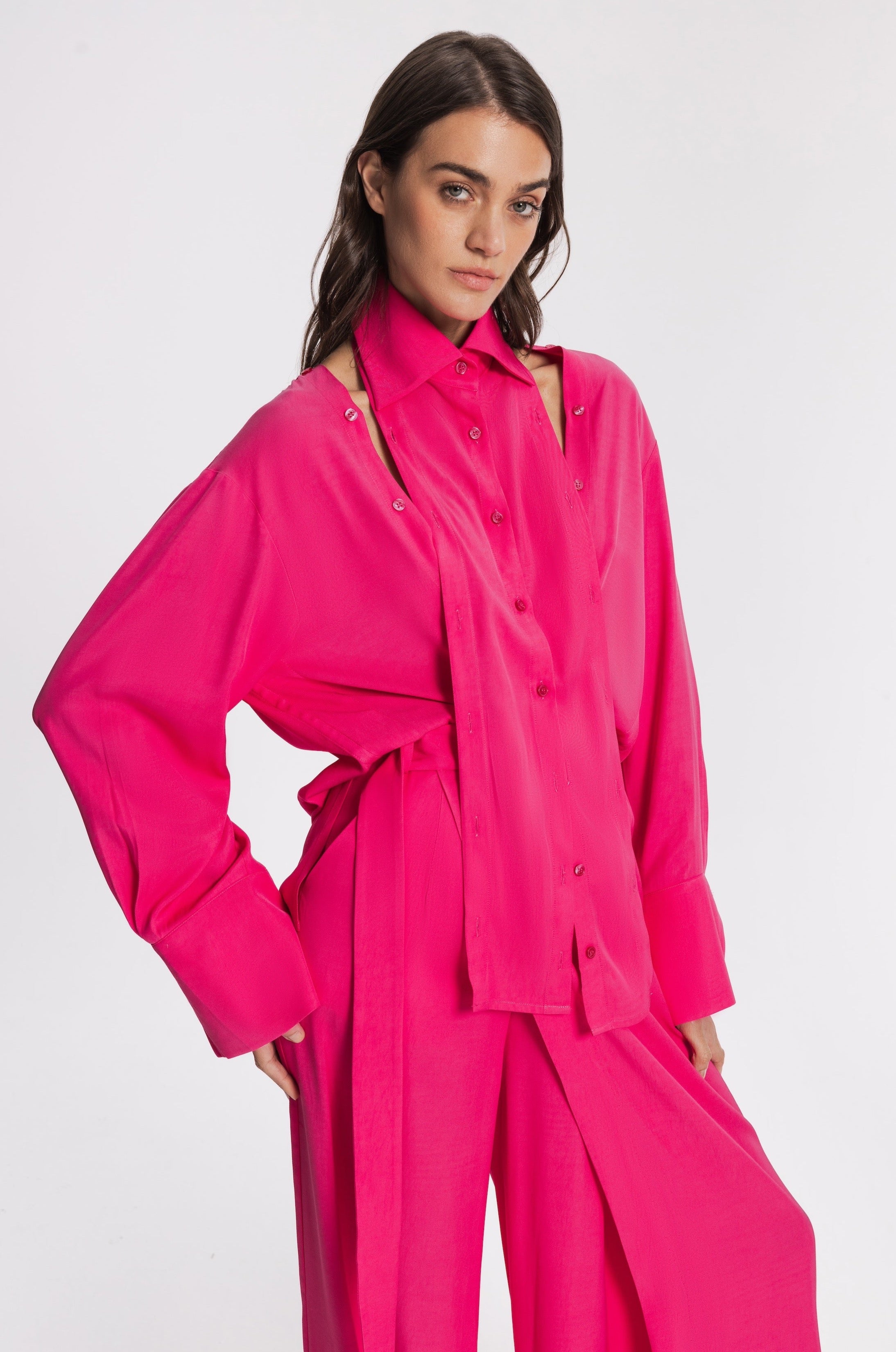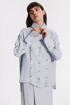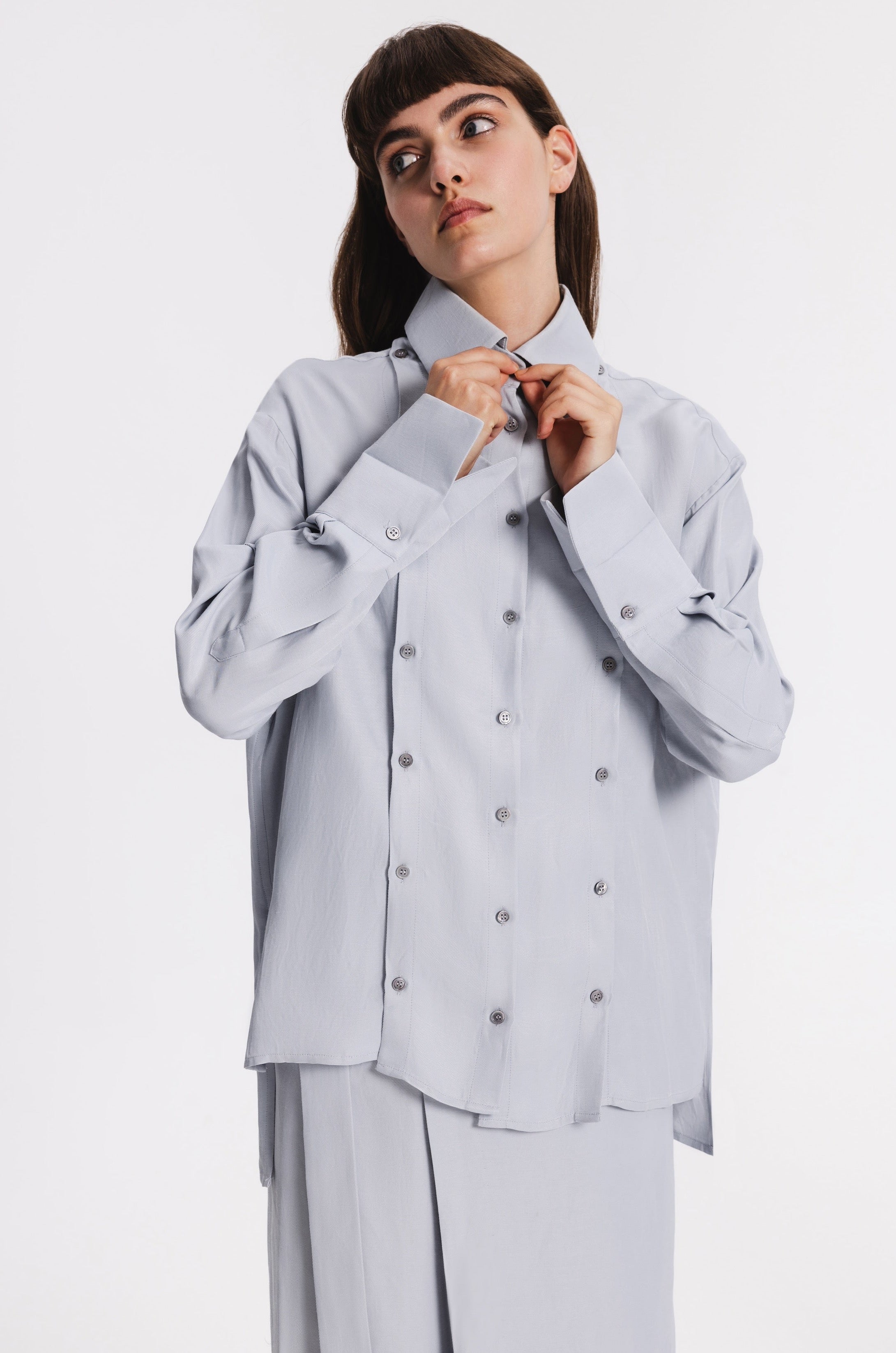 Relaxed-fit shirt with large cuffs. Front buttoning and two extra button lines on the front side that allow to customise the shirt in different ways. The collar line is open horizontally and can be detached.