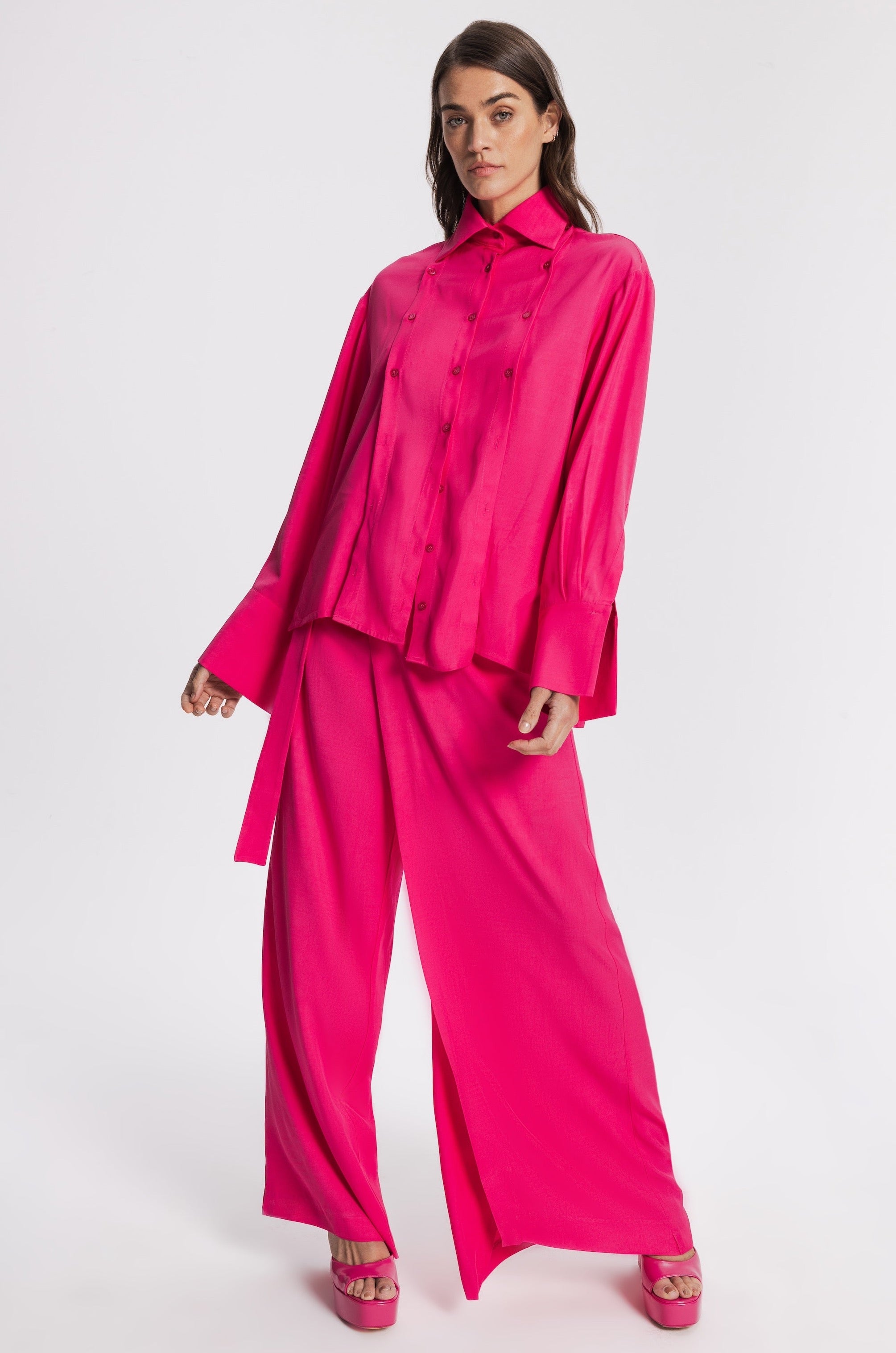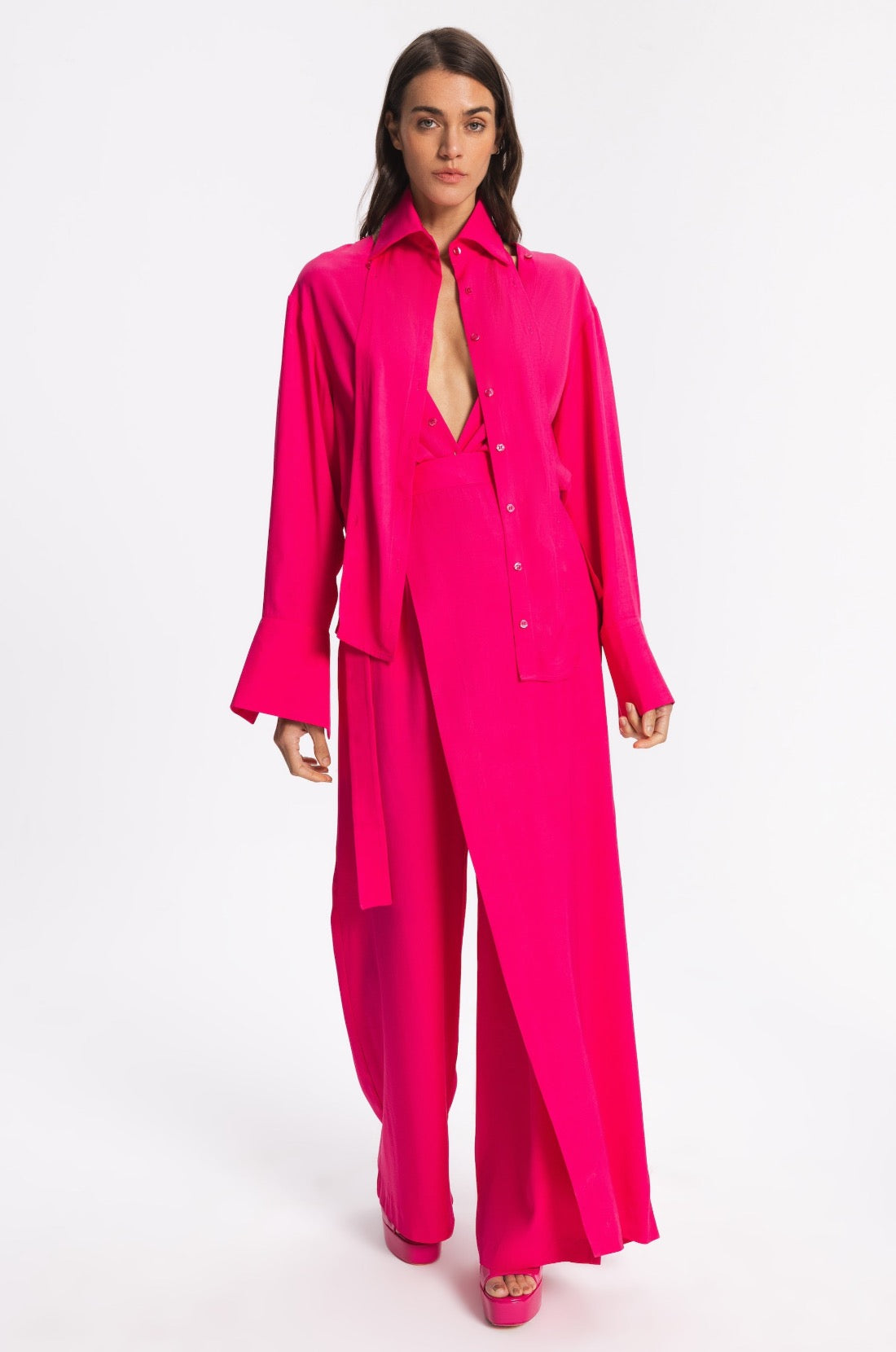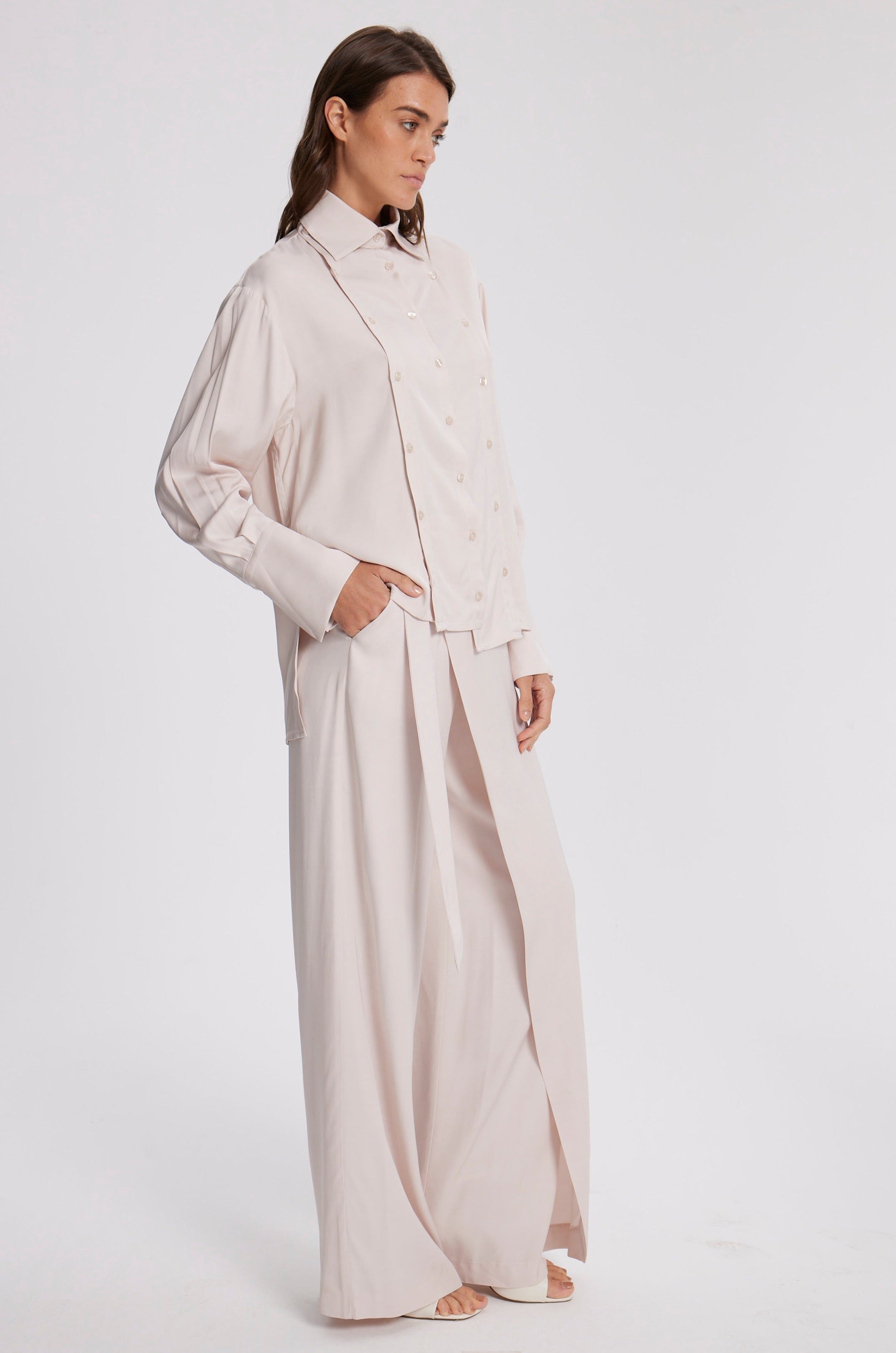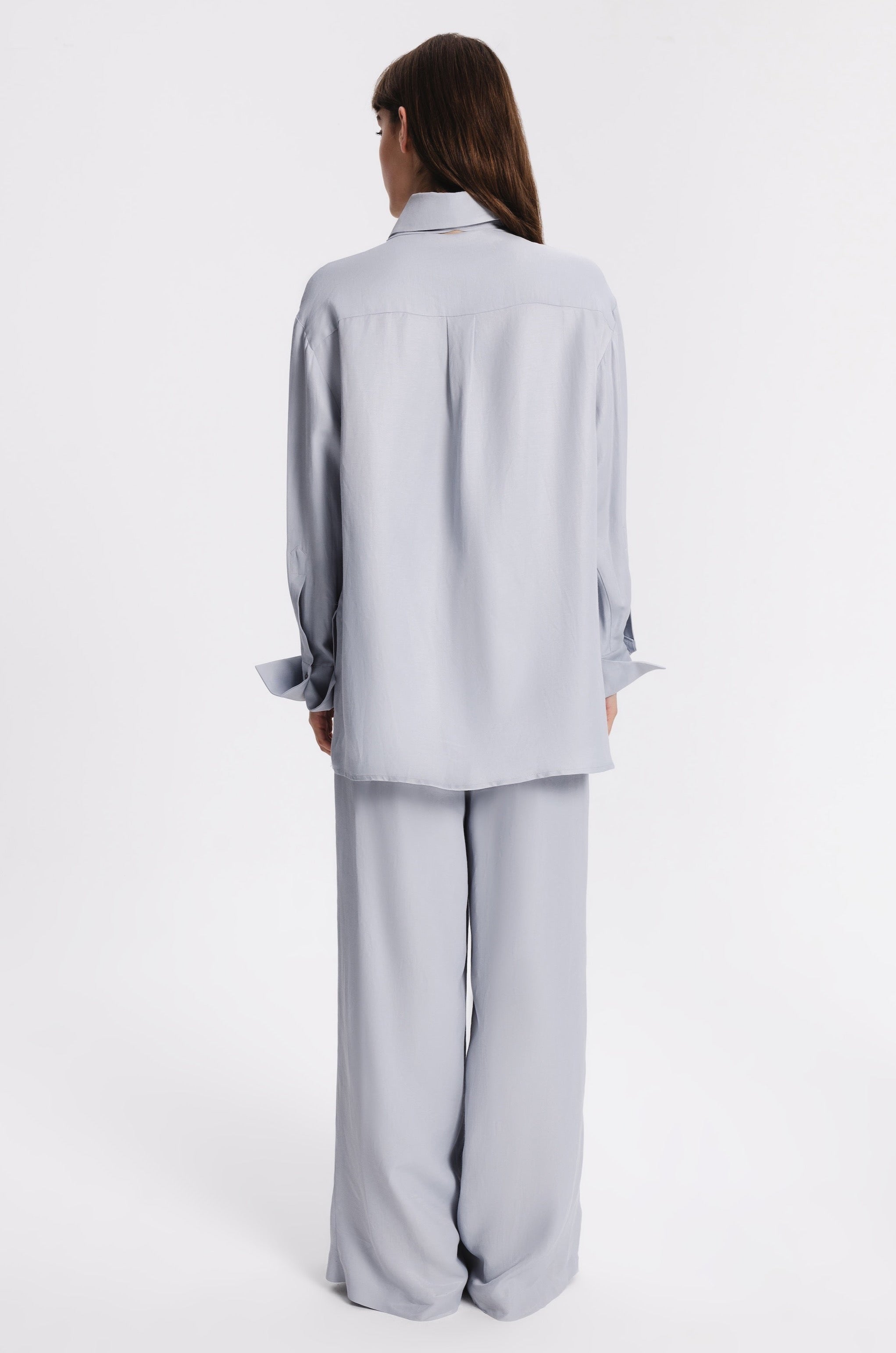 Relaxed-fit shirt with large cuffs. Front buttoning and two extra button lines on the front side that allow to customise the shirt in different ways. The collar line is open horizontally and can be detached.
