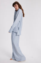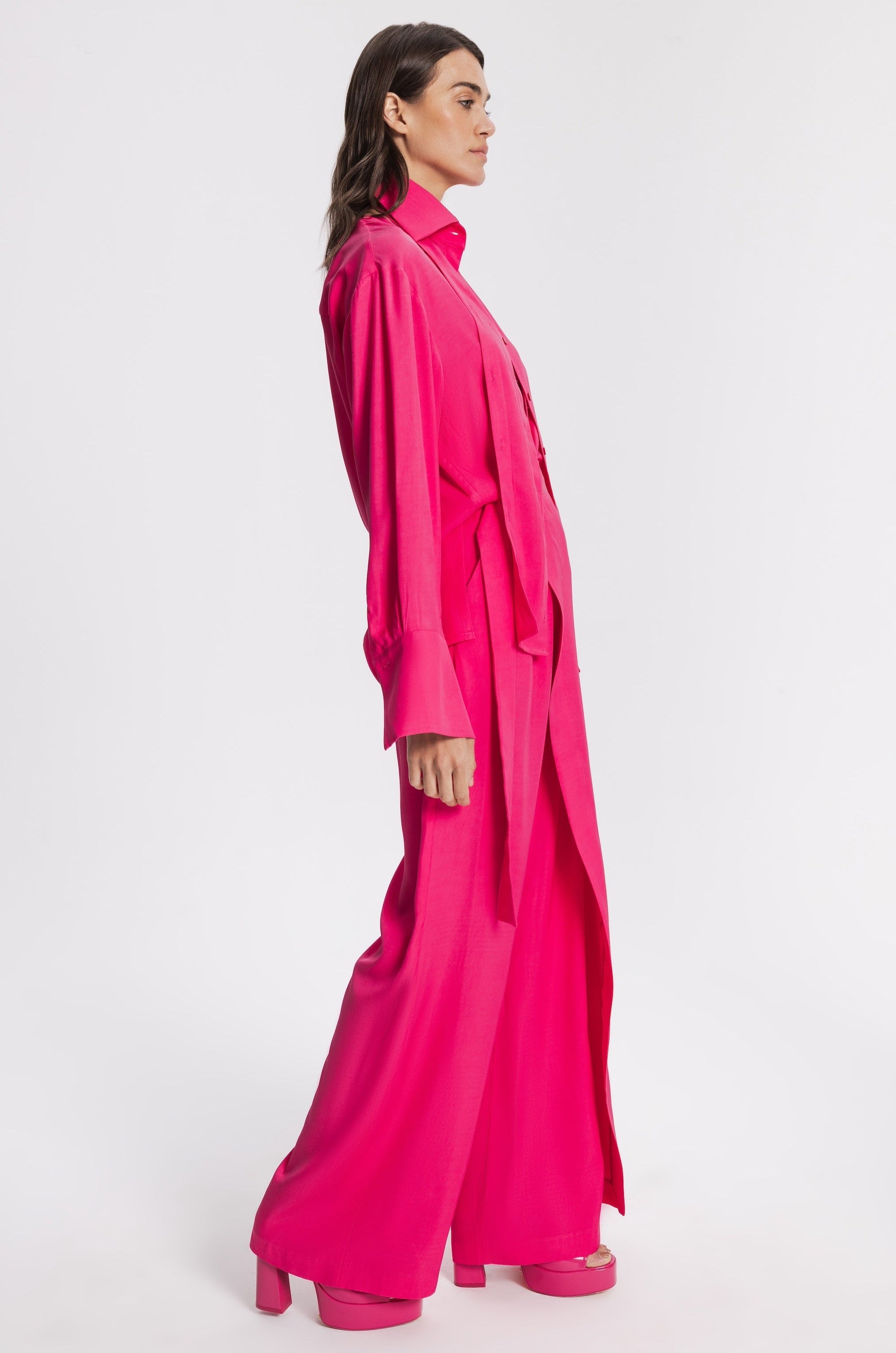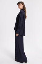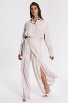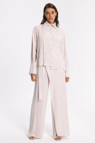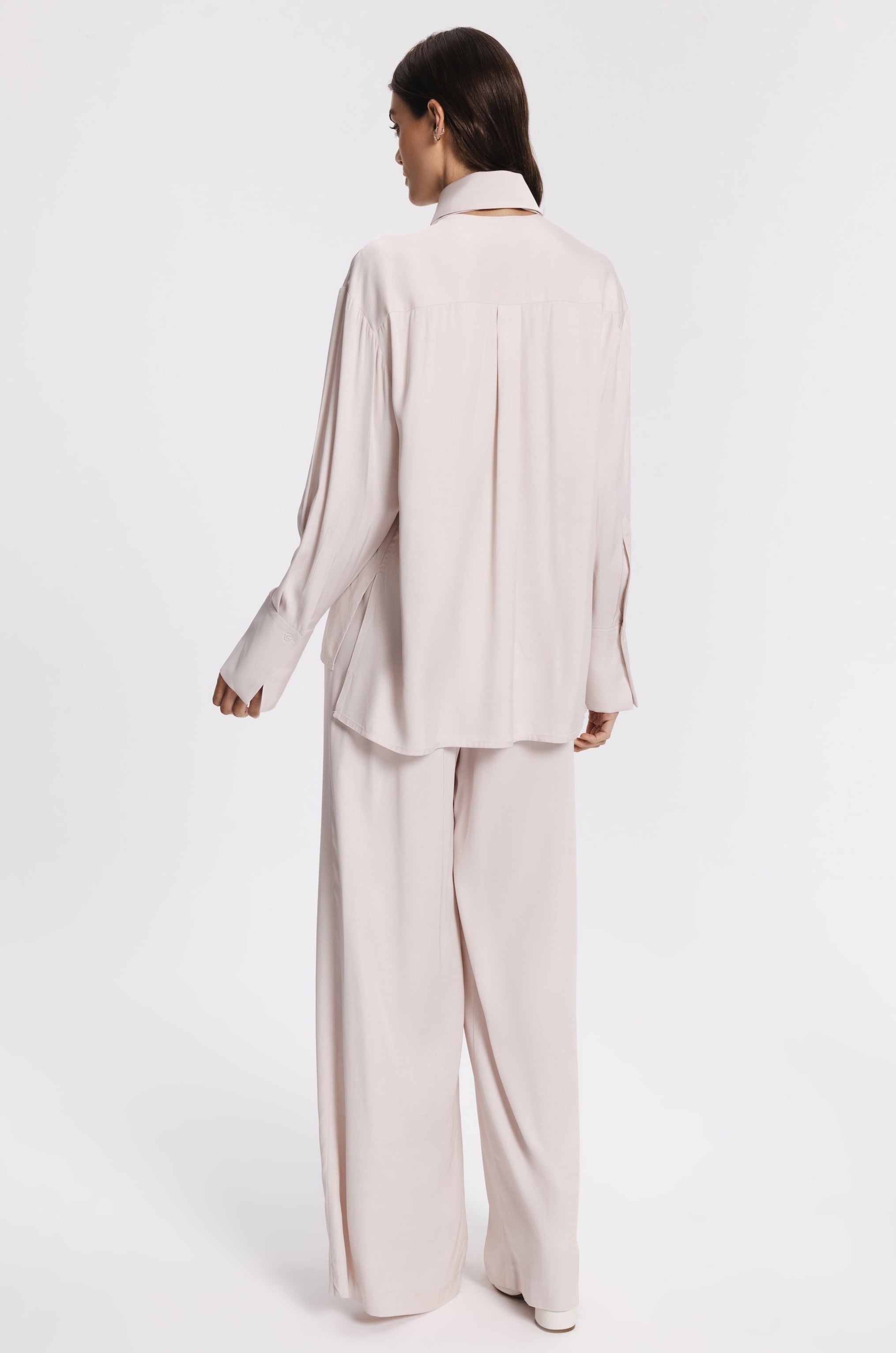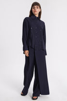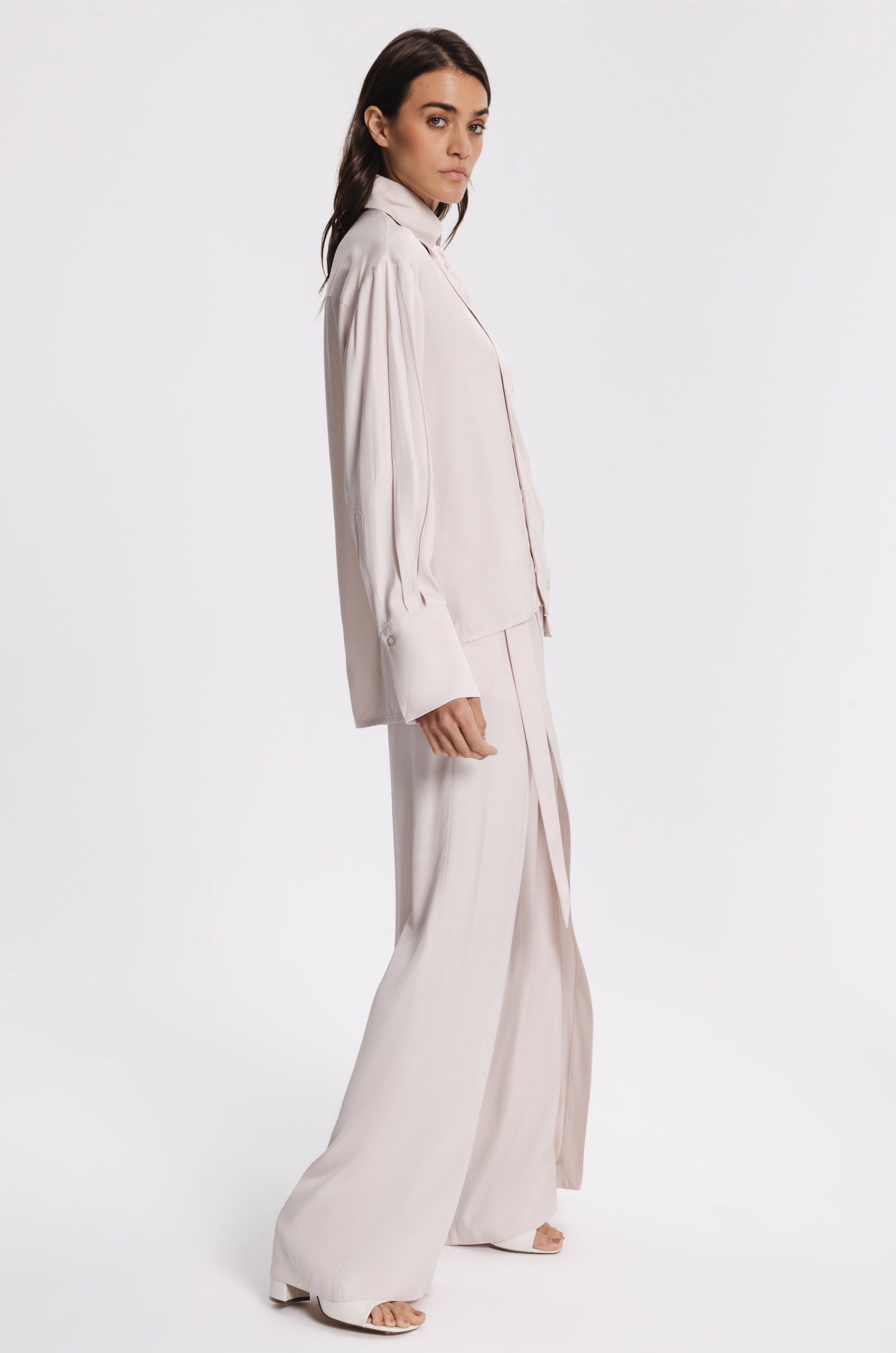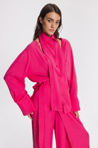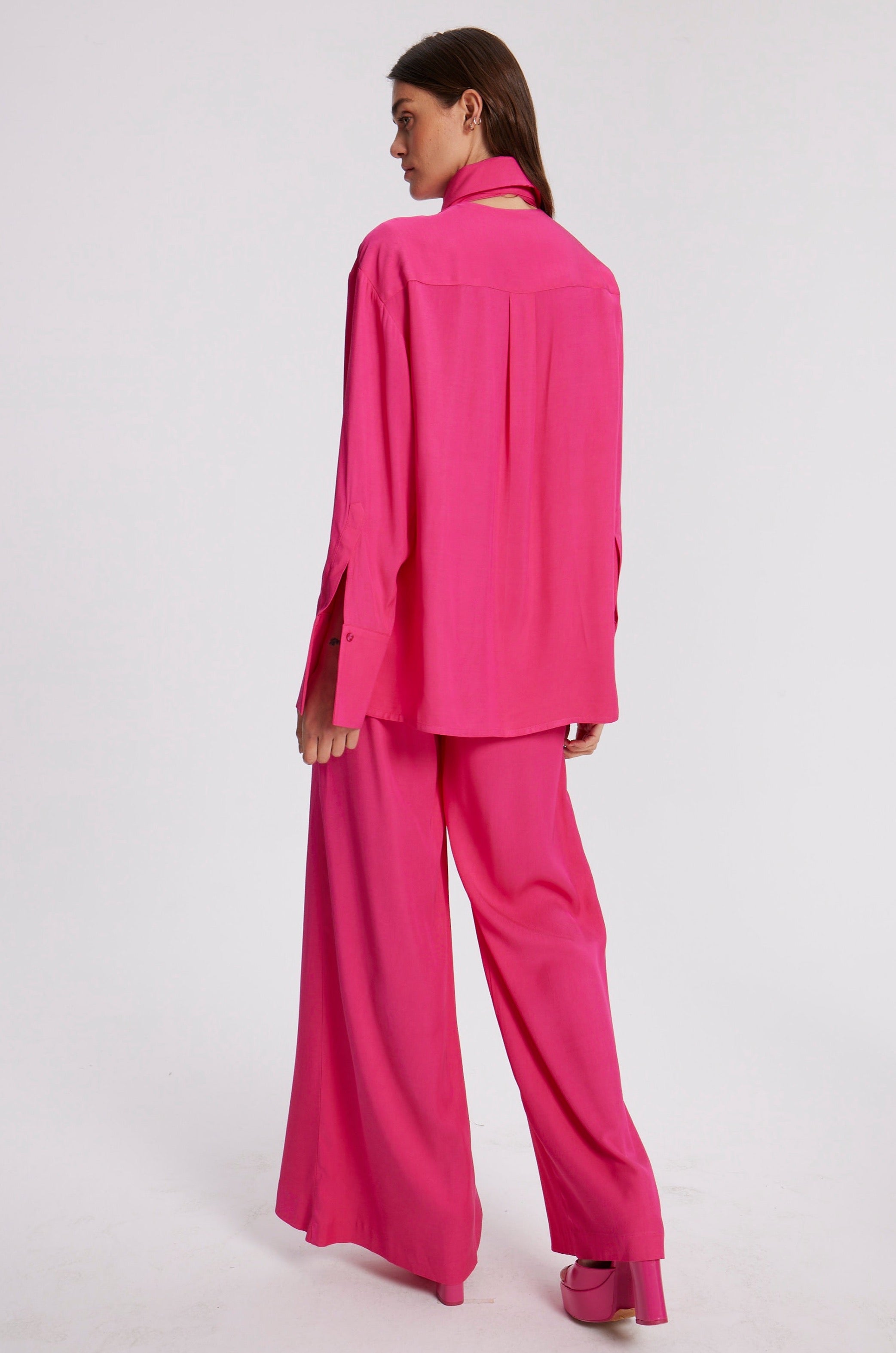 Relaxed-fit shirt with large cuffs. Front buttoning and two extra button lines on the front side that allow to customise the shirt in different ways. The collar line is open horizontally and can be detached.