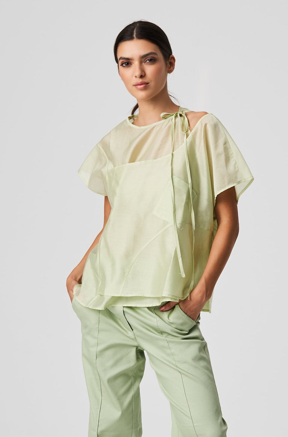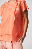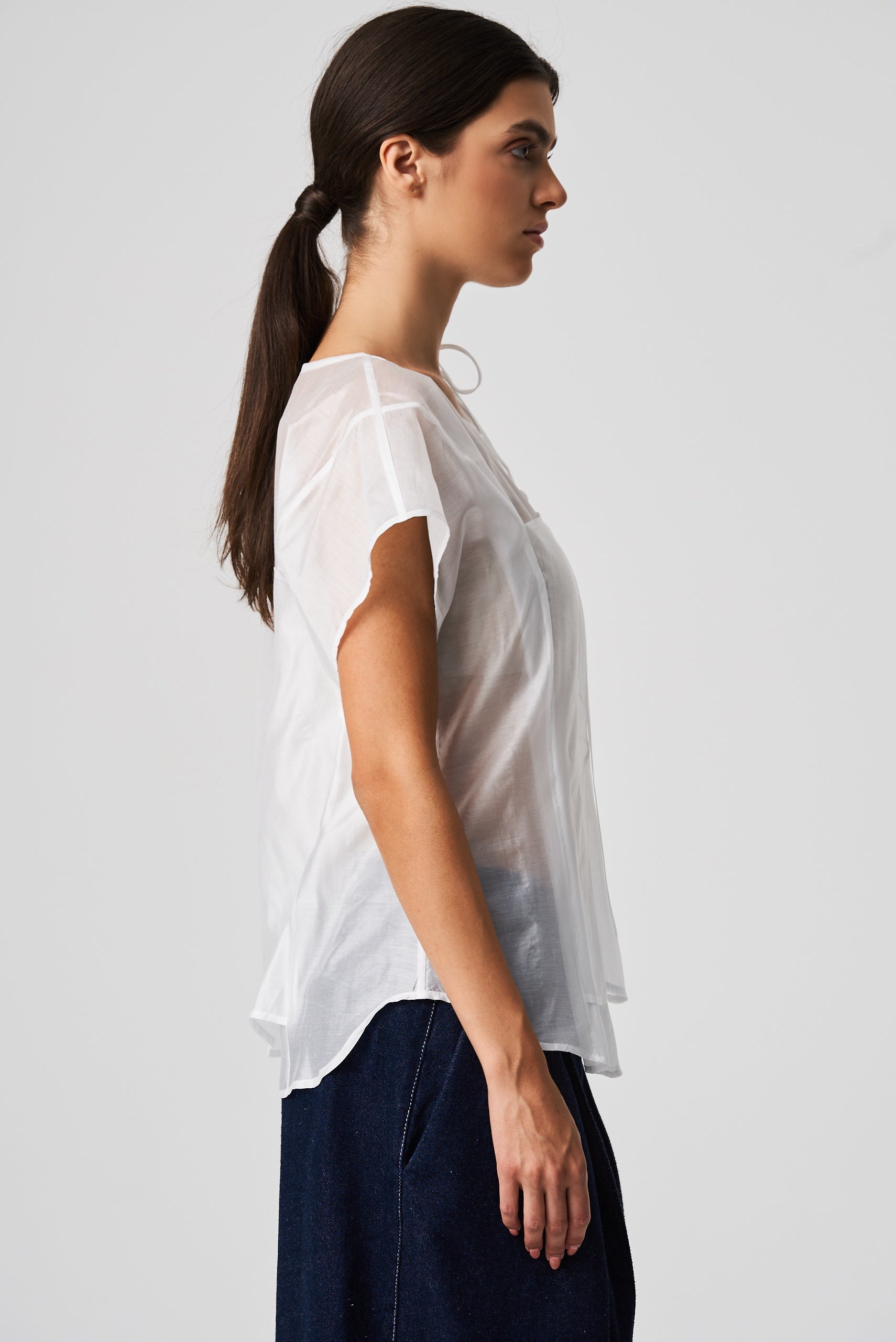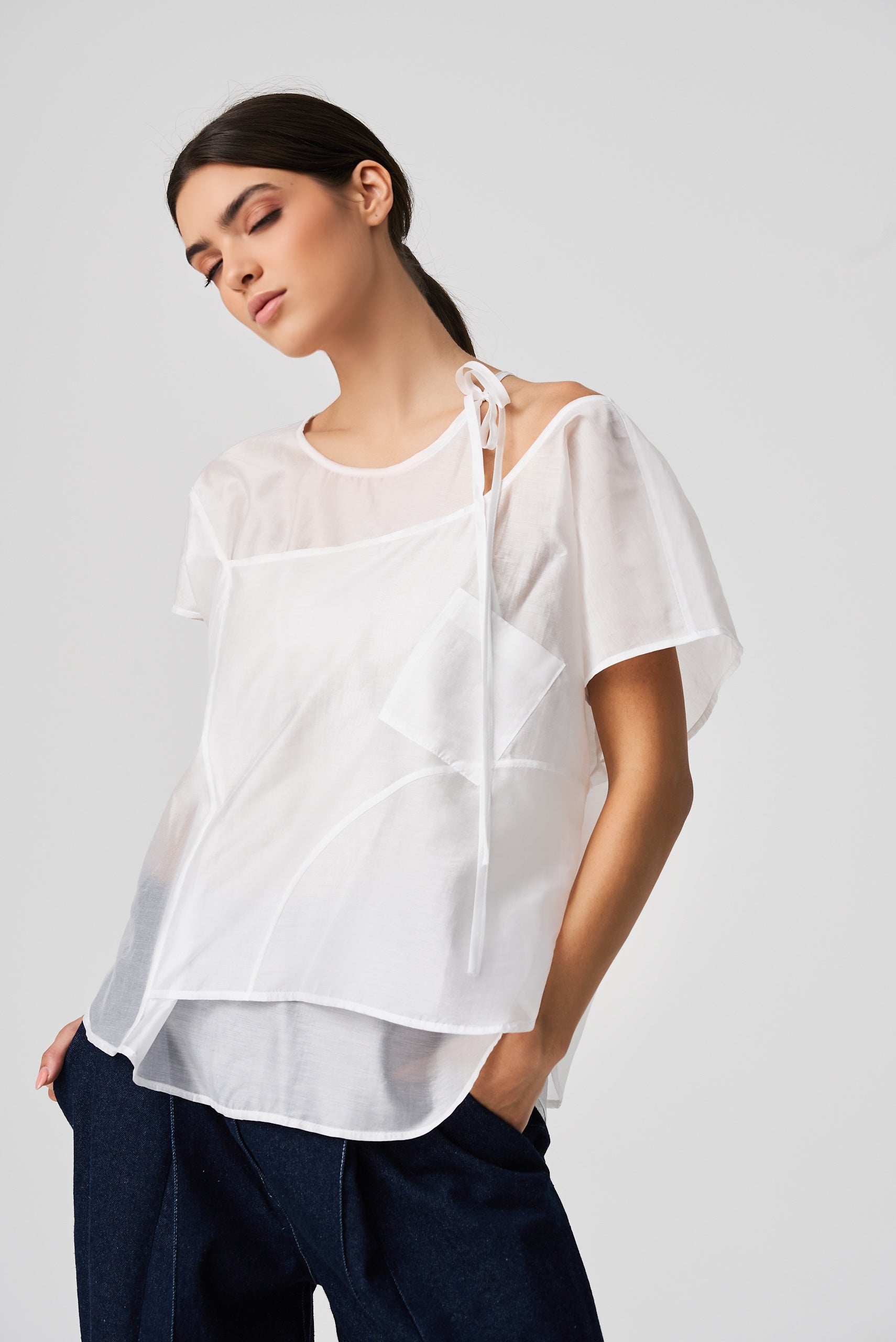 Lightweight top with short sleeves. The unique feature of this design is the two asymmetrically layered pieces. The top layer ties at the left shoulder. The hem is asymmetrical, and the pocket is positioned at an angle on the left side of the chest.