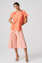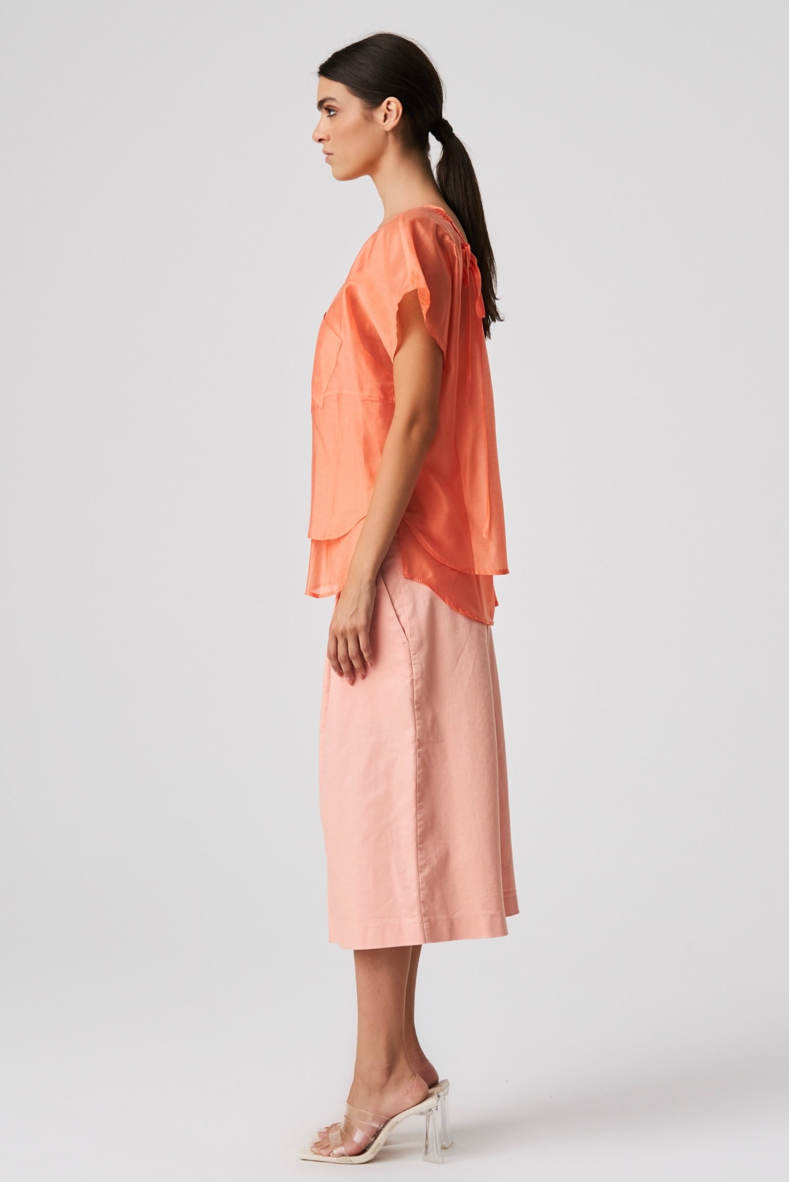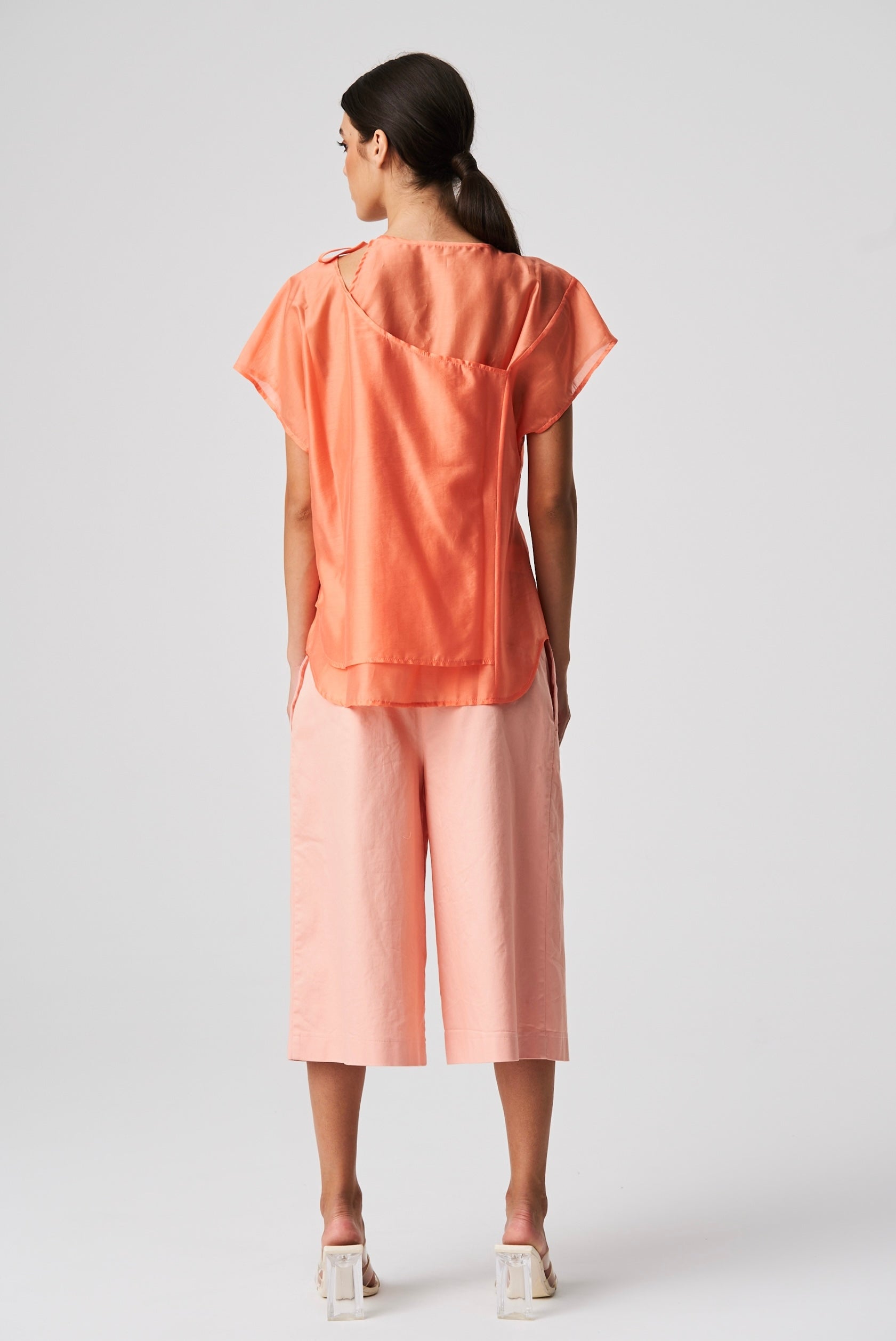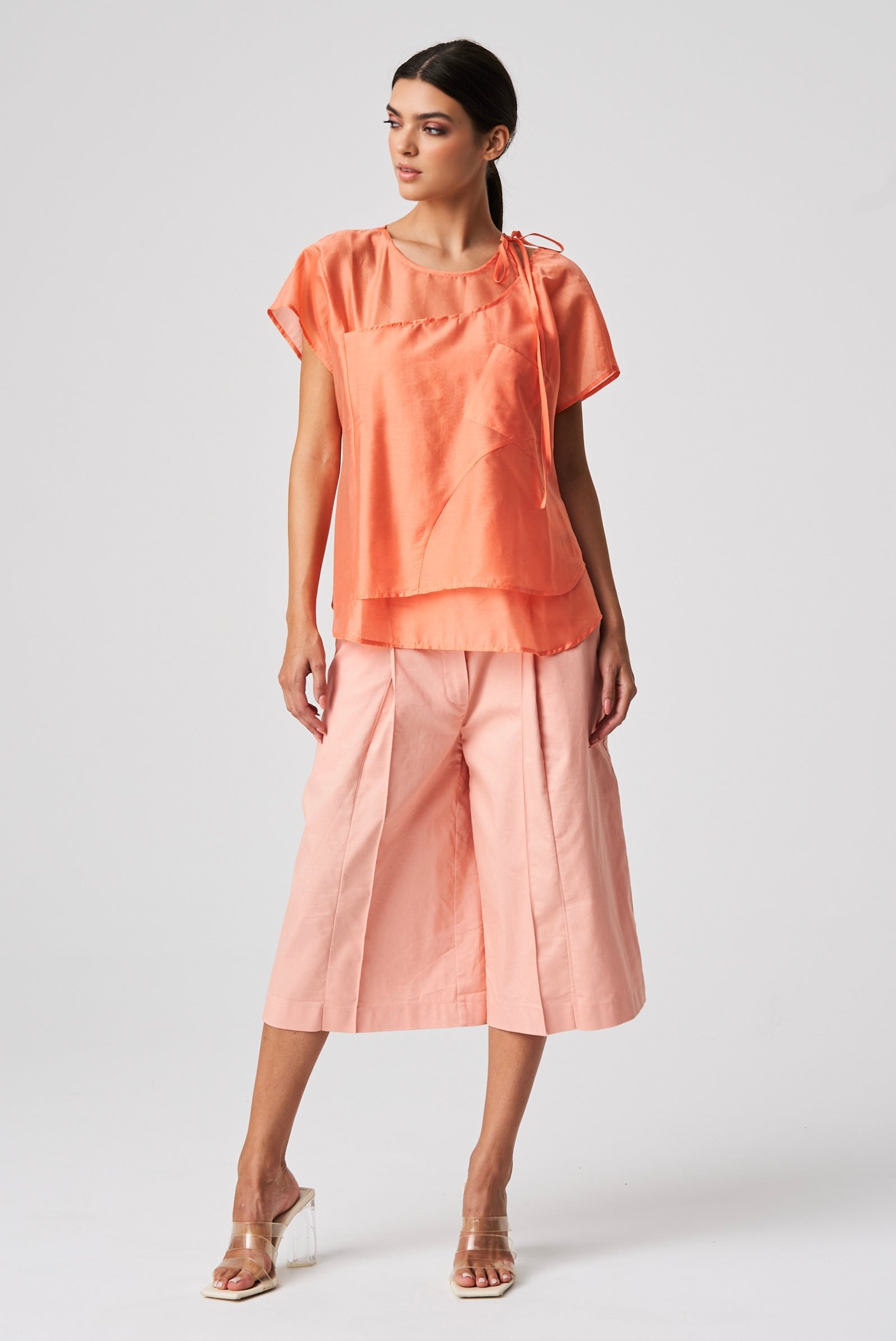 Lightweight top with short sleeves. The unique feature of this design is the two asymmetrically layered pieces. The top layer ties at the left shoulder. The hem is asymmetrical, and the pocket is positioned at an angle on the left side of the chest.