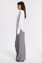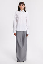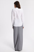 Regular-fit shirt with large cuffs. The particularity of this model is that the high line of the shoulders is open and fixed by button behind. The collar is separate from the shirt , except in the front.