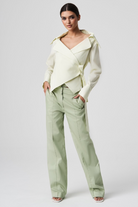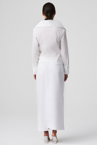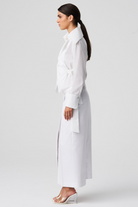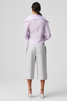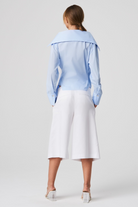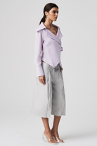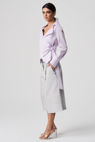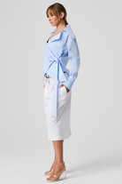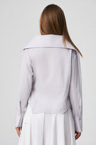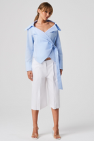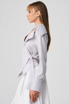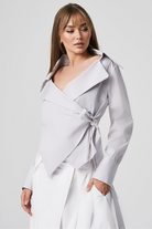Slim-fit short shirt with long sleeves. The front features a wrap style with a wide neckline. The closure is on the side with a tie, while the inner panel fastens with an internal small tie.