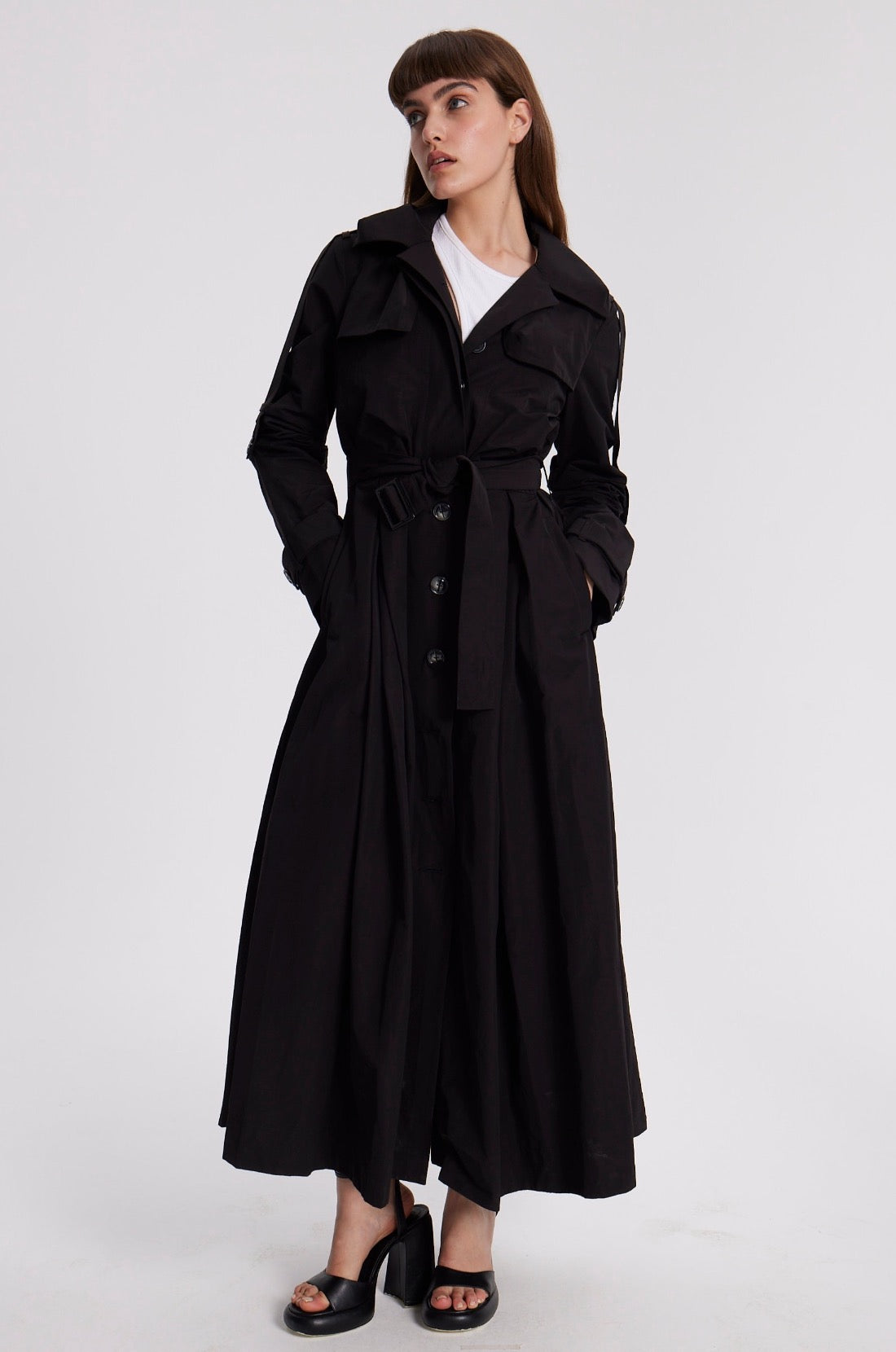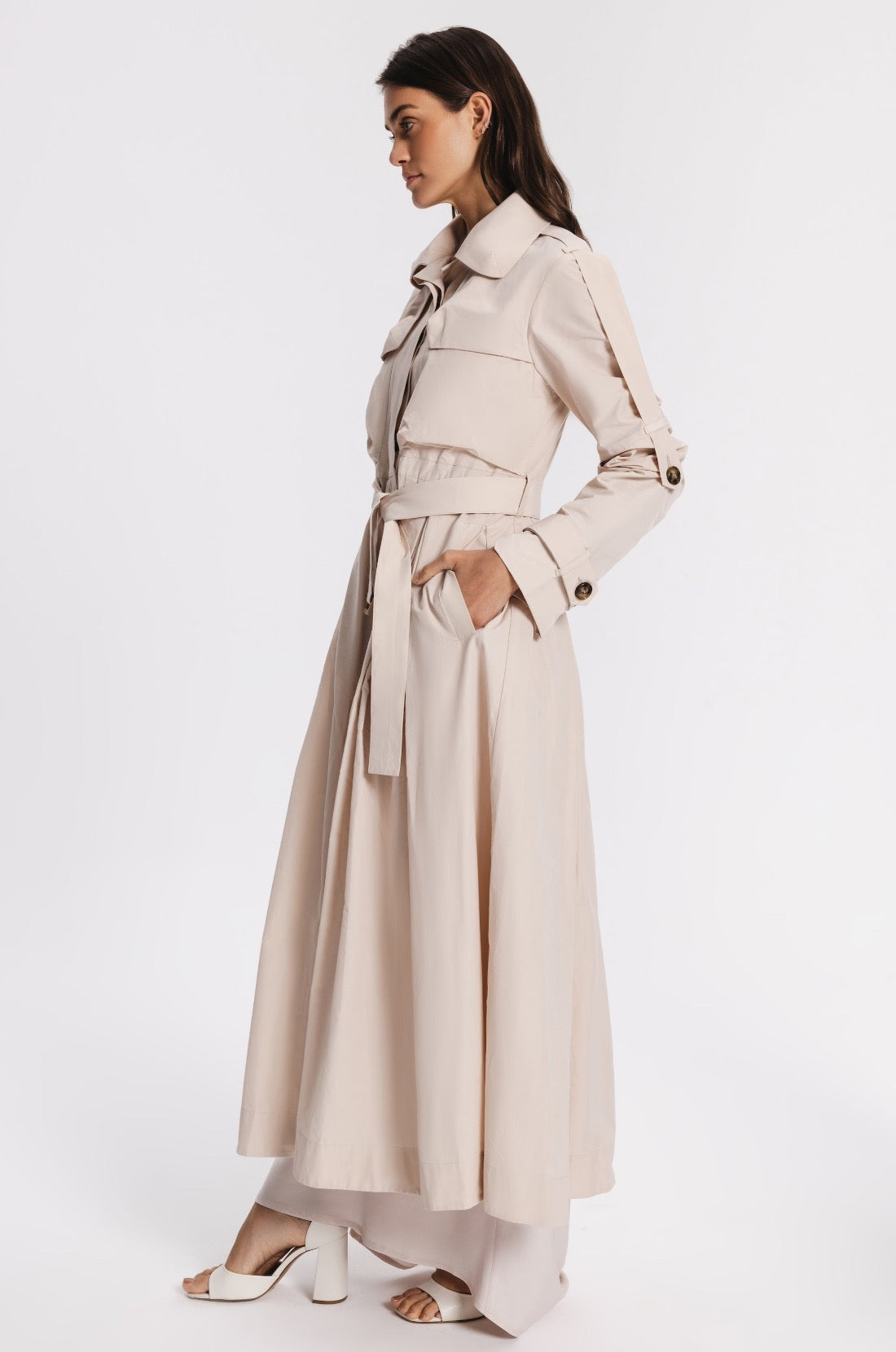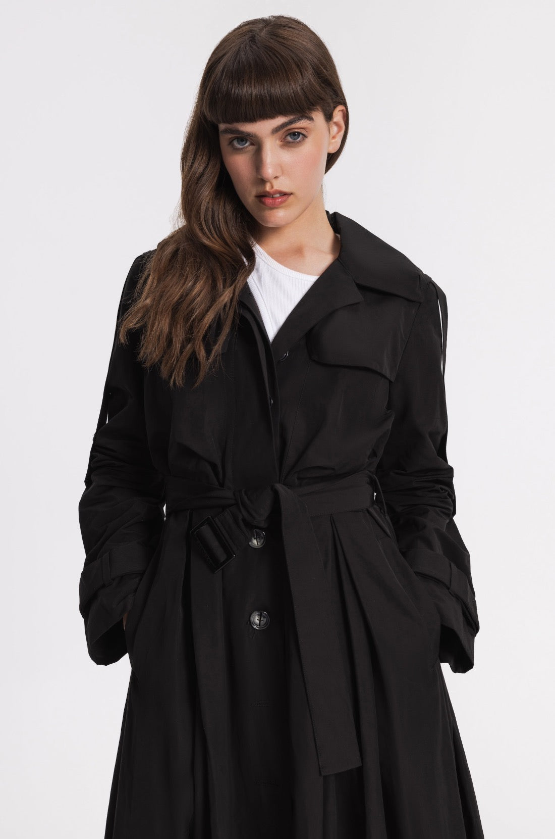 Unlinded slim-fit waterproof trench . Fitted at the waist with the belt and flared at the bottom.Two chest pockets, two side pockets. A decorative belt along the outer line of the sleeve that allows you to adjust the length of the sleeves.