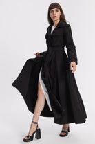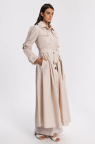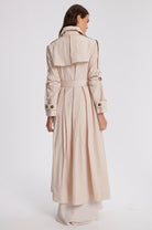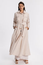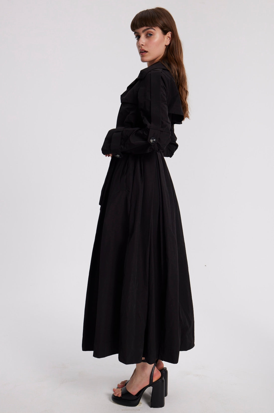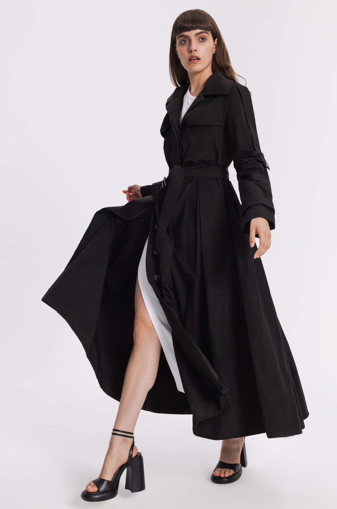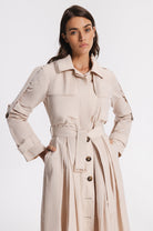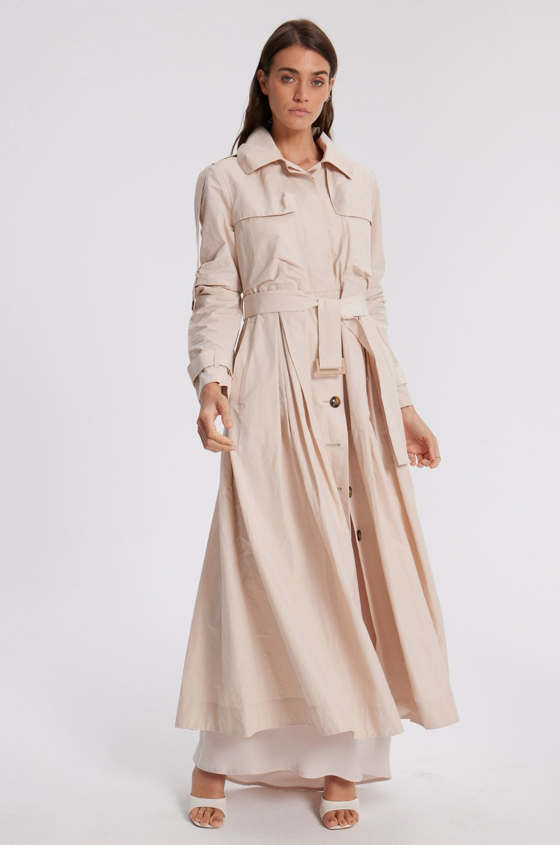 Unlinded slim-fit waterproof trench . Fitted at the waist with the belt and flared at the bottom.Two chest pockets, two side pockets. A decorative belt along the outer line of the sleeve that allows you to adjust the length of the sleeves.