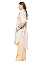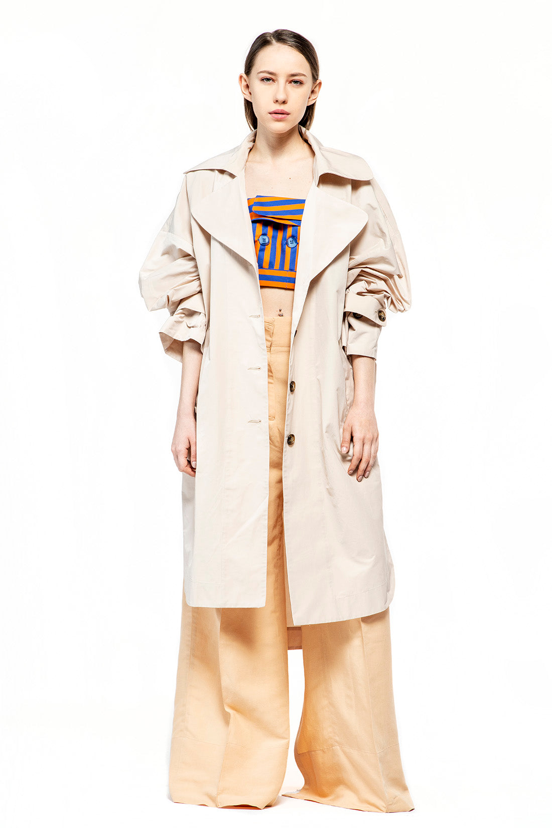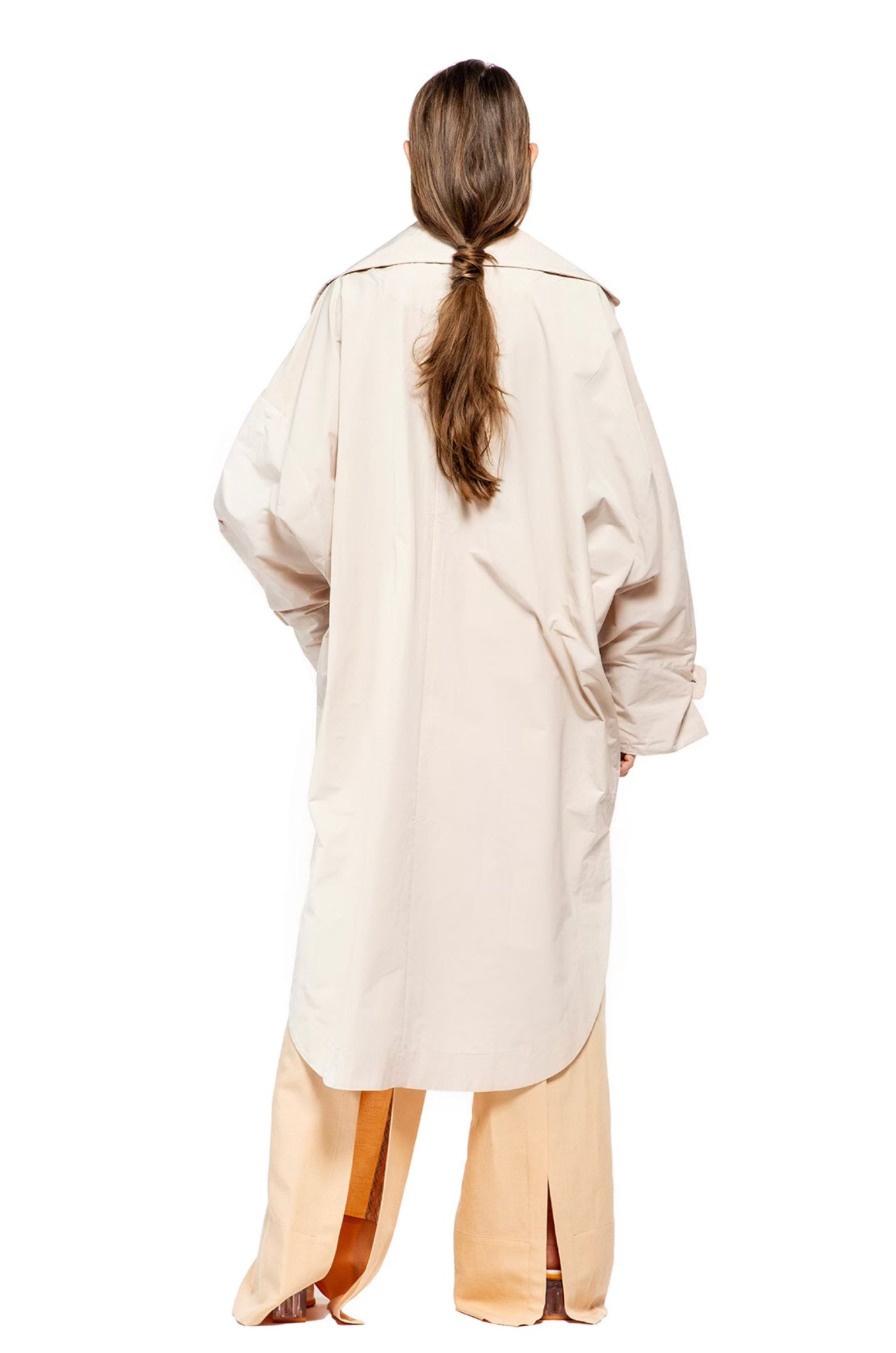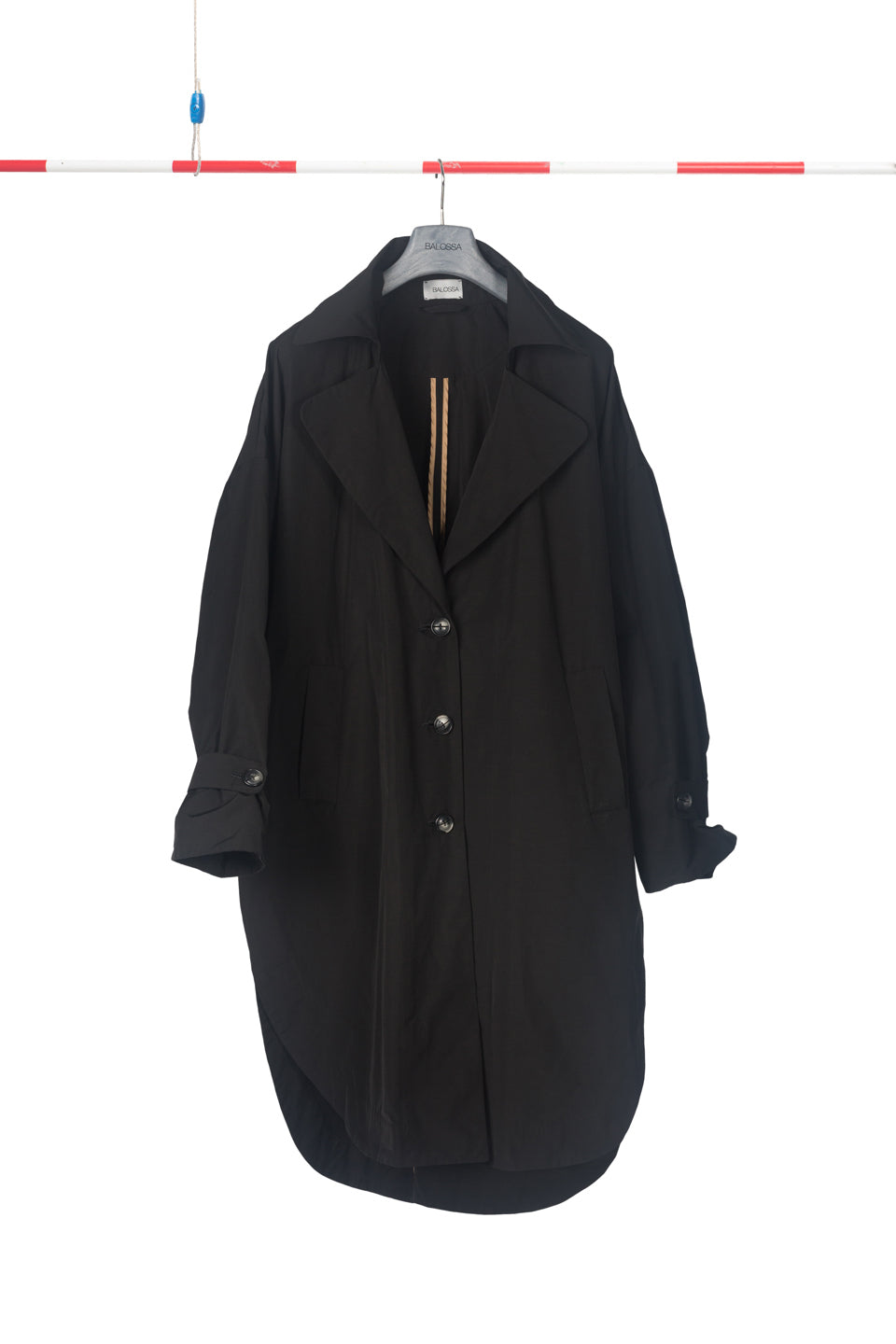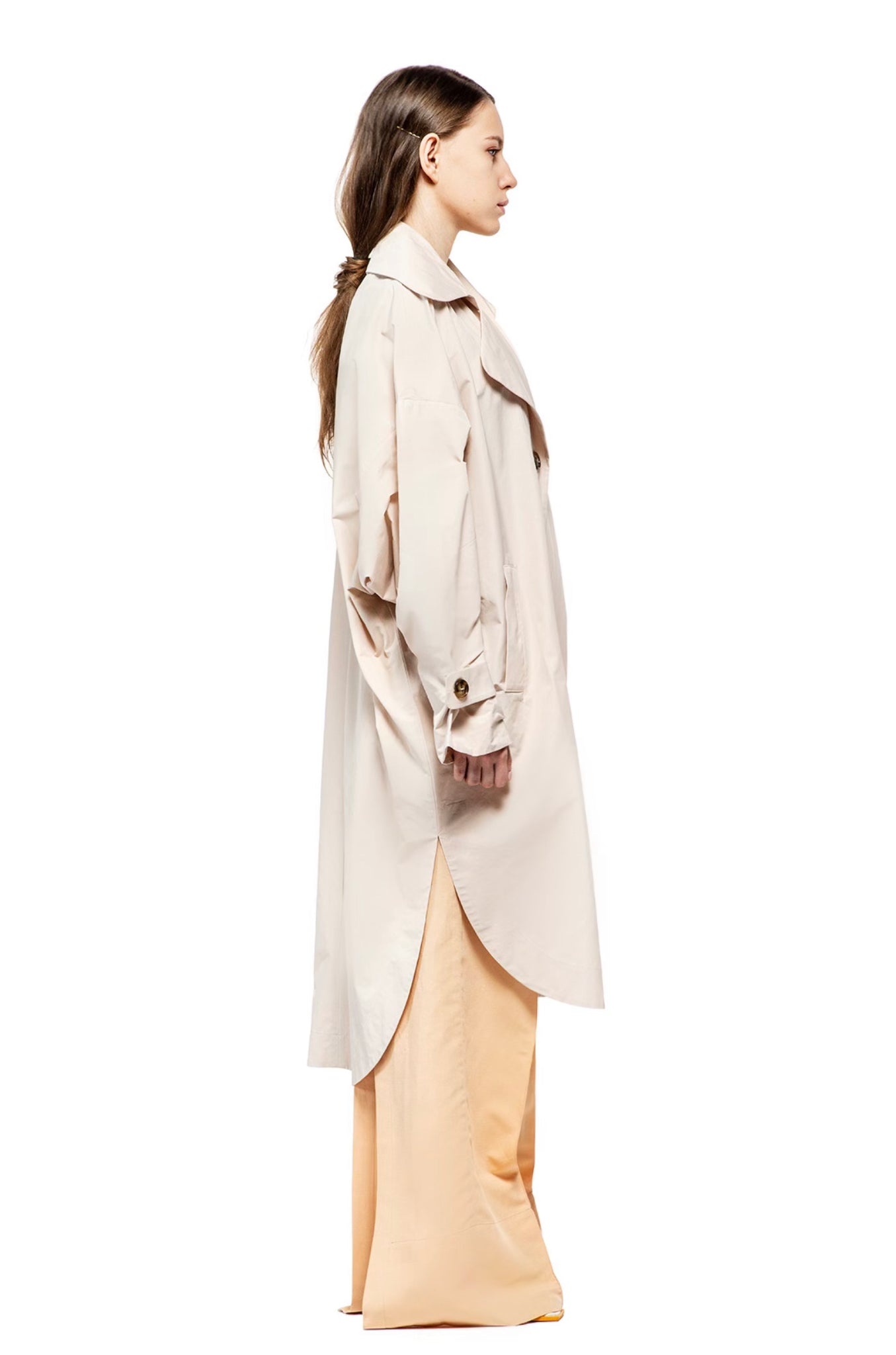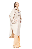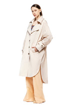 Rain proof over size trench coat with long sleeves, front buttoning, two side pockets