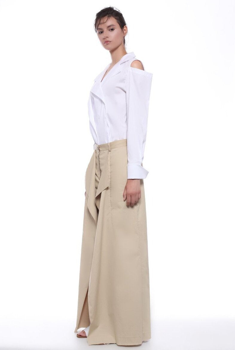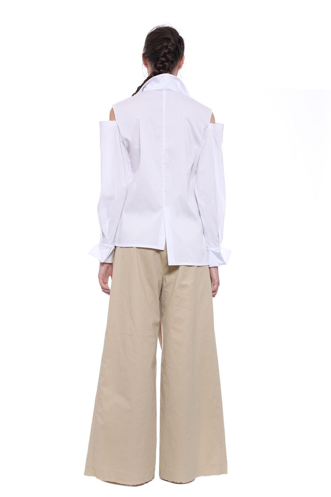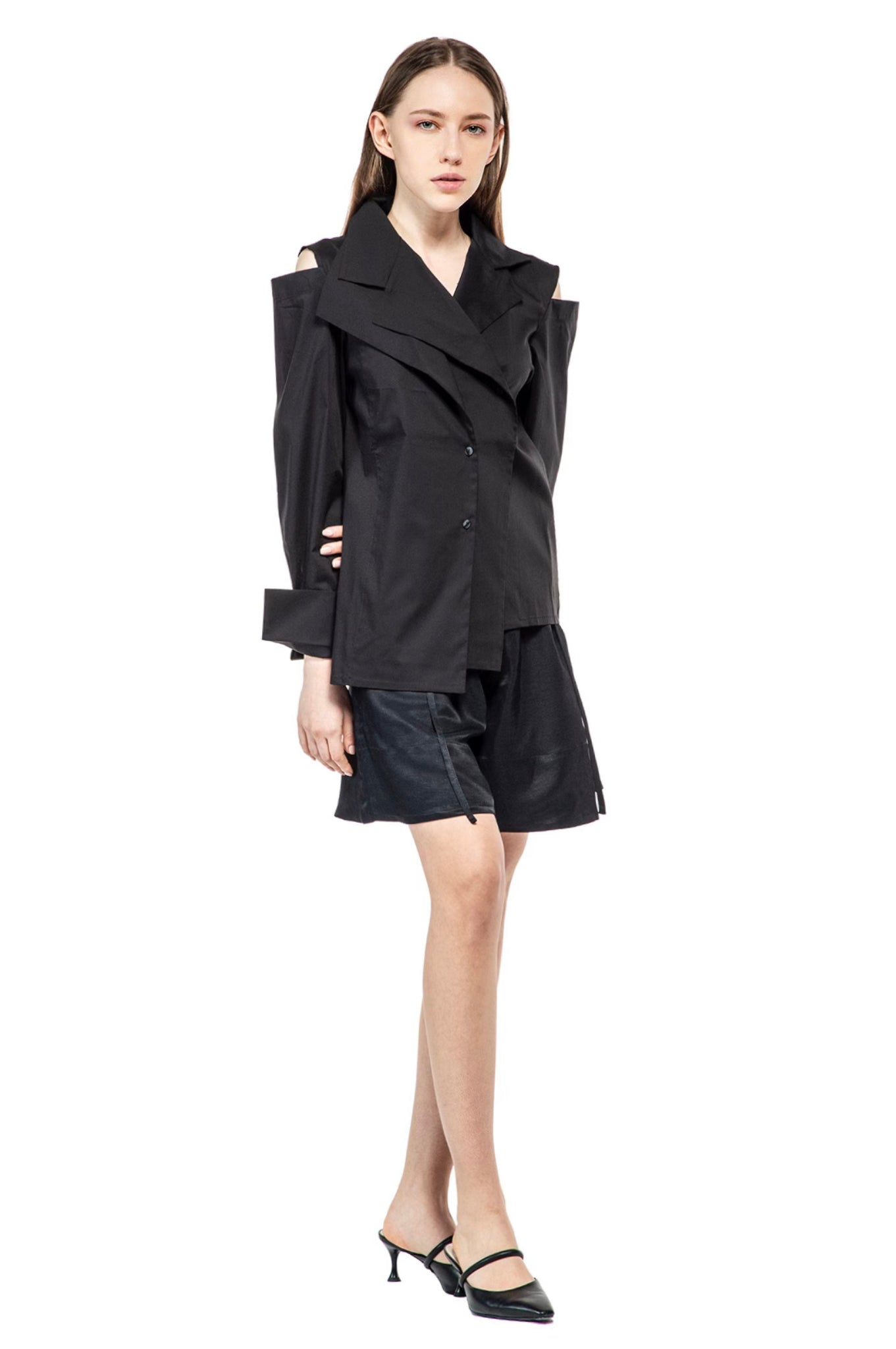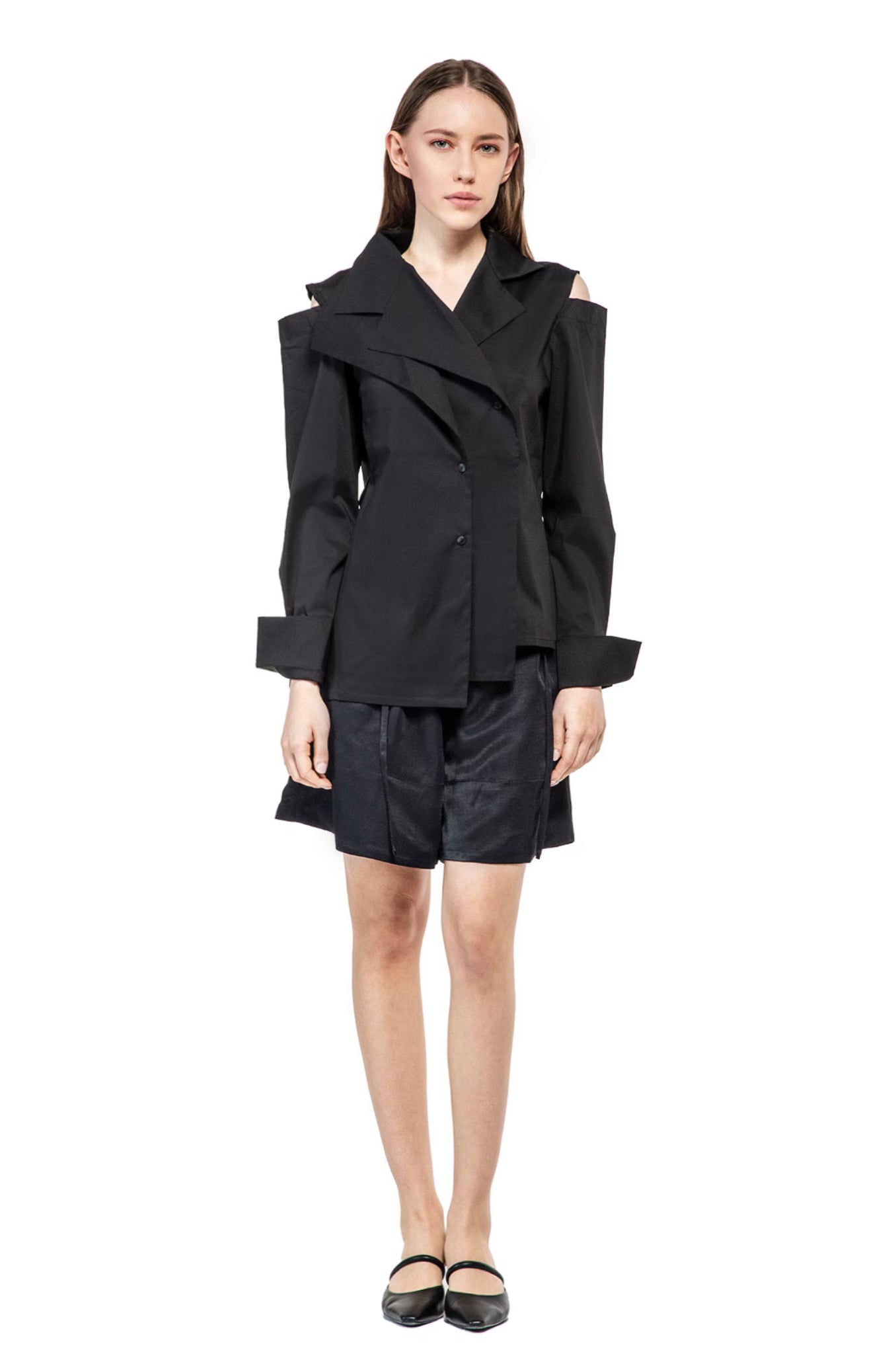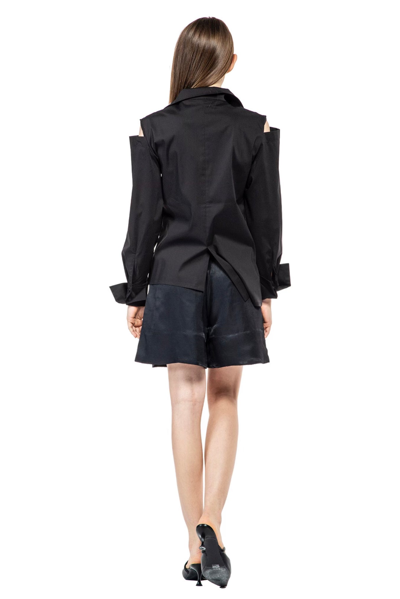 JACKET-INSPIRED SHIRT WITH STANDING COLLAR, LONG SLEEVES, OPEN SHOULDERS AND OVERLAPPING PANNELING AT THE FRONT WITH DOUBLE-BREASTED BUTTONING. MADE OF ELASTICIZED POPLIN. DESIGNED TO GIVE TO YOUR OUTFIT A TOUCH OF AVANT-GARDE.