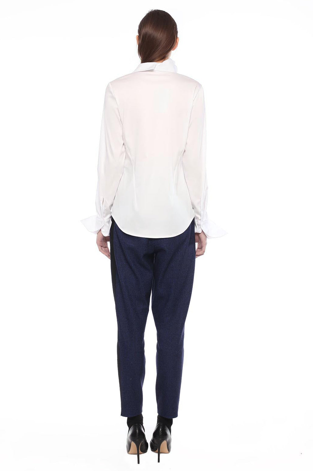ELEGANT STRETCH COTTON POPLIN SHIRT WITH A RAW CUT RUFFLE IN FRONT.