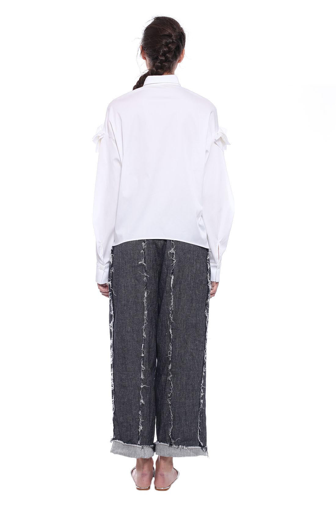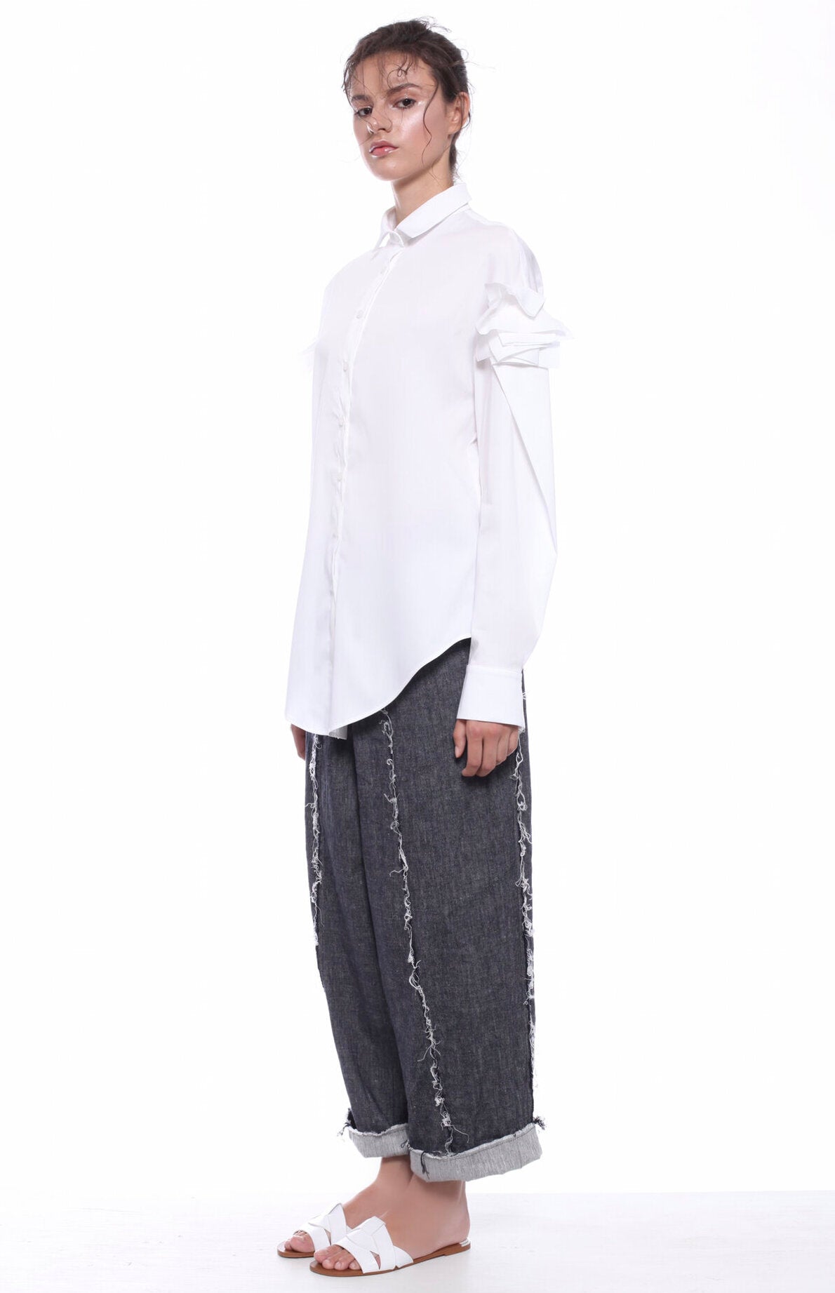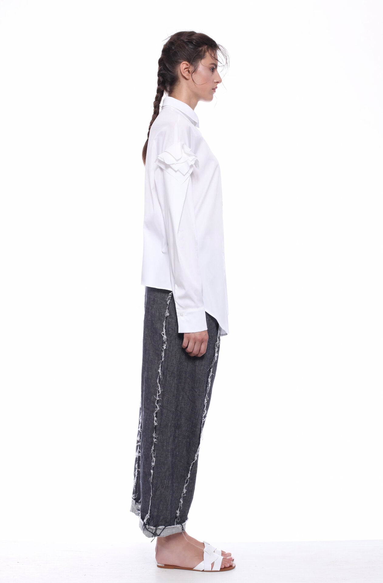 ELEGANT SHIRT WITH LONG SLEEVES, DECORATED WITH A RAW CUT FRILL GATHERING ON UPPER ARM. RAISED REAR, DESIGNED TO GIVE REFINEMENT TO A CASUAL LOOK.