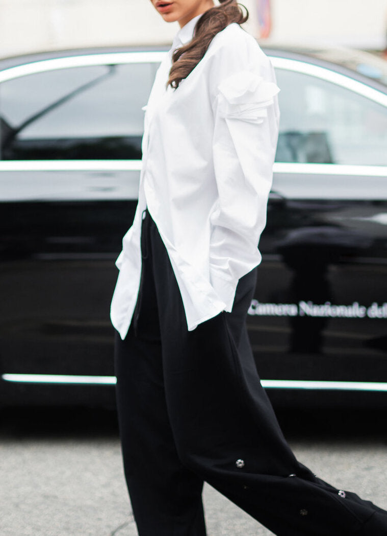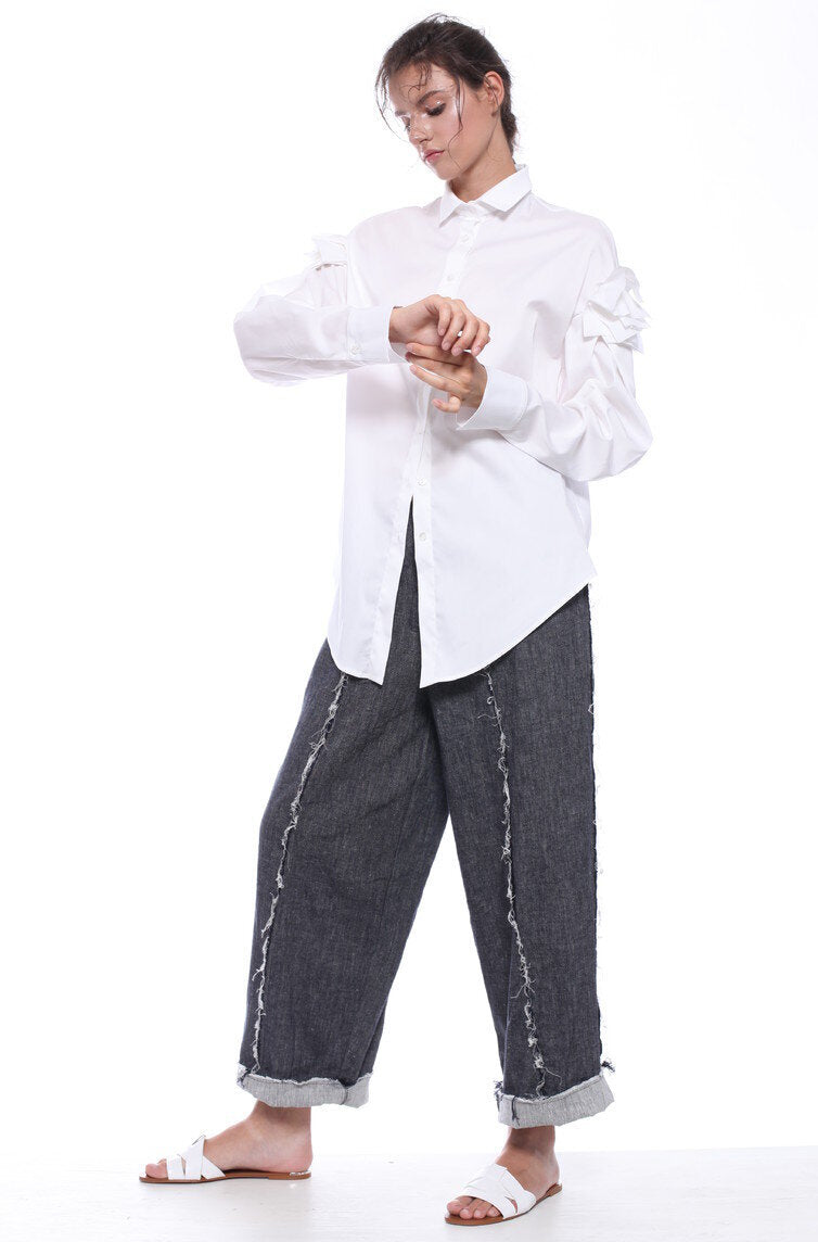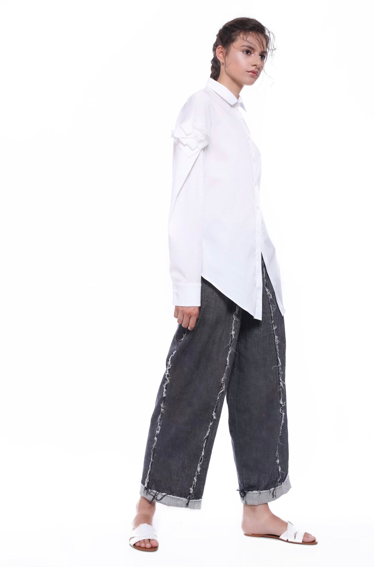ELEGANT SHIRT WITH LONG SLEEVES, DECORATED WITH A RAW CUT FRILL GATHERING ON UPPER ARM. RAISED REAR, DESIGNED TO GIVE REFINEMENT TO A CASUAL LOOK.