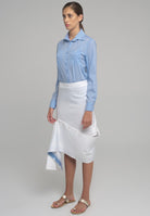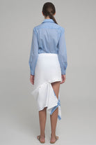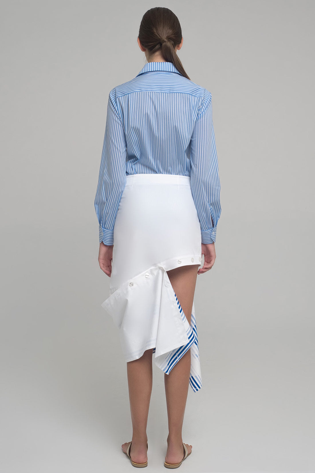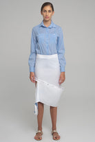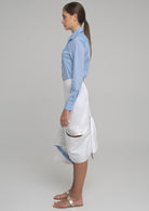 CONTEMPORARY SKIR WITH BLUE PRINT BAND WHICH ATTACHES WITH BUTTONS. THE BAND CAN BE MODYFIED IN DIFFERENT WAYS.