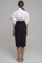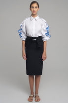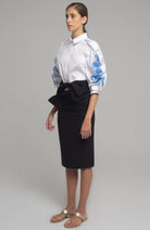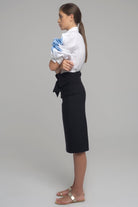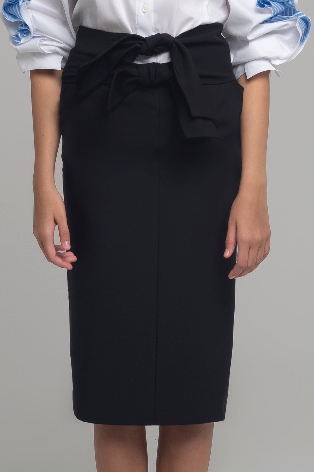 KNEE-LENGTH SKIRT IN STRETCH FABRIC WITH WAIST BAND THAT CLOSES TO FORM A BOW. INVISIBLE ZIP ON THE BACK SIDE.