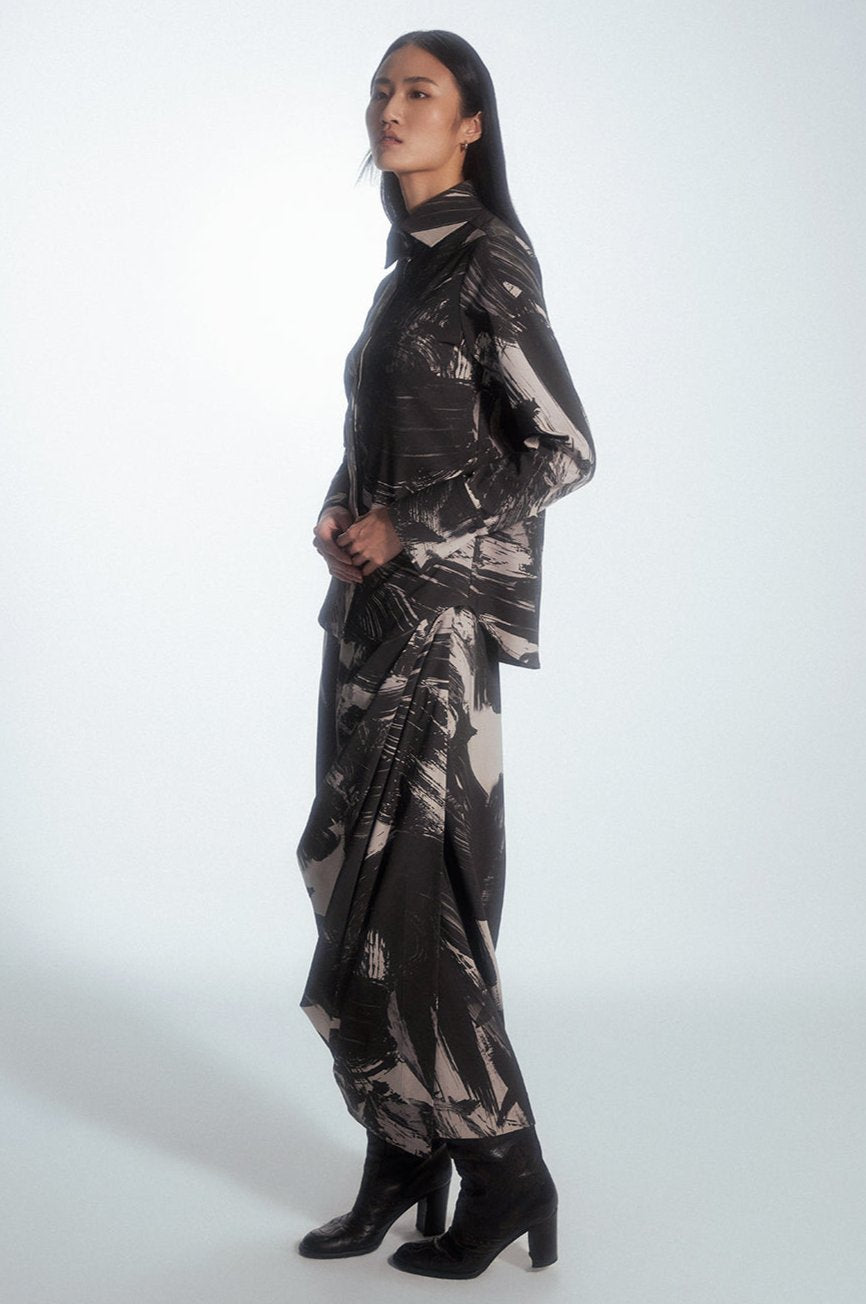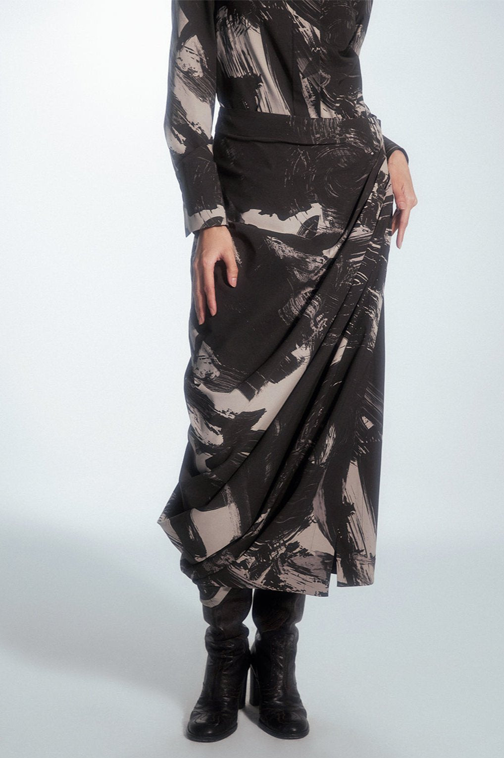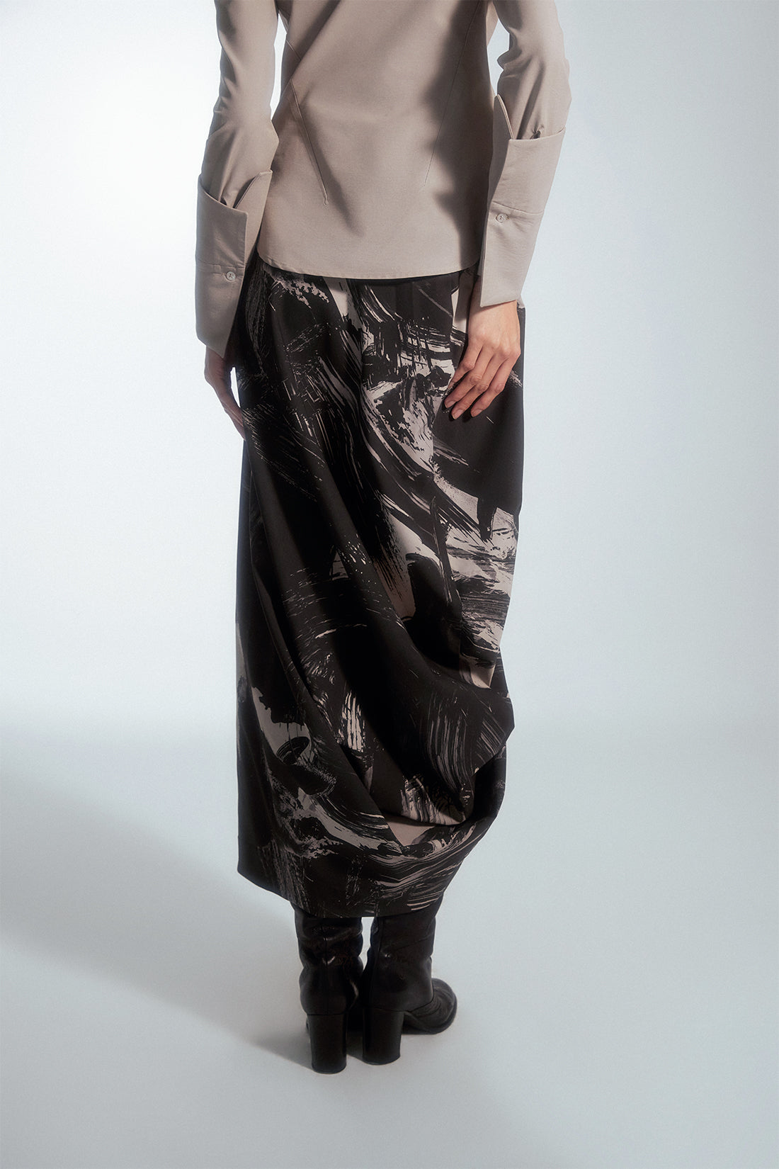 Straight-cut midi skirt in printed fabric. The skirt features overlapping panels, with the upper panel draped to create a deep side slit. Side closure with 4 snap buttons.