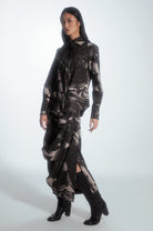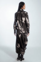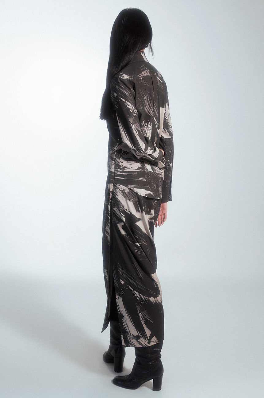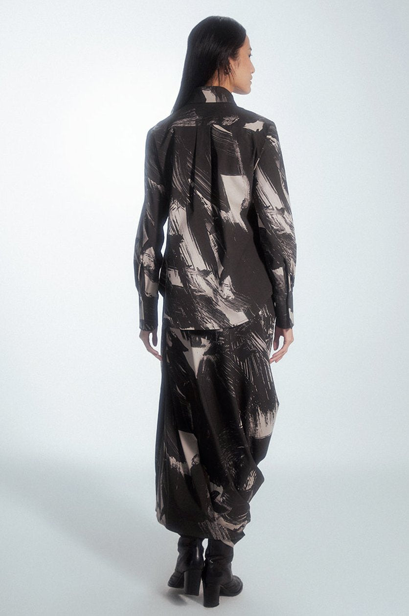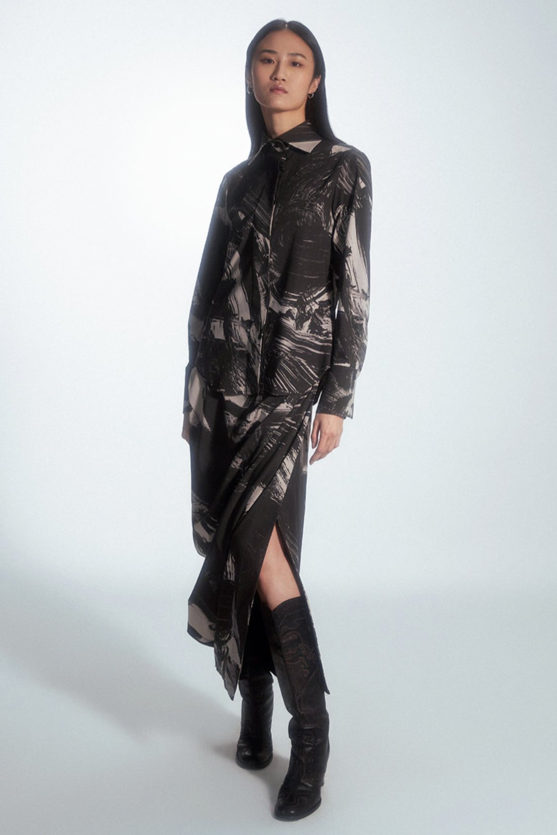 Straight-cut midi skirt in printed fabric. The skirt features overlapping panels, with the upper panel draped to create a deep side slit. Side closure with 4 snap buttons.