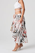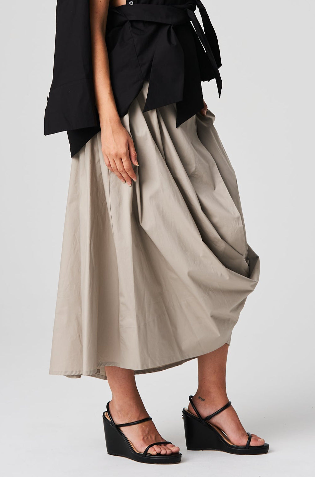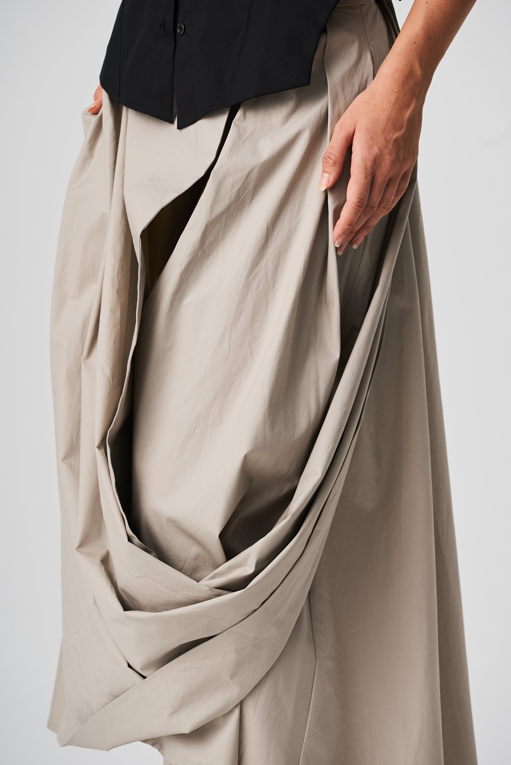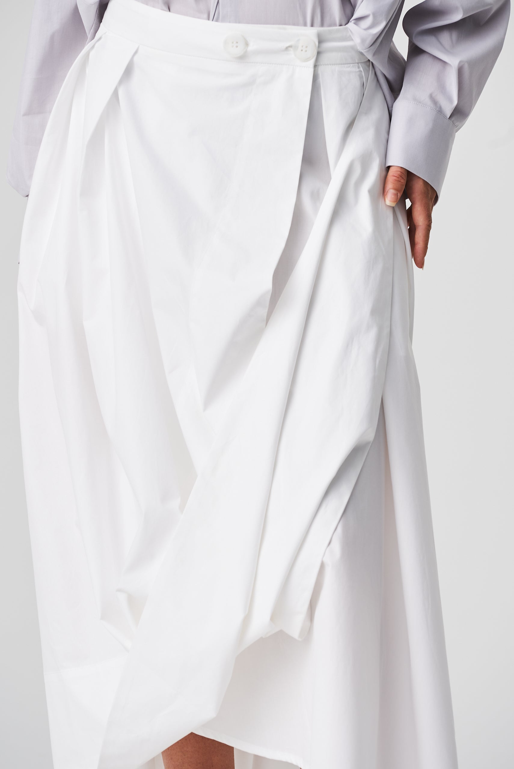 Midi flared wrap skirt with a side closure featuring two buttons at the waistline. The unique detail of this piece: the front corner of the skirt has a strap with three buttonholes, which is used to fasten it to the opposite side at the waist with a button. This creates a ruffle effect at the front. The length of the skirt can be adjusted.