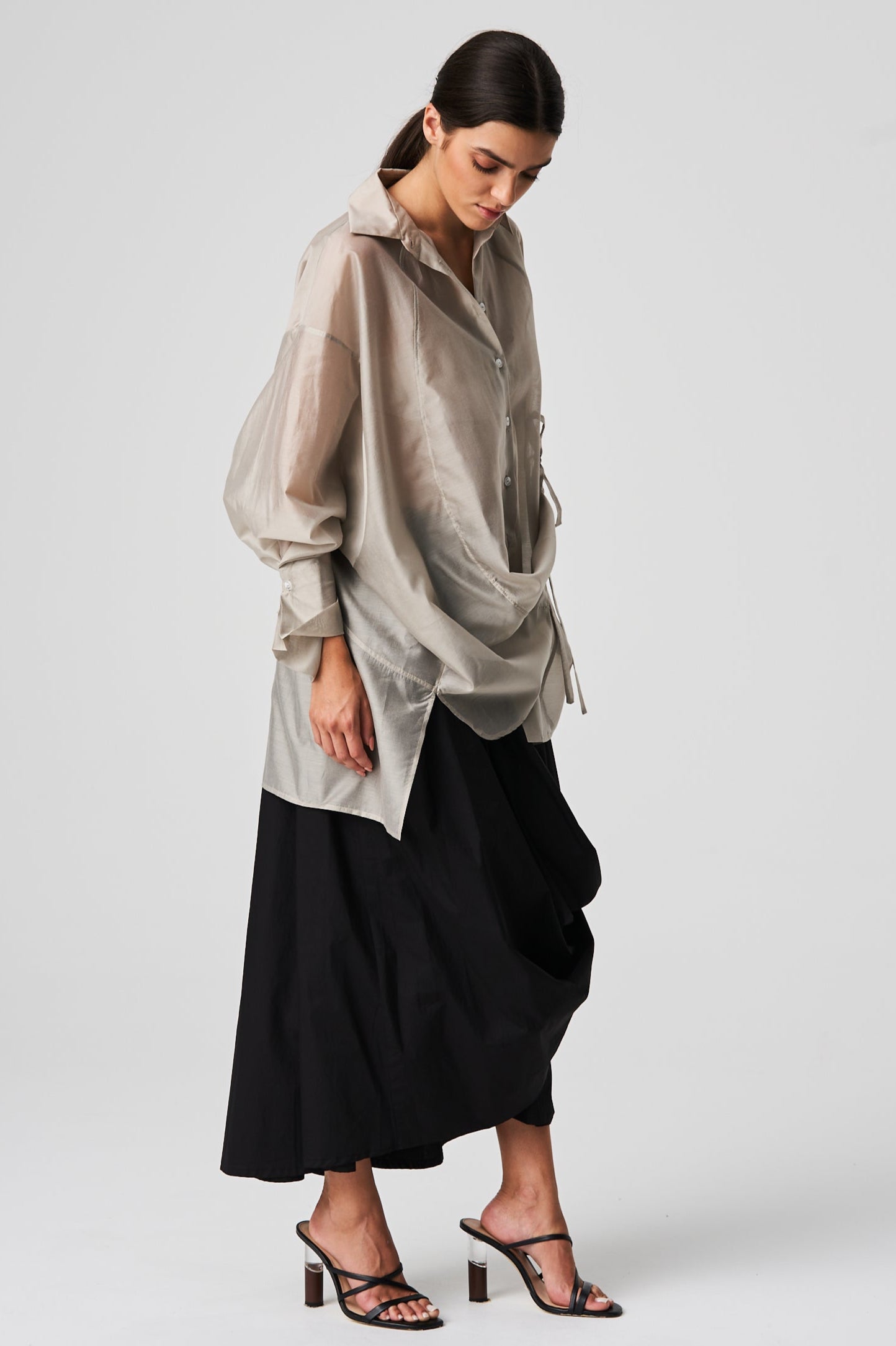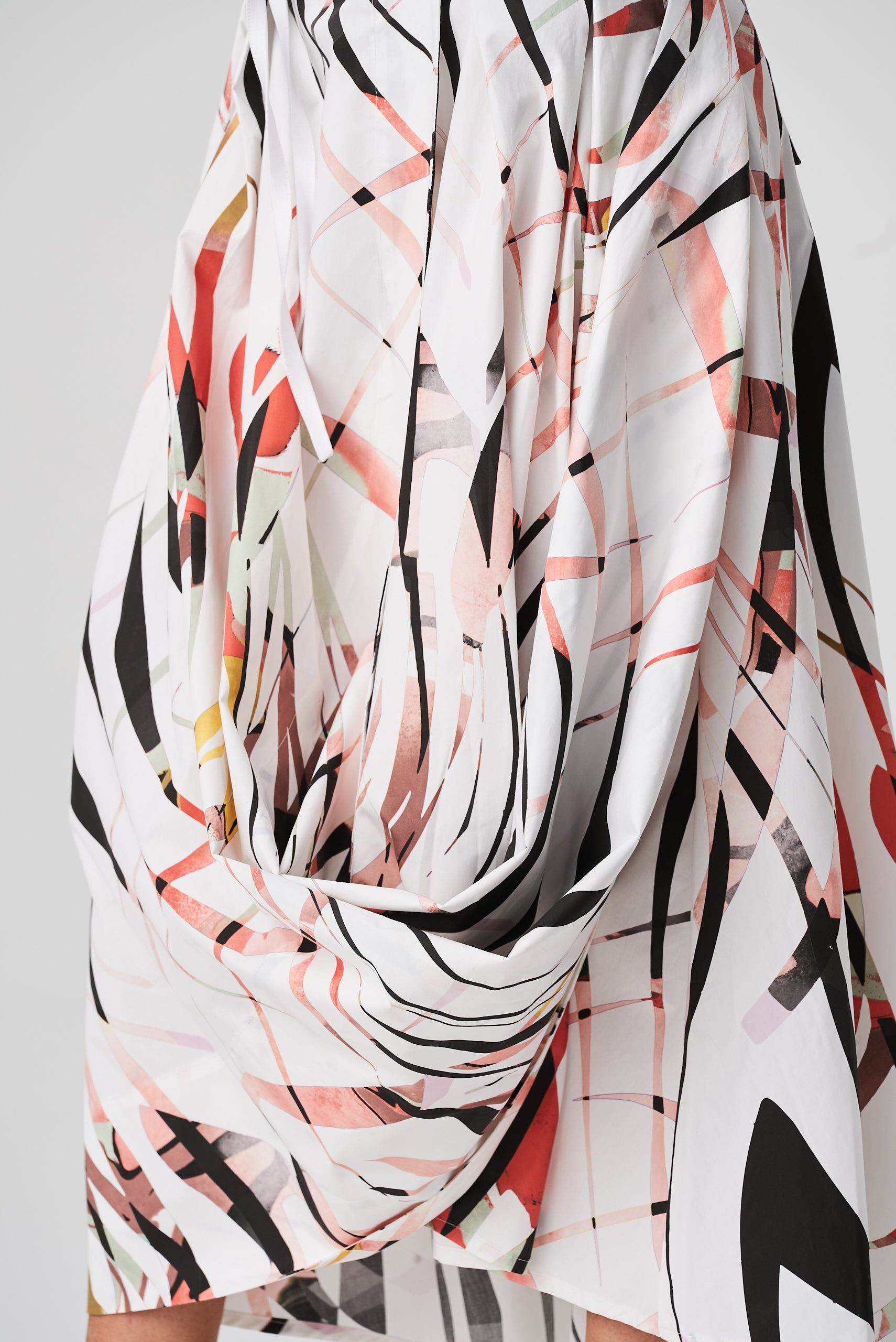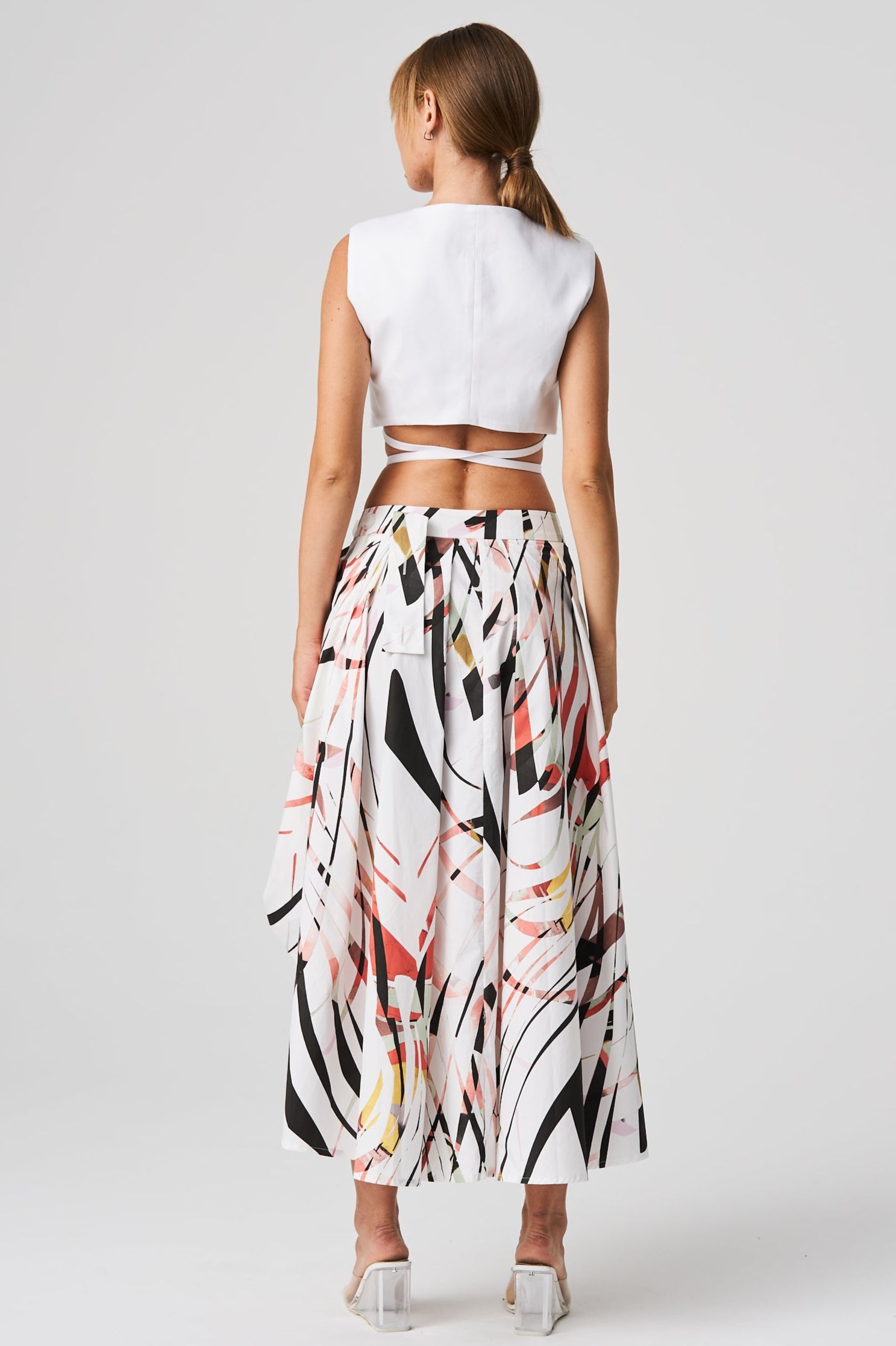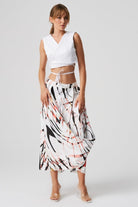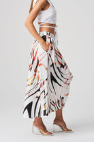 Midi flared wrap skirt with a side closure featuring two buttons at the waistline. The unique detail of this piece: the front corner of the skirt has a strap with three buttonholes, which is used to fasten it to the opposite side at the waist with a button. This creates a ruffle effect at the front. The length of the skirt can be adjusted.