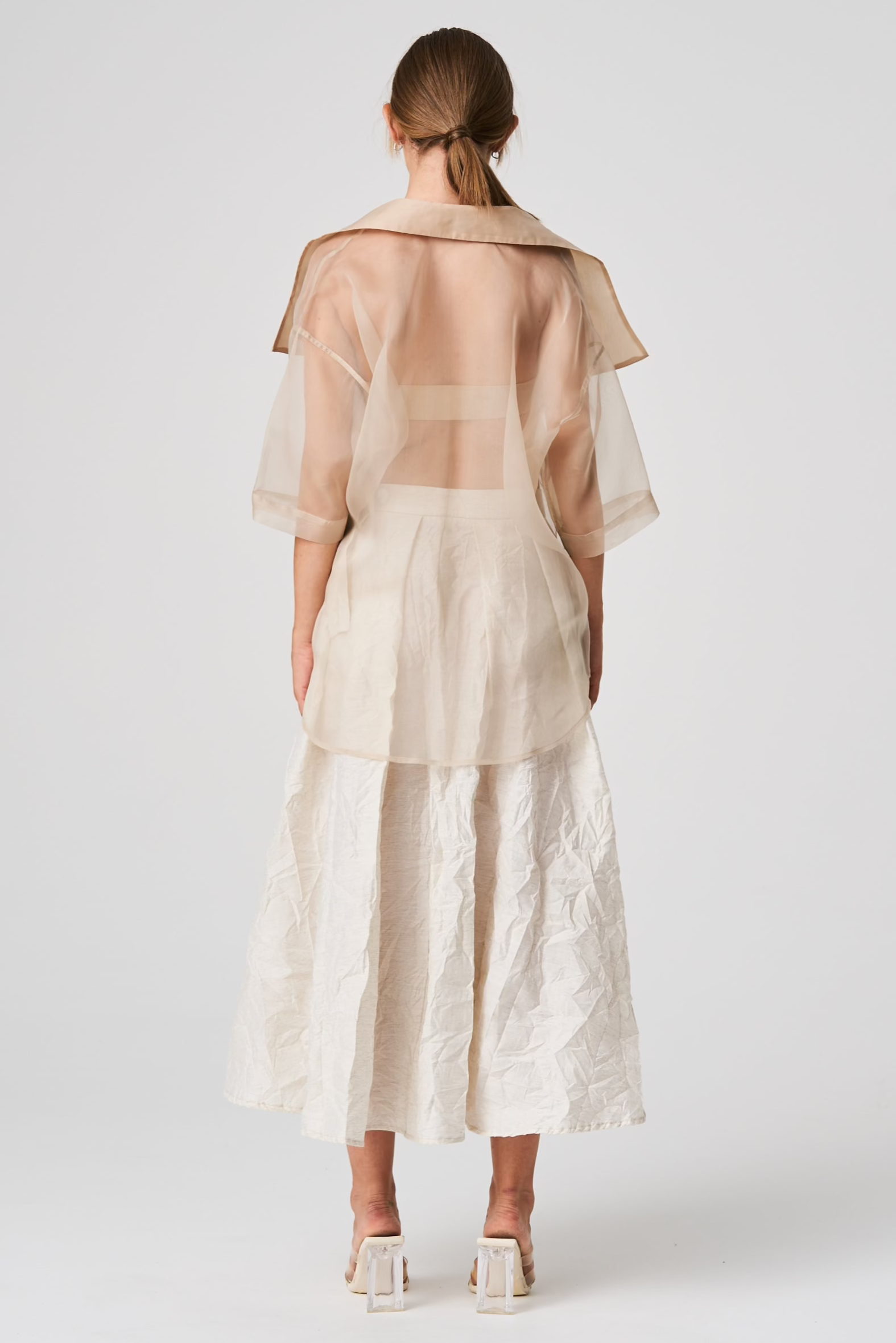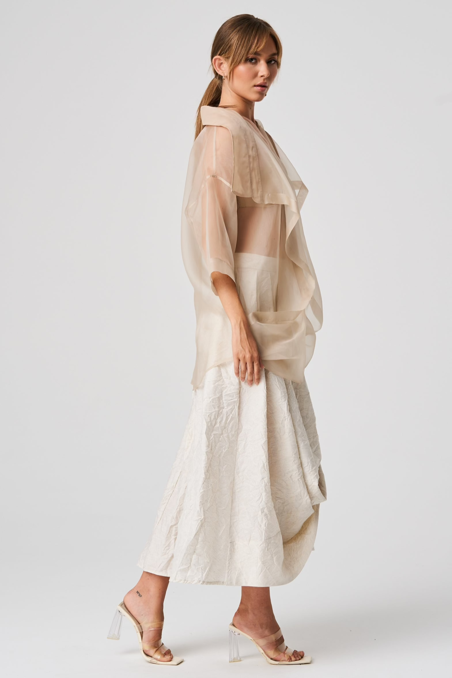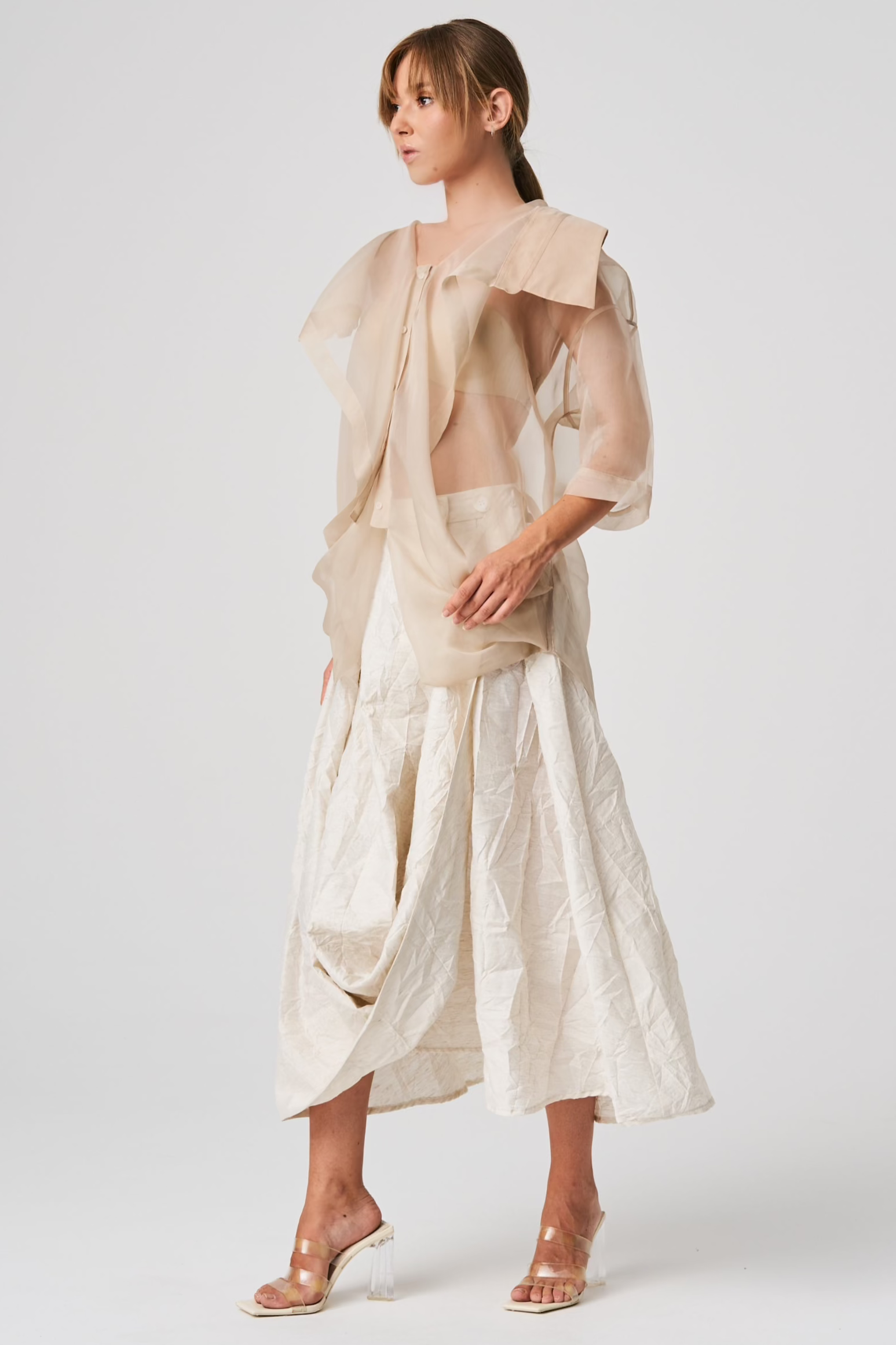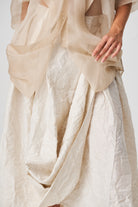 Midi flared wrap skirt with a side closure featuring two buttons at the waistline. The unique detail of this piece: the front corner of the skirt has a strap with three buttonholes, which is used to fasten it to the opposite side at the waist with a button. This creates a ruffle effect at the front. The length of the skirt can be adjusted.The fabric has a crinkled and crisp effect that gives the skirt an unusual look.