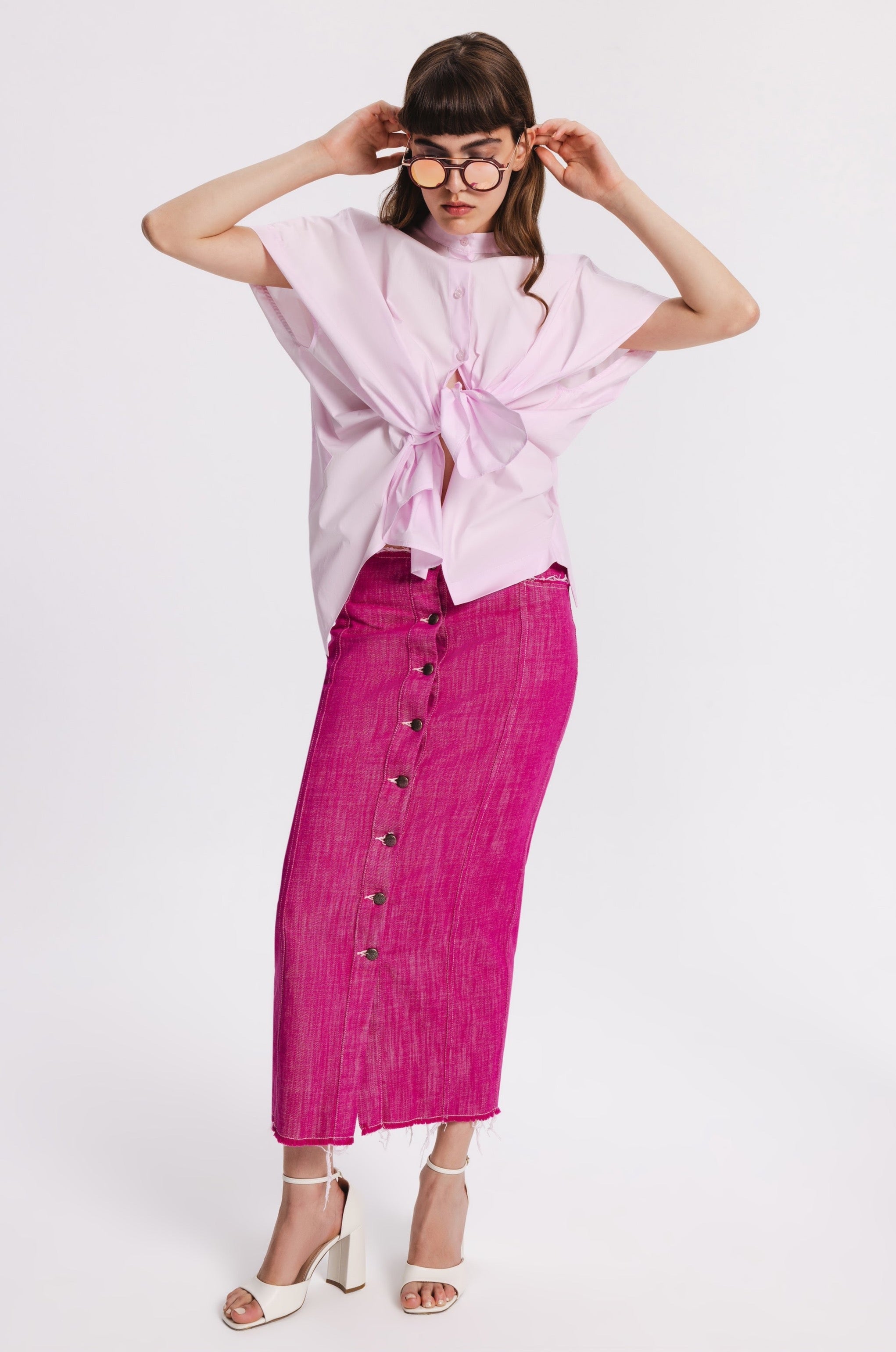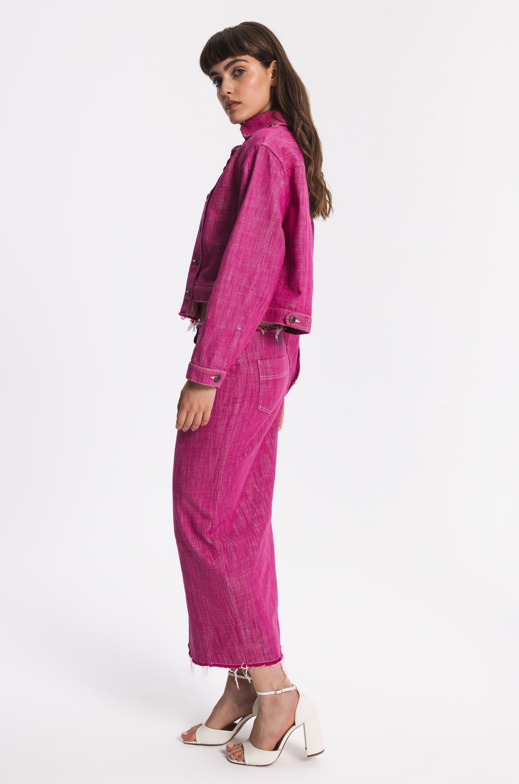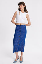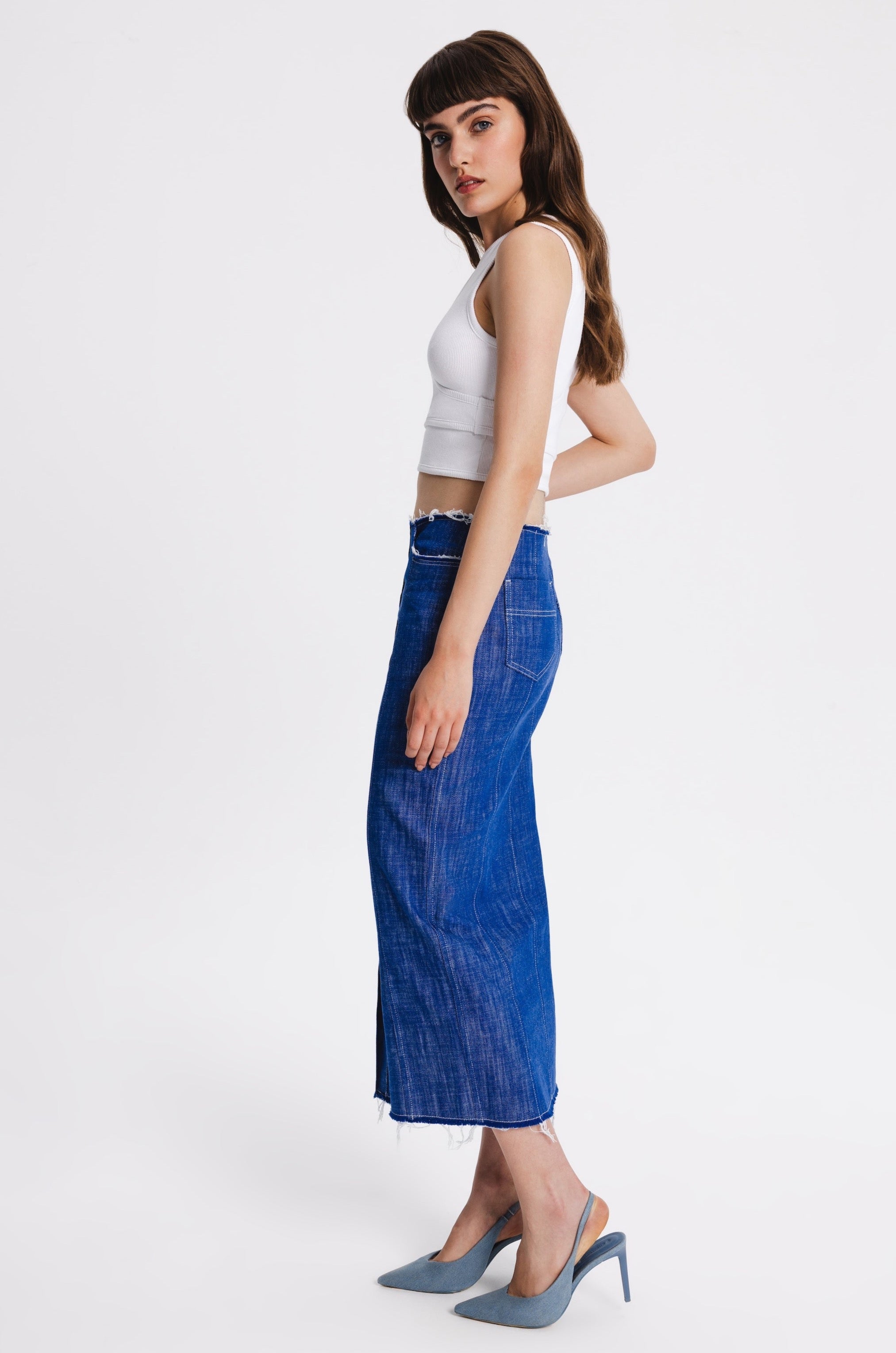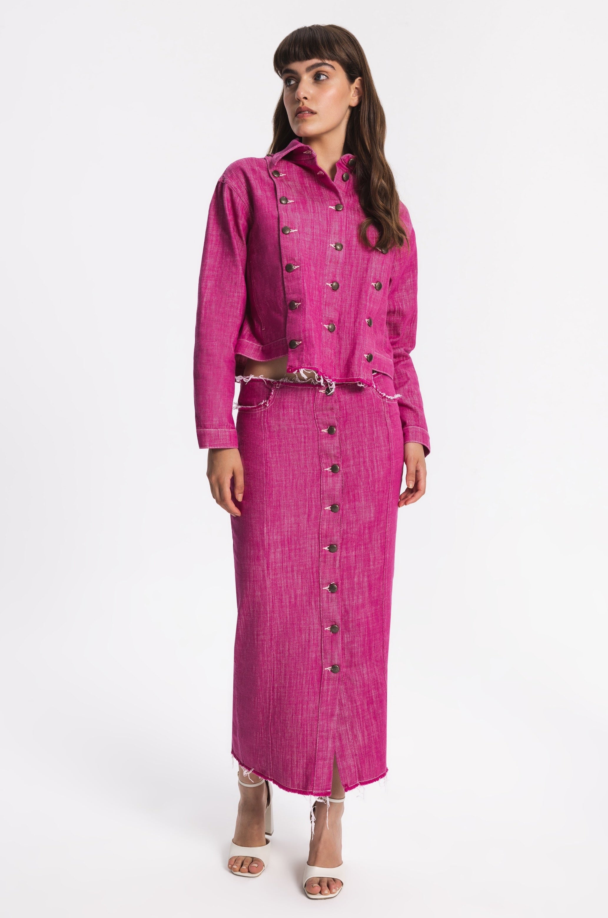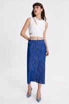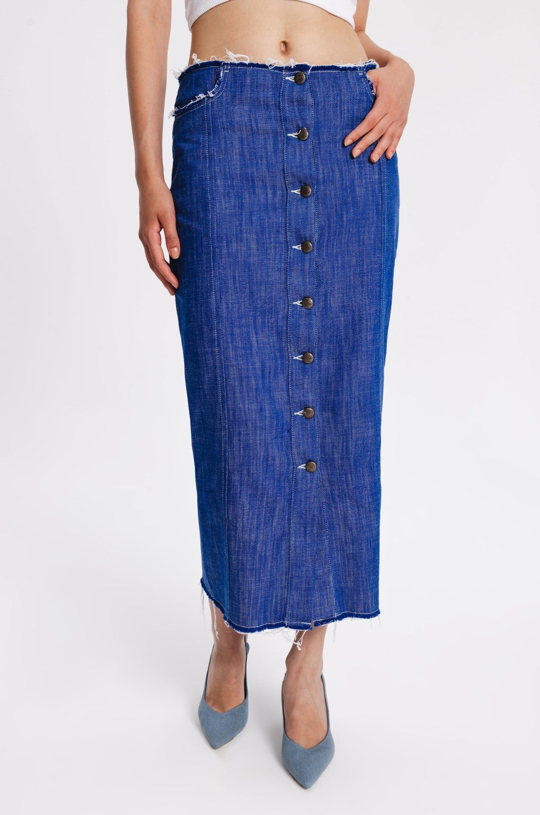Midi straight cut denim skirt with metal front buttoning. Raw edges, two back pockets, two front pockets with raw edges.