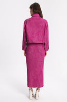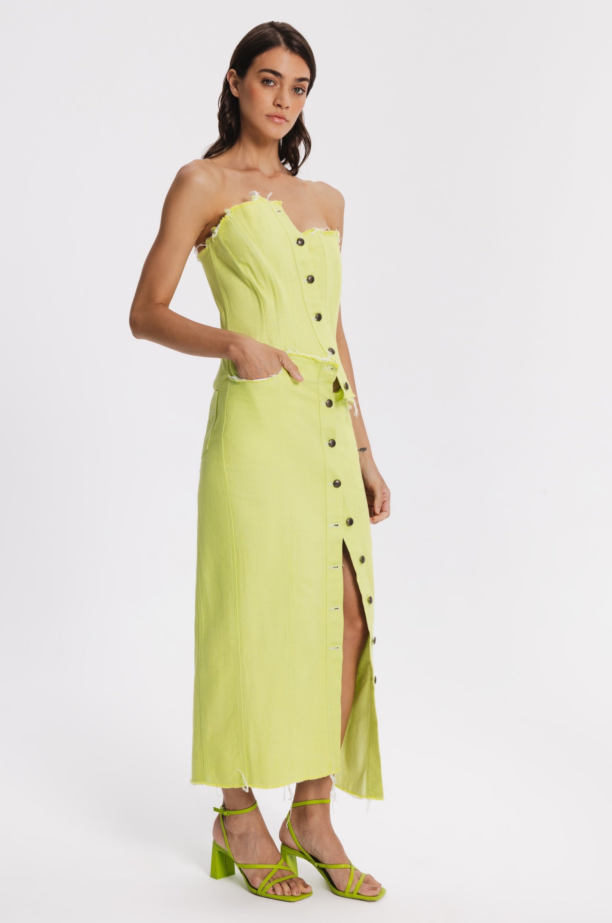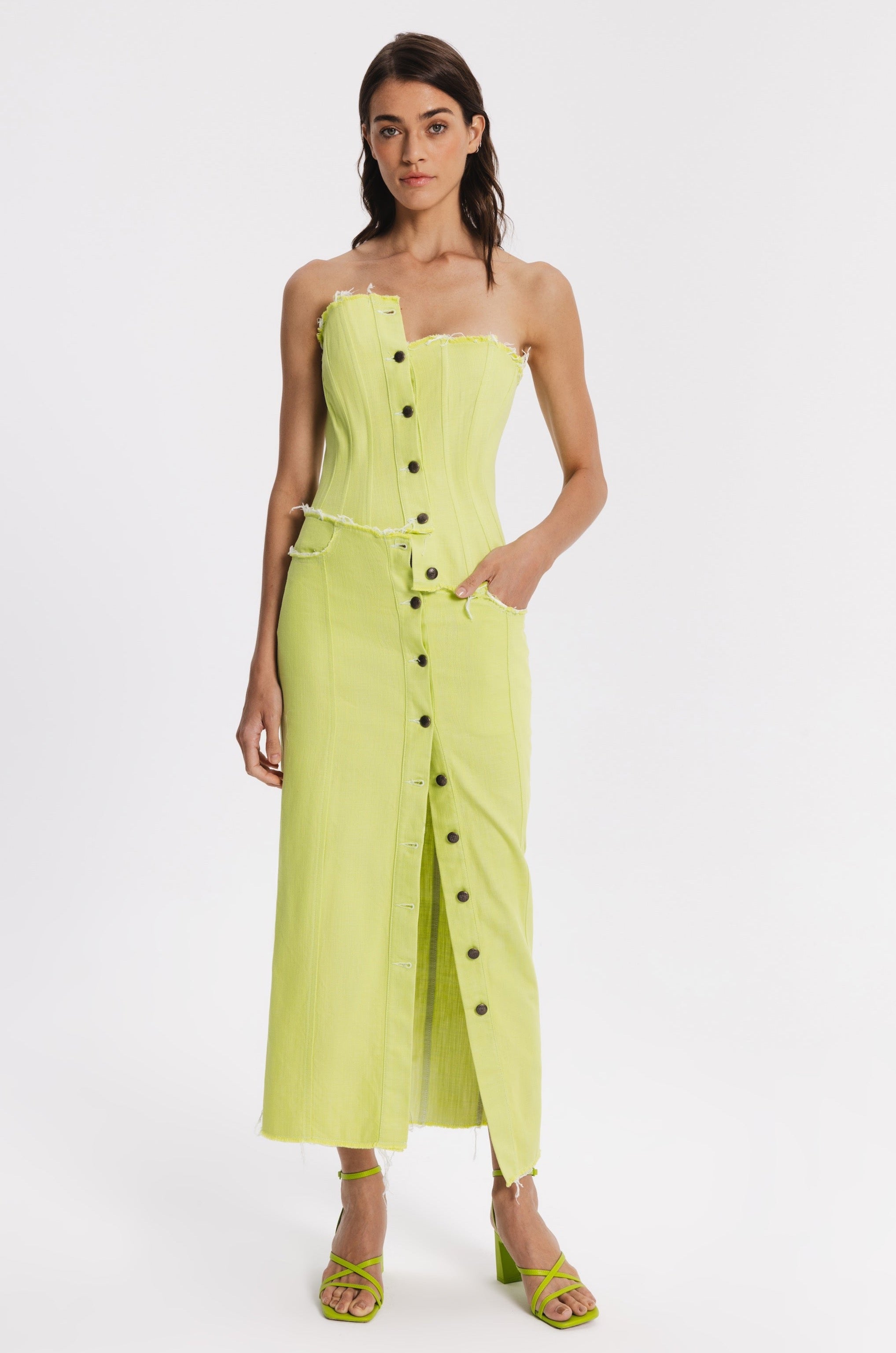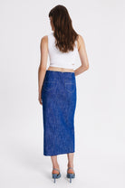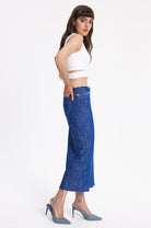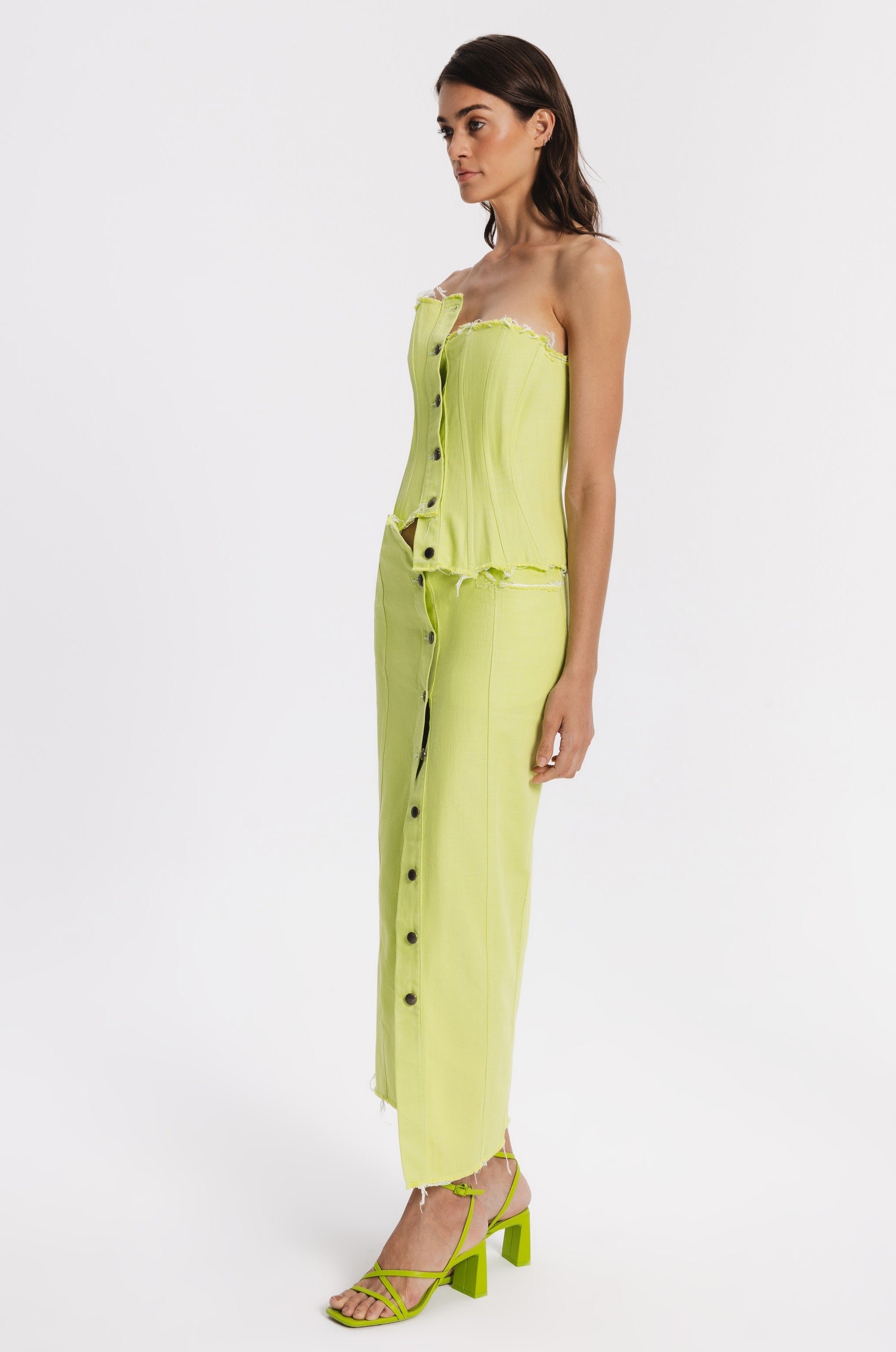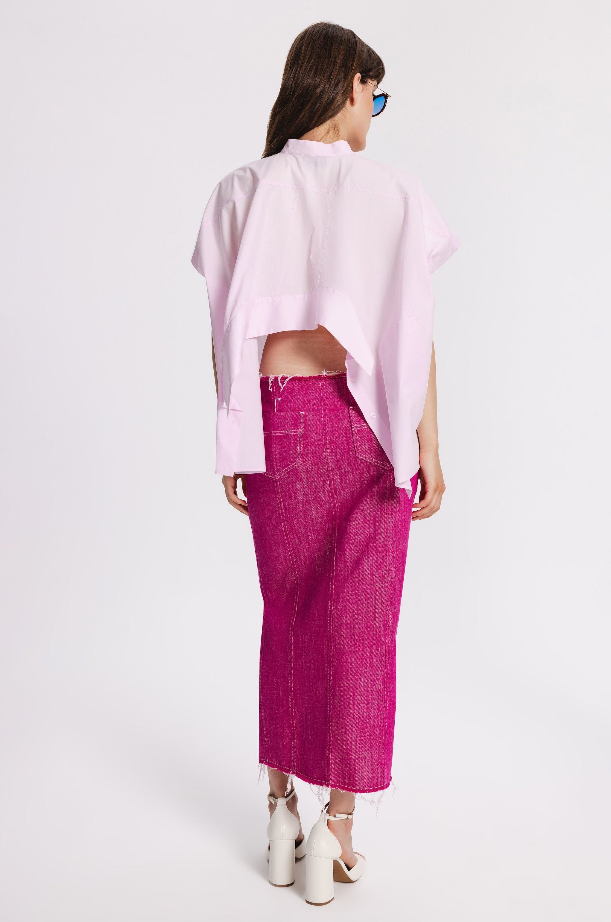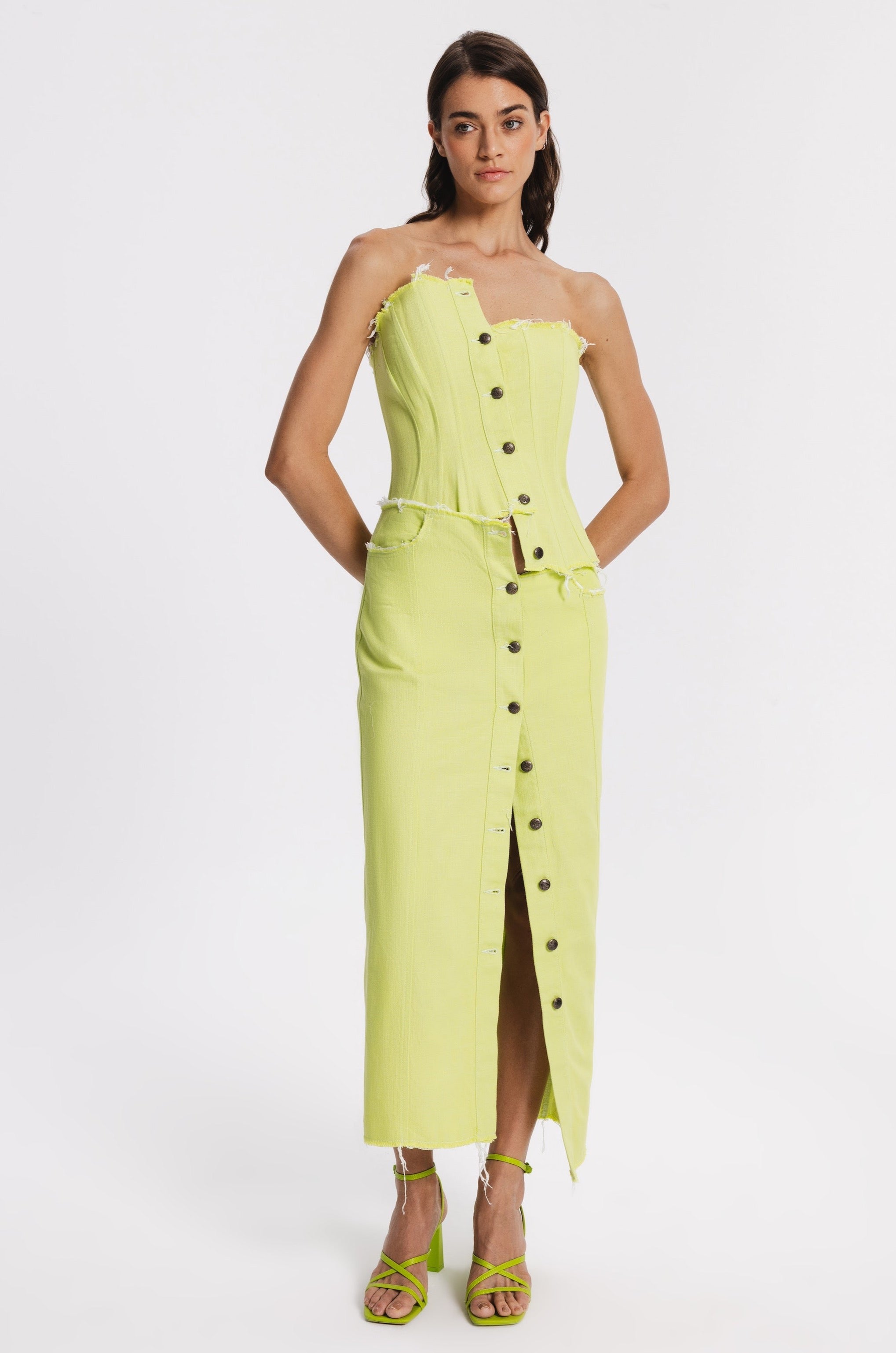 Midi straight cut denim skirt with metal front buttoning. Raw edges, two back pockets, two front pockets with raw edges.