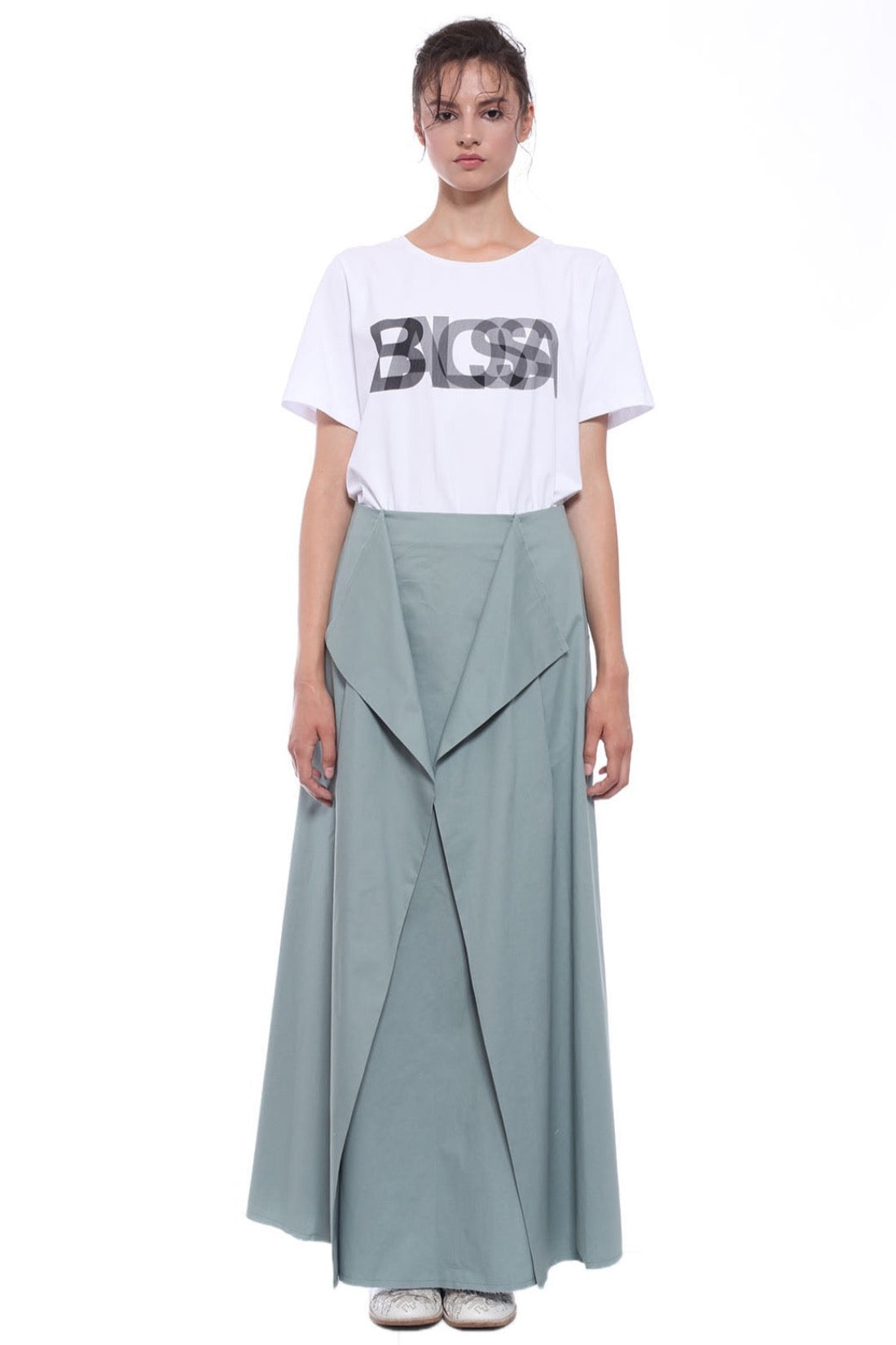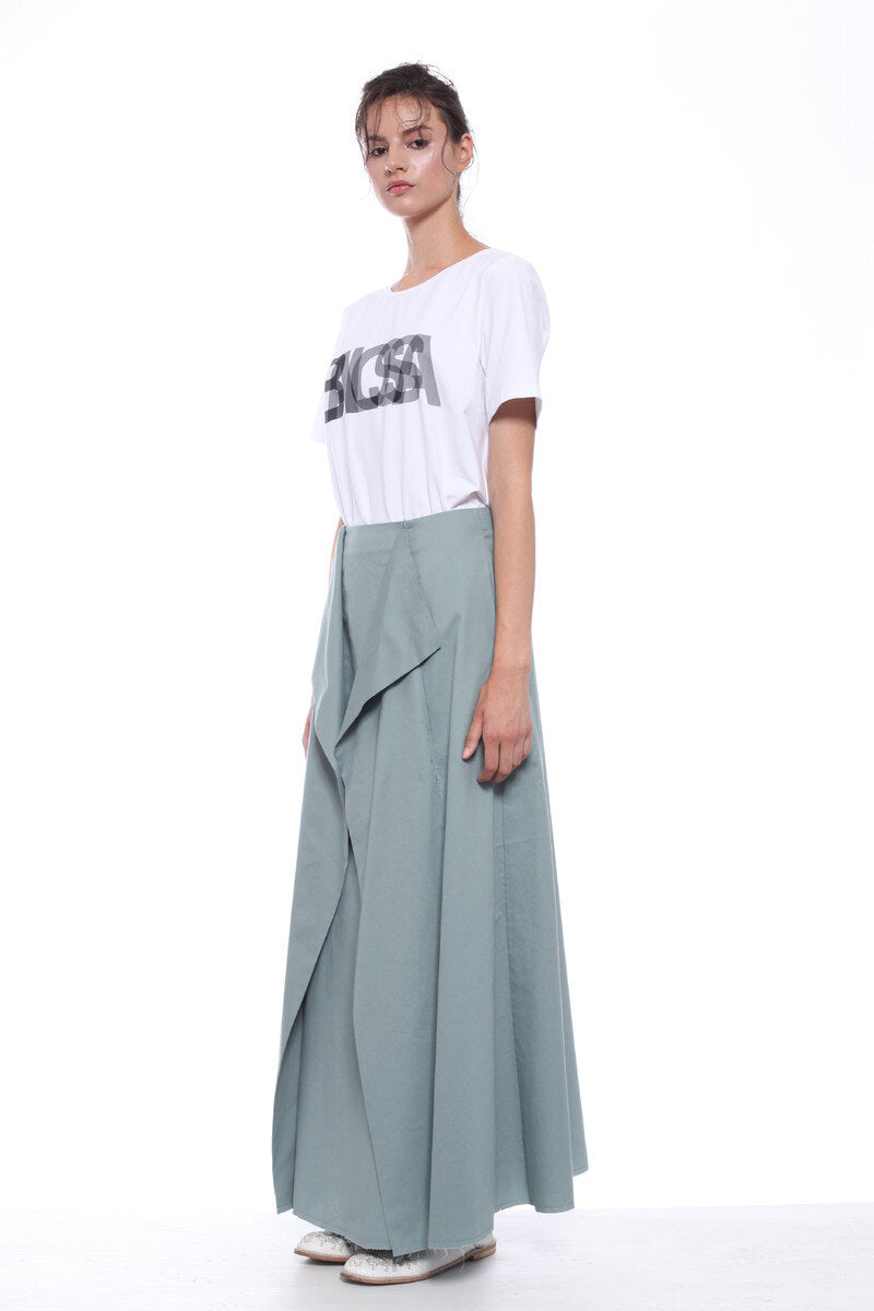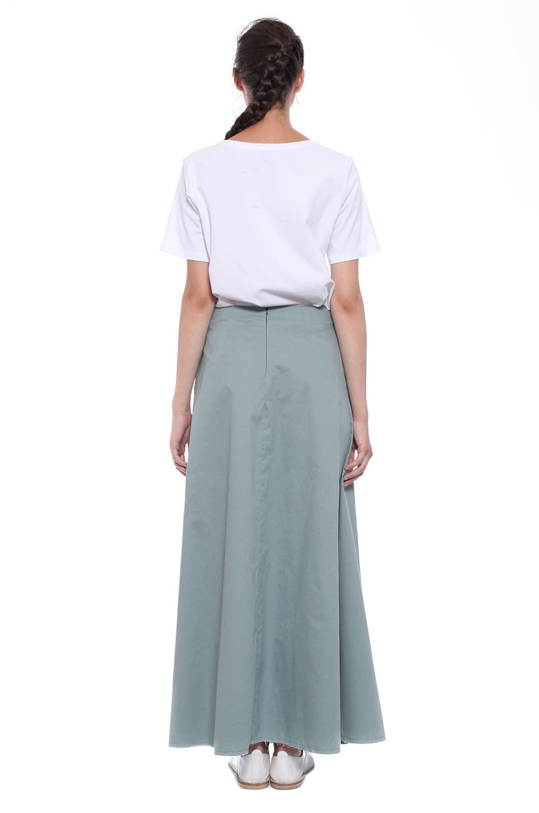 LONG SKIRT WITH TWO FRONTAL SLITS, RAW CUT EDGES AND INVISIBLE ZIP FASTENING ON THE BACK. MADE OF PURE, LIGTHWEIGHT COTTON 'TRENCH' FABRIC.