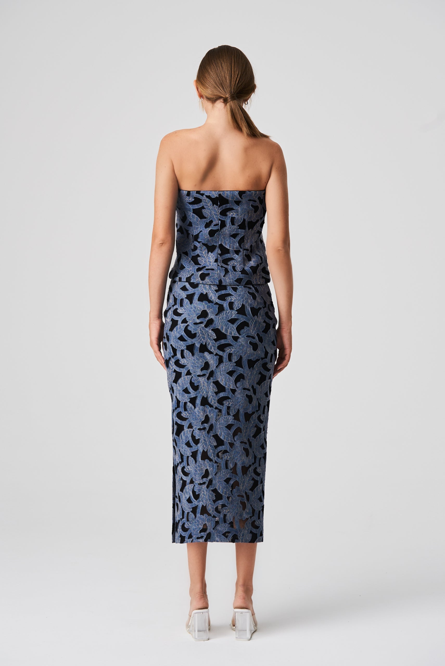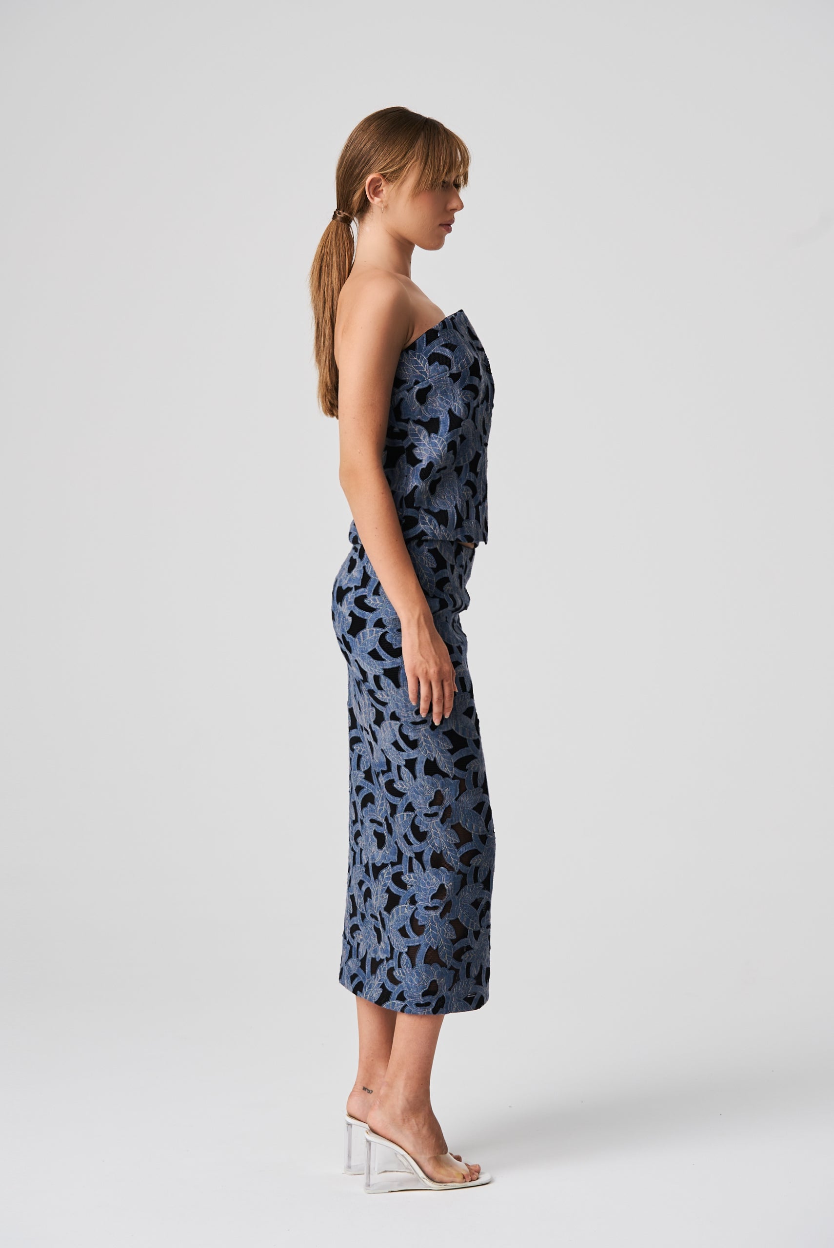Knee-length pencil skirt with a side slit and an invisible zip closure on the right side. Made of denim lace, a stretchy fabric with a draping effect. It pairs perfectly with the LIJA top.
