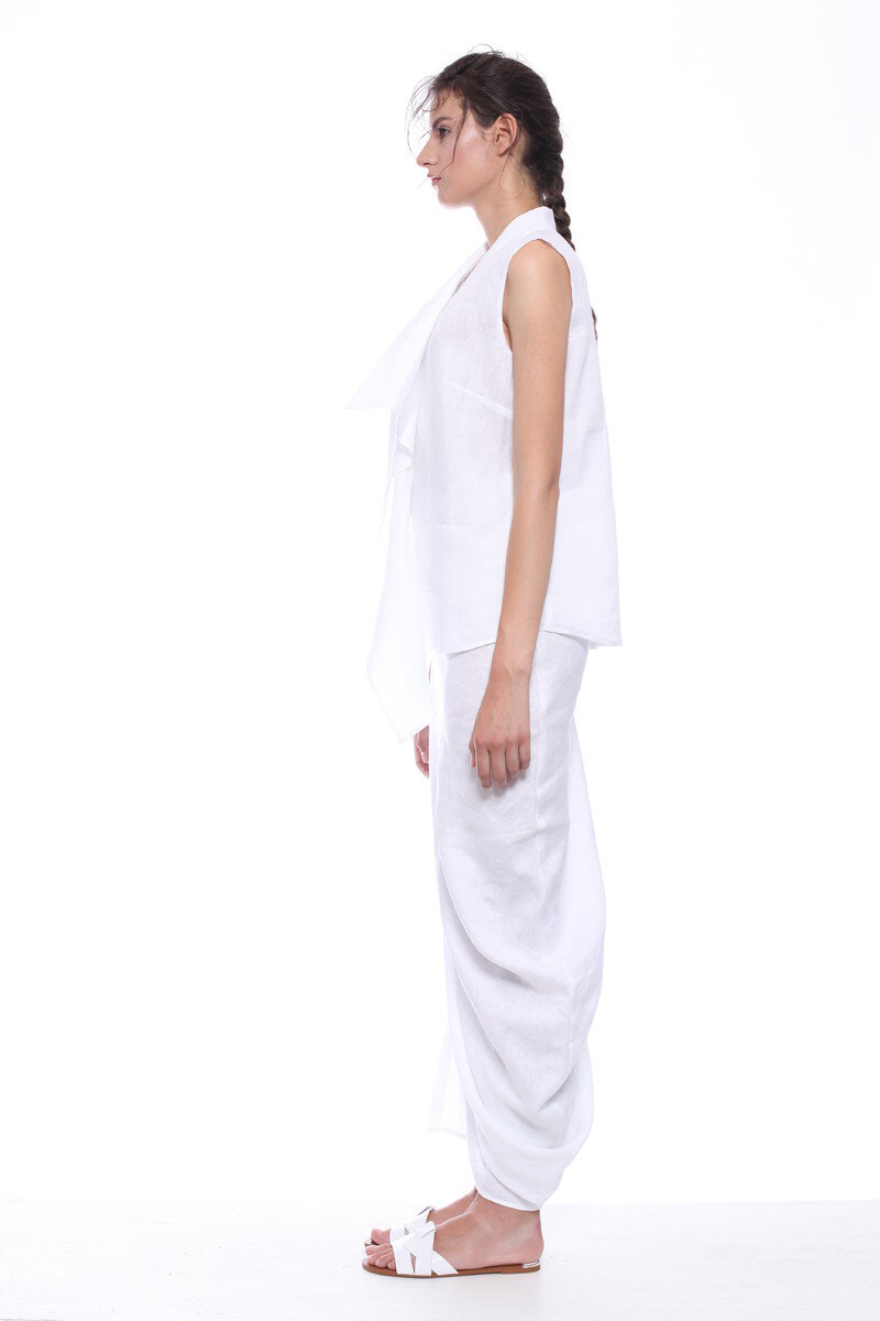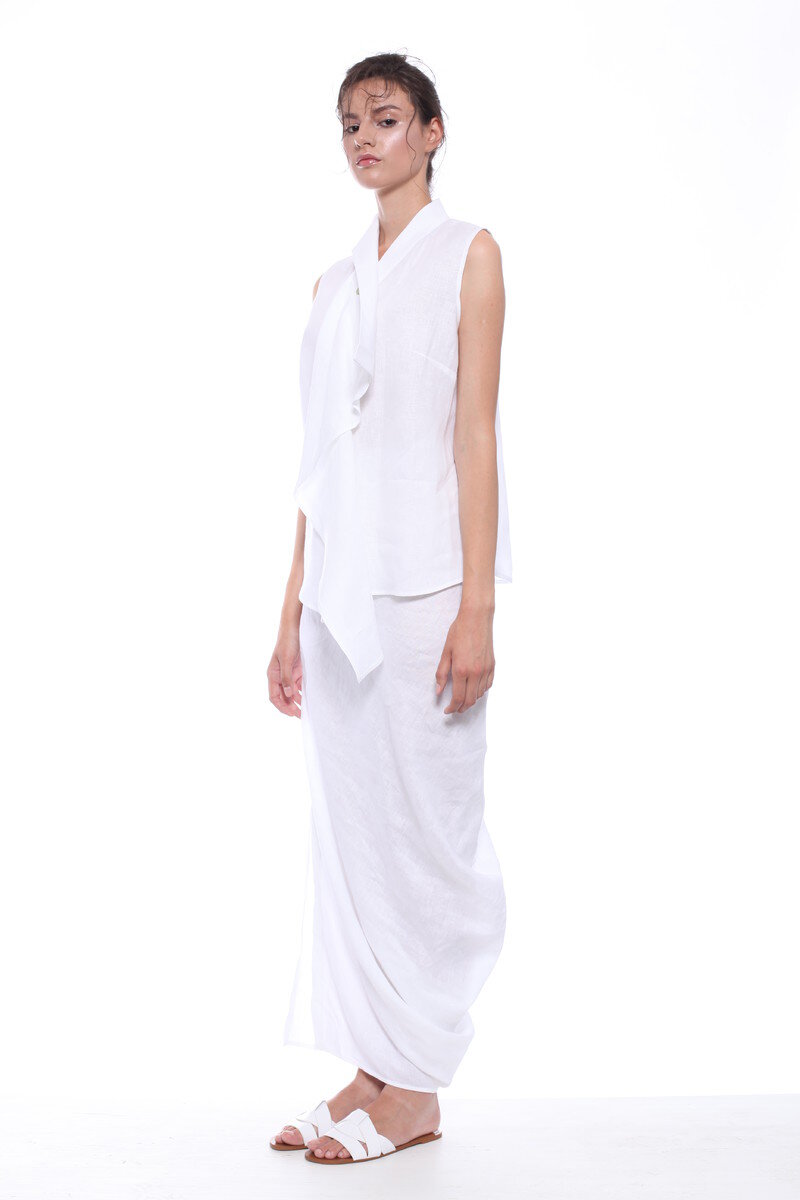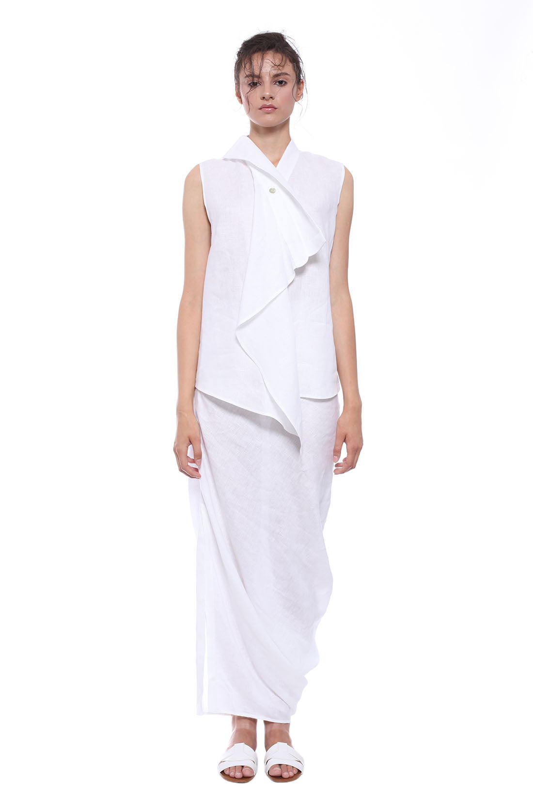 DECONSTRUCTED SLIM FIT SLEEVELESS VEST TOP IN ORGANIC LINEN AND COTTON WITH MOTHER-OF-PEARL BUTTONS.
