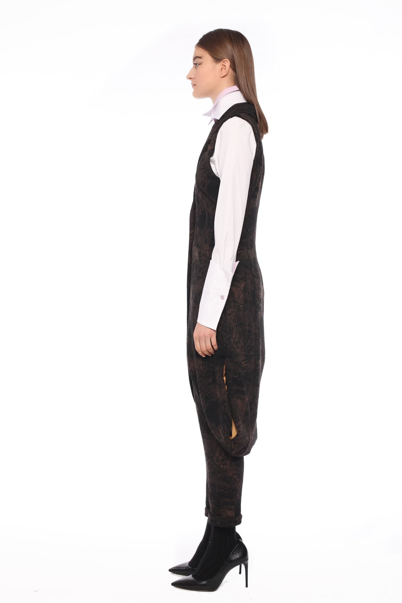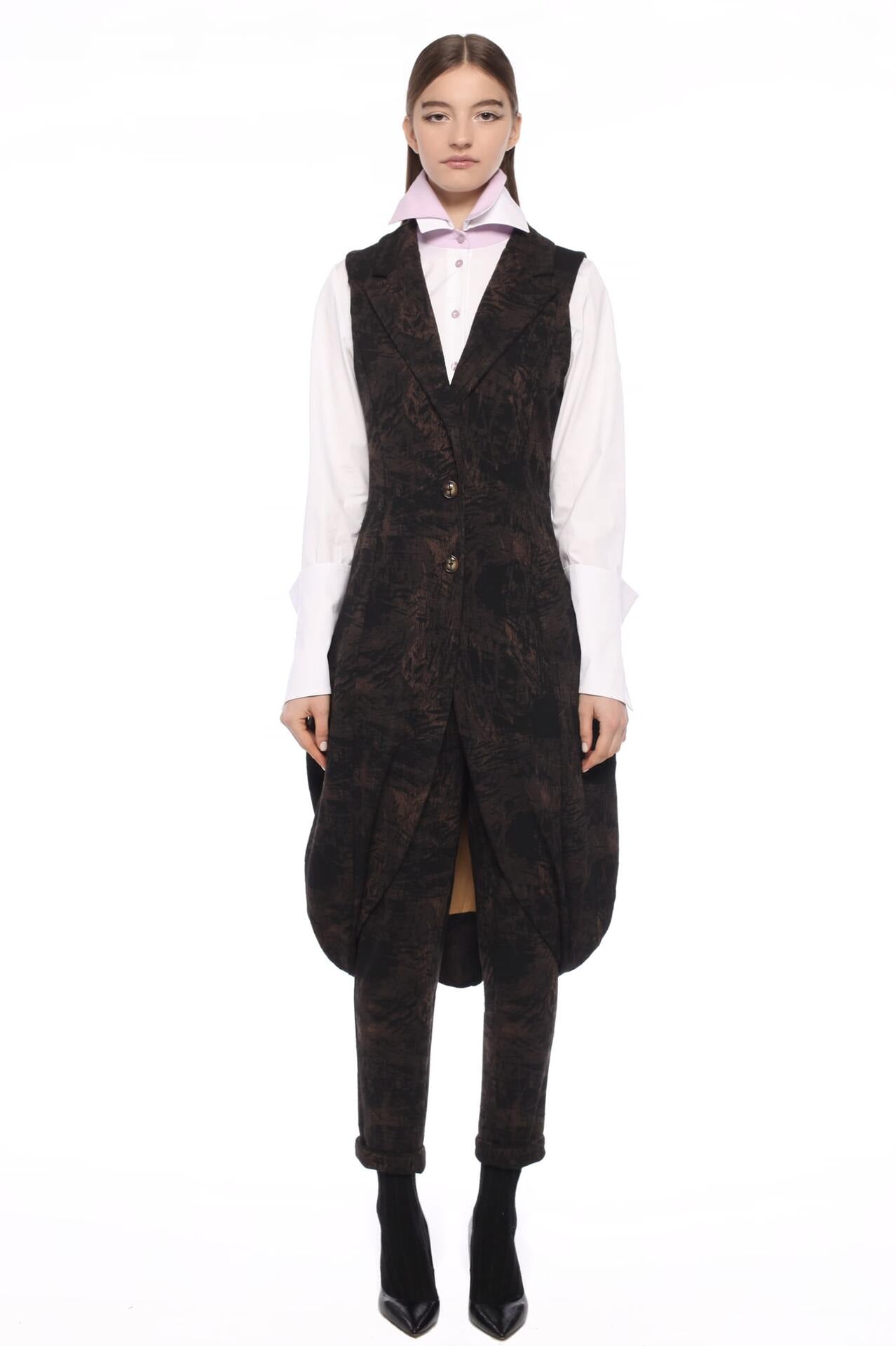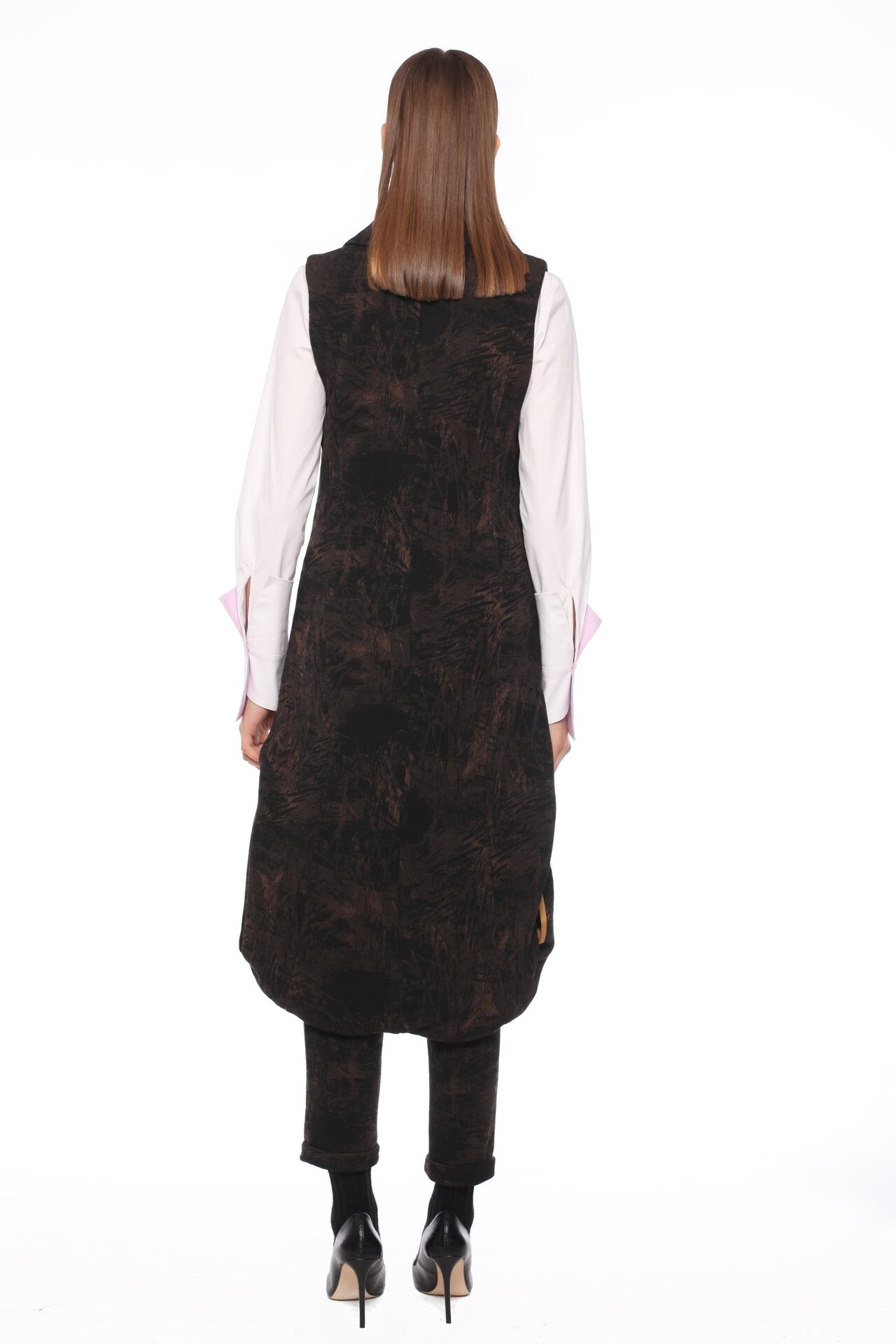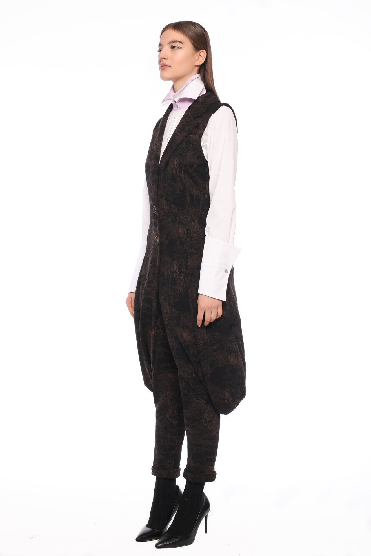 Lined vest made from comfort Jersey, can be worn folded in half as a short version, central front buttoning, lapel collar.