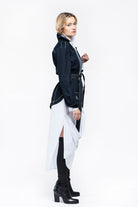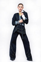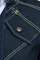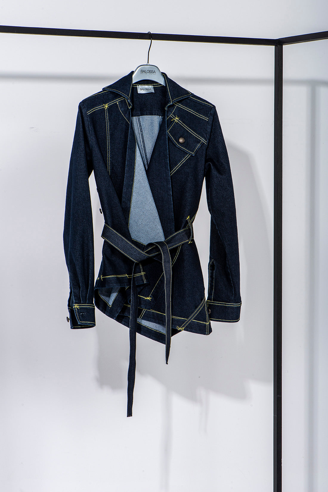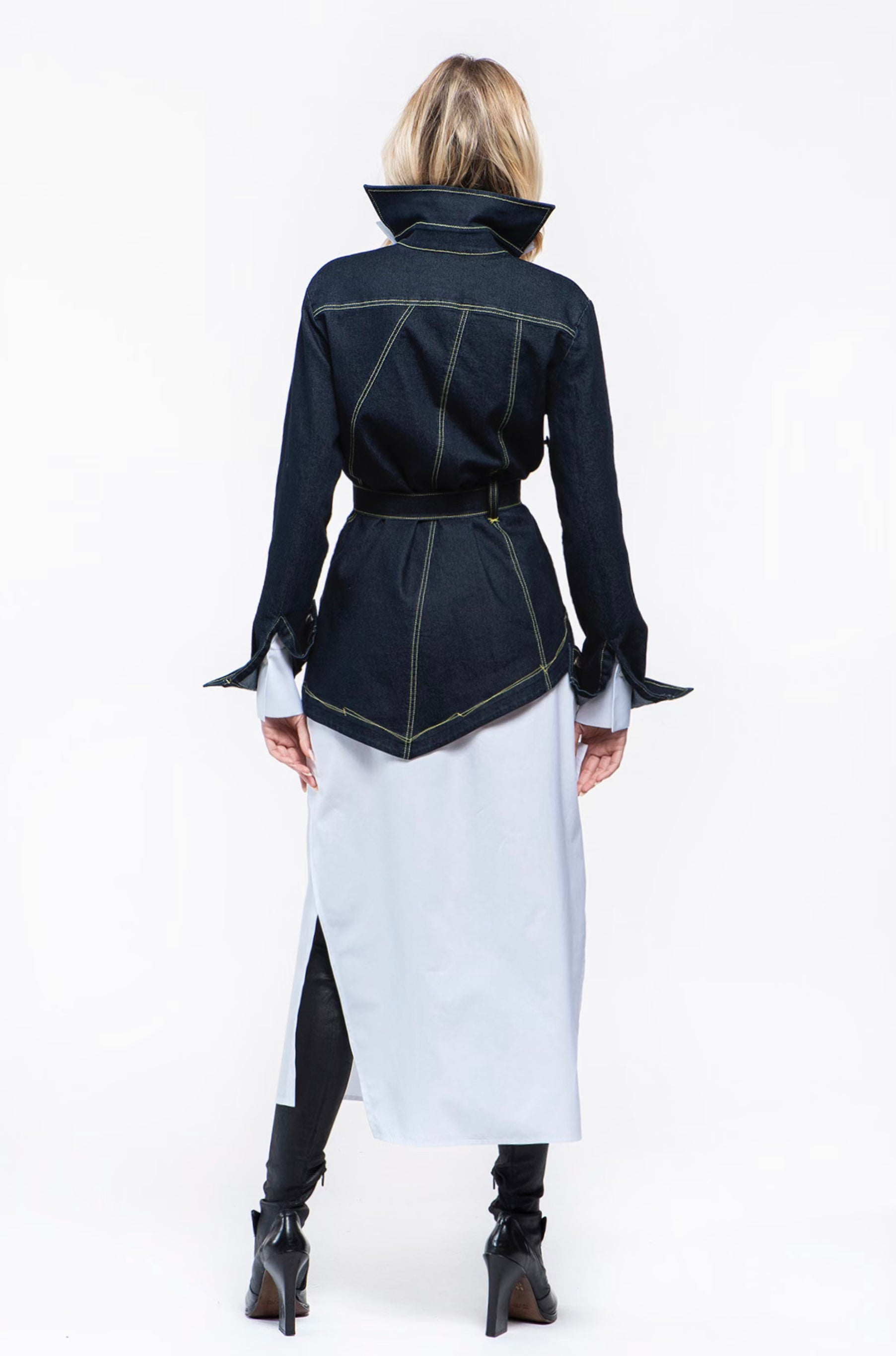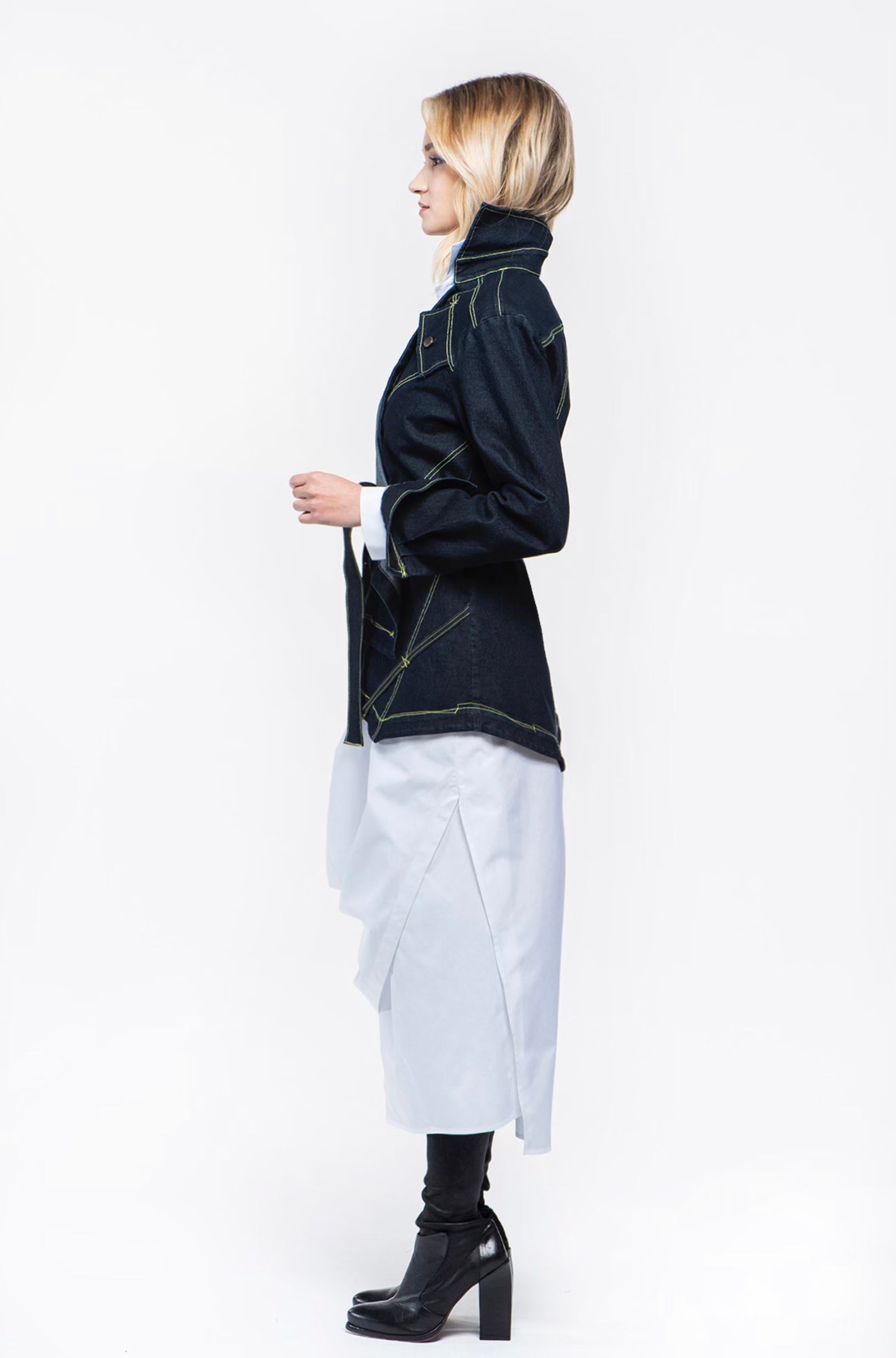 Jacket in stretch denim with a fabric belt, slim fit, features a decorative pocket with a button on the front left side. Frontal overlapping panels with side closure by metal buttons. The hem is asymmetrical. Decorated with contrast stitching abd loops. To complete the outfit combine with the item ELVIS
