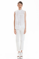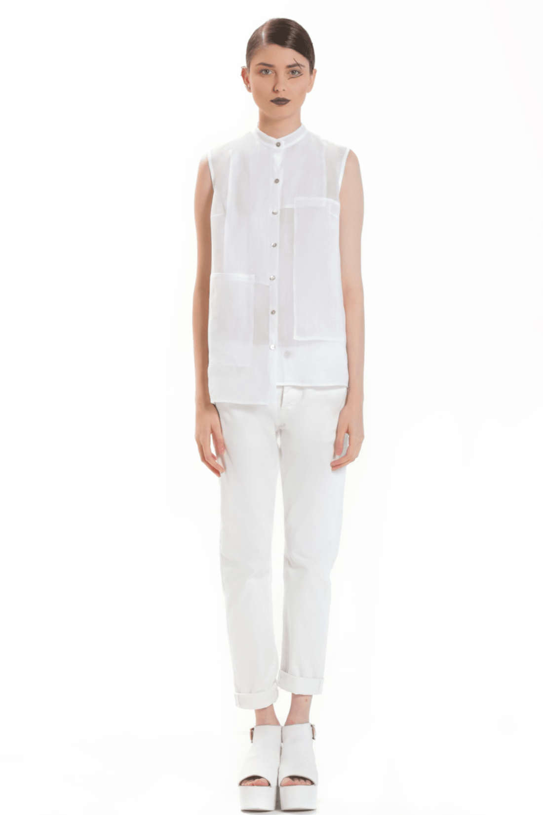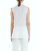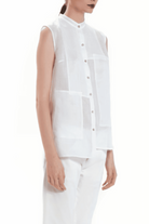 SLEEVELESS SHIRT MADE OF TRANSPARENT RAMIE, WITH OVELAPPING PANELS THAT FORM THE POCKETS. BOTTONS OF MOTHER-OF-PEARL. SUITABLE FOR THE HOOTEST DAYS OF SUMMER TO MATCH WITH A SKIRT OR PANTS.