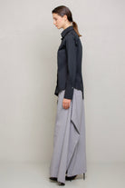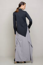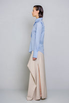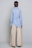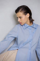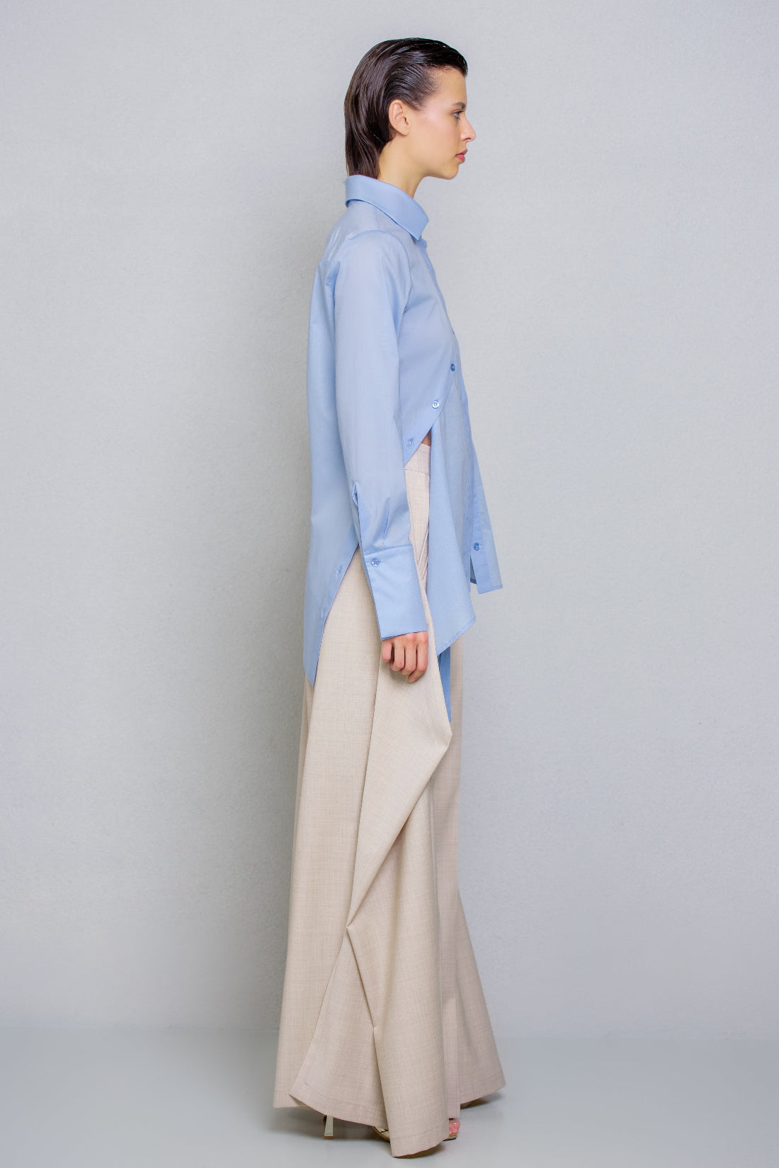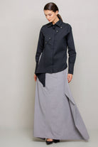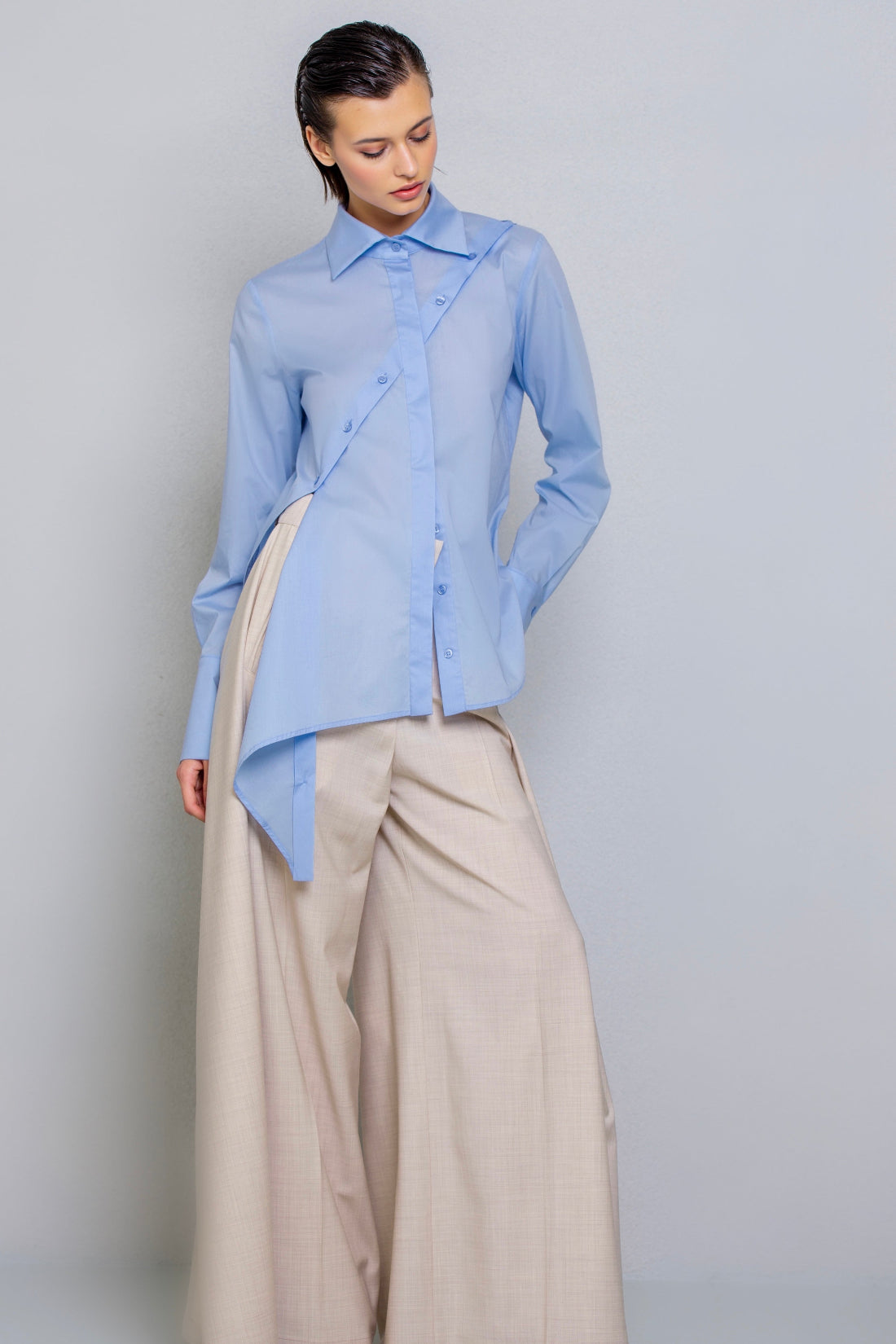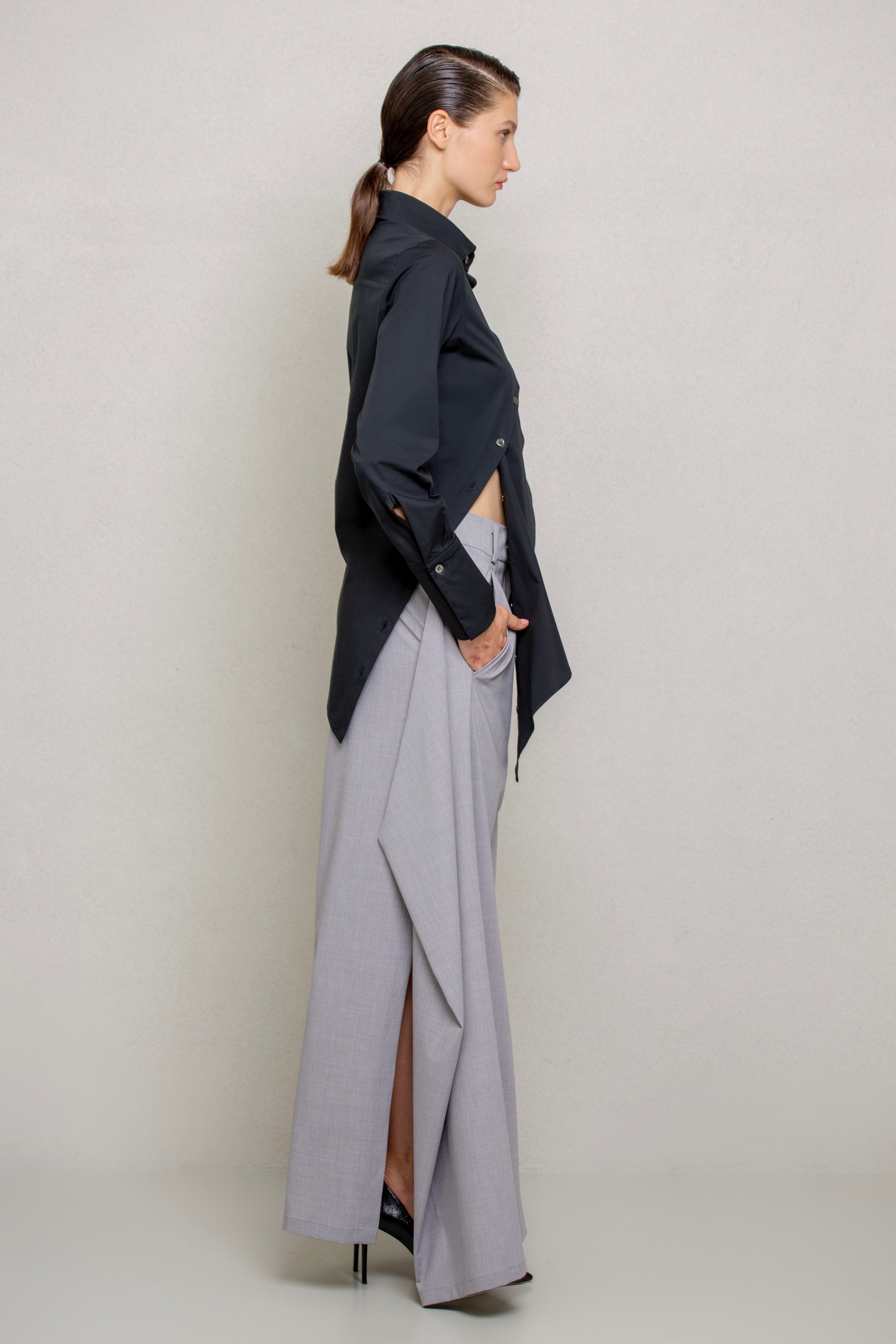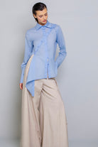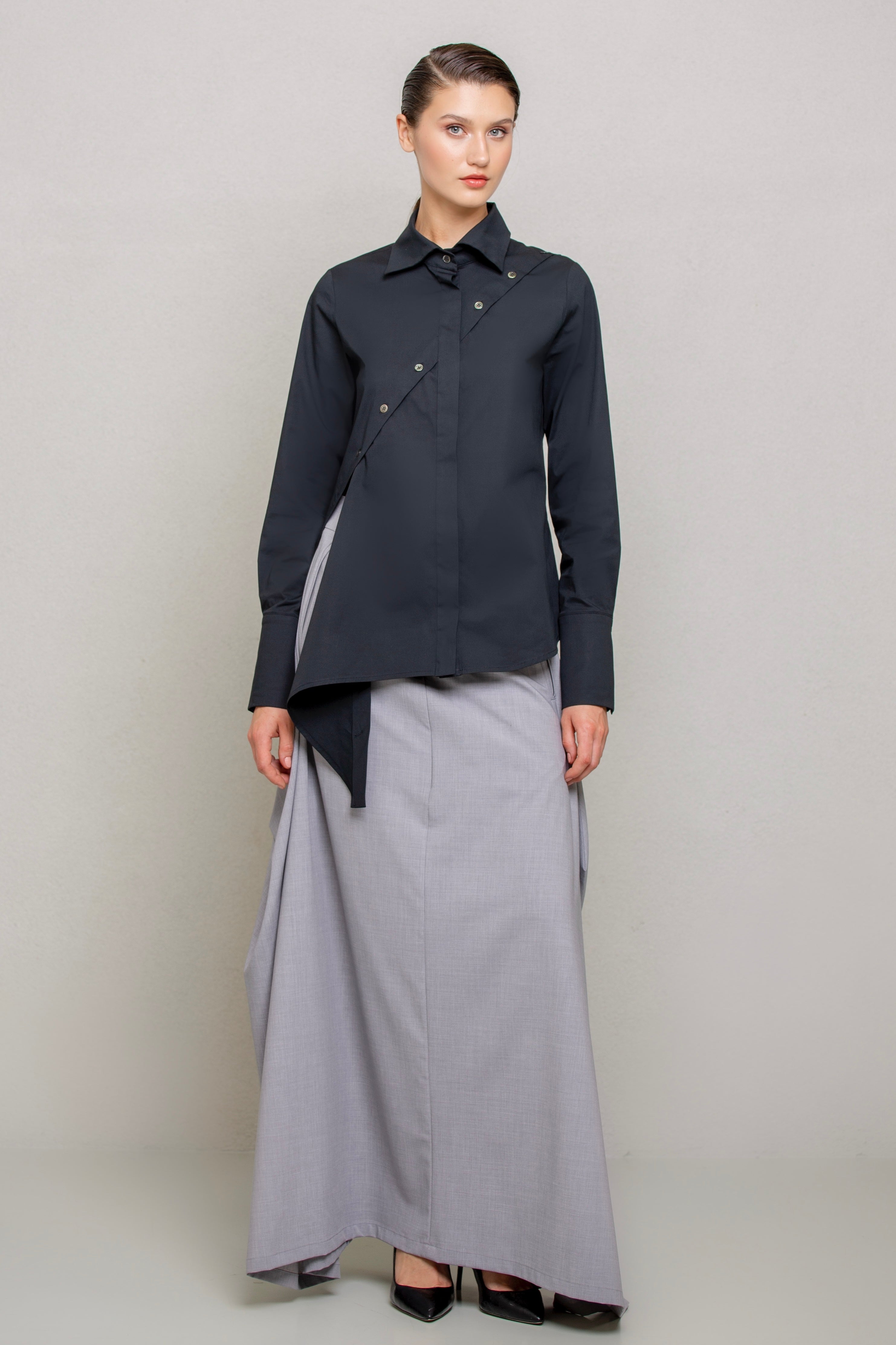 Slim-fit shirt. This design features a distinctive detail: an asymmetrical hem, with the left side extending at a sharp angle compared to the right. The front includes a diagonal cut from the left shoulder to the right hip, fully buttoned along the cut line. This allows the shirt to be customized in different ways, letting you play with the buttons as desired.