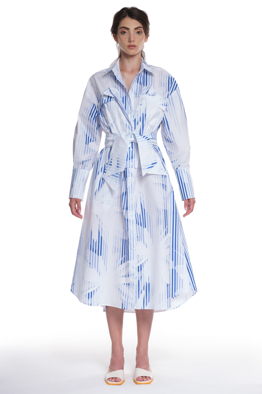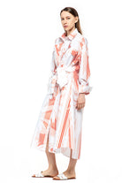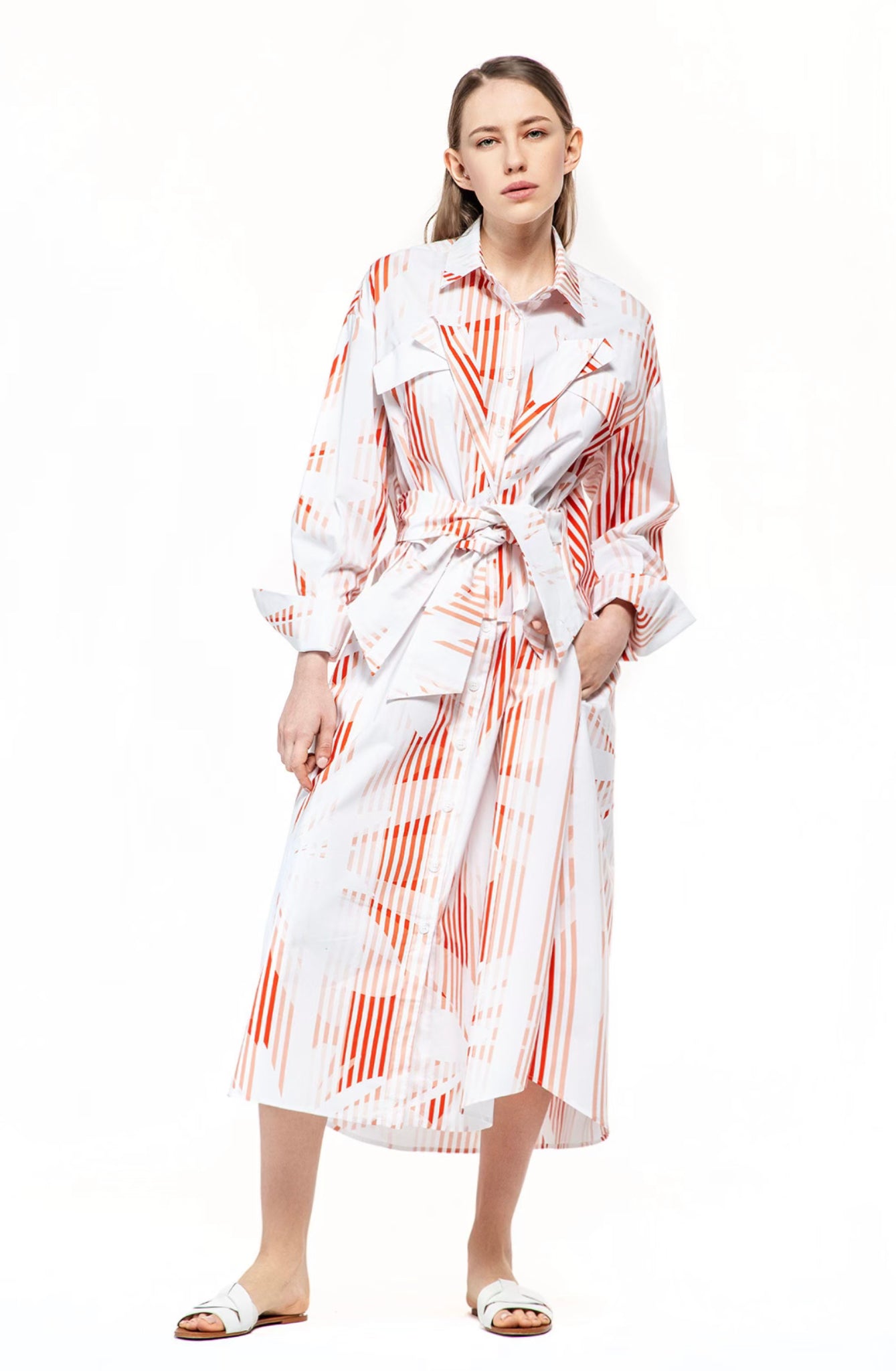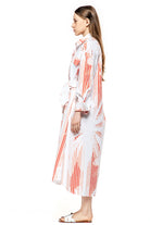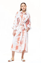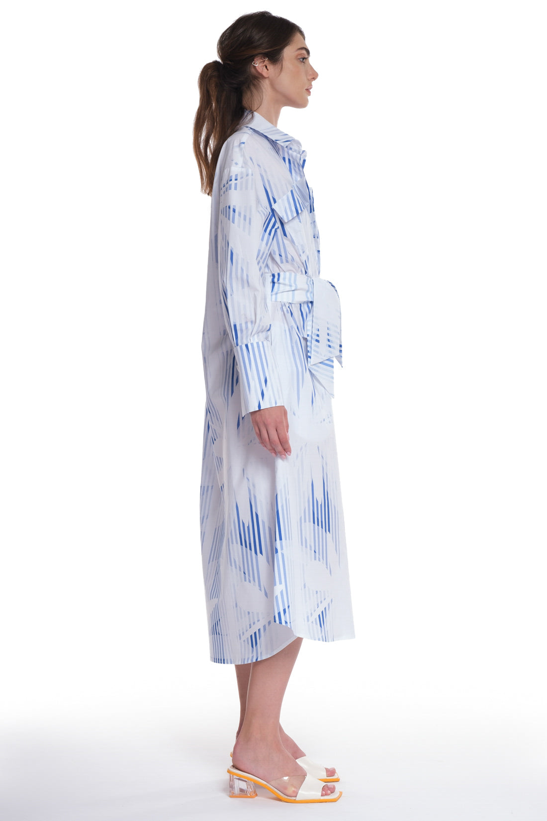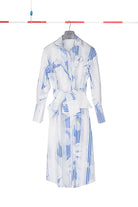 Long print stretch cotton dress with long sleeves and bow application, the belt can be tied at either the front or from behind. Two side pockets.